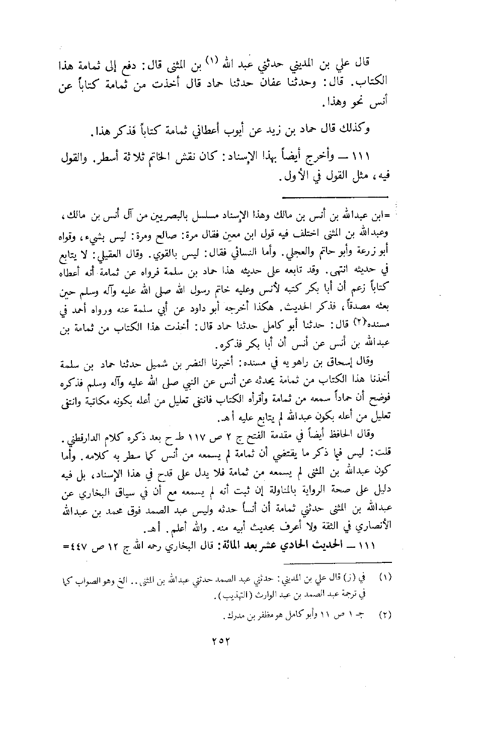 قال علي بن المديني عبد الله بن المثنى قال: دفع إلى ثمامة هذا الكتاب. قال: وحدثنا حماد قال أخذت من ثمامة كتاباً عن أنس نحو وهذا.