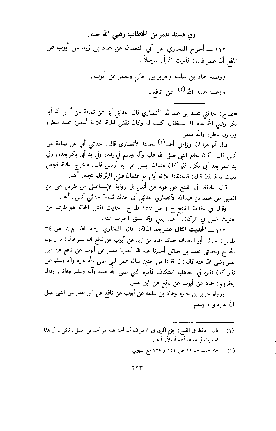 112- أخرج البخاري عن أبي النعمان عن حماد بن زيد عن أيوب عن نافع أن عمر قال: نذرت نذراً. مرسلاً.