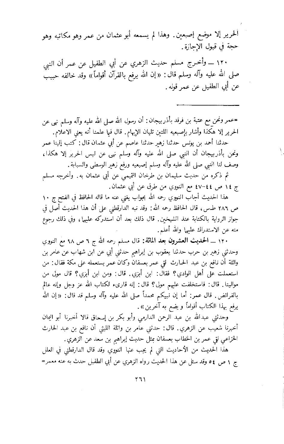 120- وأخرج مسلم حديث الزهري عن أبي الطفيل عن عمر أن النبي (صلى الله عليه وسلم) قال: " إن الله يرفع بالقرآن أقواماً" وقد خالفه حبيب عن أبي الطفيل عن عمر قوله.