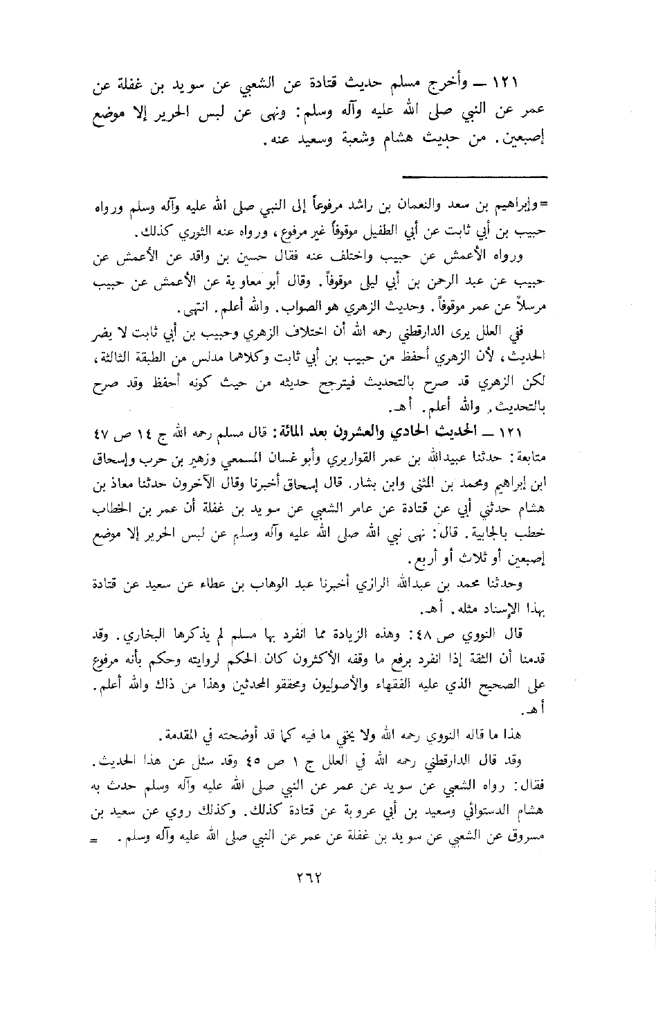 121- وأخرج مسلم حديث قتادة عن الشعبي عن سويد بن غفلة عن عمر عن النبي (صلى الله عليه وسلم) : ونهى عن لبس الحرير إلا موضع إصبعين. من حديث هشام وشعبة وسعيد عنه.