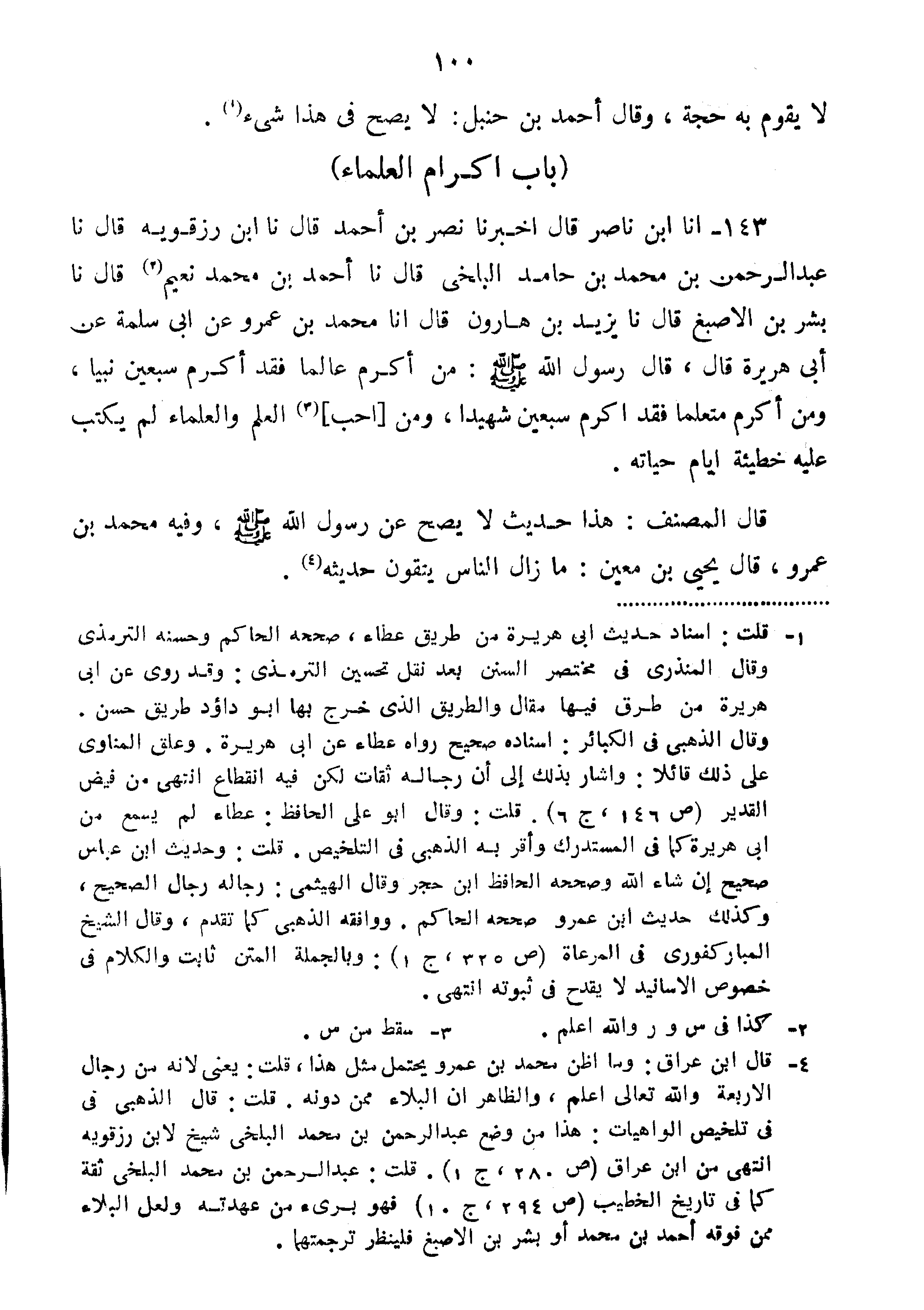 143-أَنَا ابْنُ نَاصِرٍ قَالَ أَخْبَرَنَا نَصْرُ بْنُ أَحْمَدَ قَالَ نا ابْنُ رِزْقَوَيْهِ قَالَ نا عَبْدُ الرَّحْمَنِ بْنُ مُحَمَّدِ بْنِ حَامِدٍ الْبَلْخِيُّ قَالَ نا أَحْمَدُ بن محمد بن نُعَيْمٌ قَالَ نا بِشْرُ بْنُ الأَصْبَغِ قَالَ نا يَزِيدُ بْنُ هَارُونَ قَالَ أَنَا مُحَمَّدُ بْنُ عَمْرٍو عَنْ أَبِي سَلَمَةَ عَنْ أَبِي هُرَيْرَةَ قَالَ: قَالَ رَسُولُ اللَّهِ صَلَّى اللَّهُ عَلَيْهِ وَسَلَّمَ:"مَنْ أَكْرَمَ عَالِمًا فَقَدْ أَكْرَمَ سَبْعِينَ نَبِيًّا وَمَنْ أَكْرَمَ مُتَعَلِّمًا فَقَدْ أَكْرَمَ سَبْعِينَ شَهِيدًا وَمَنْ أَحَبَّ الْعِلْمَ وَالْعُلَمَاءَ لَمْ يُكْتَبْ عَلَيْهِ خَطِيئَةٌ أَيَّامَ حَيَاتِهِ".