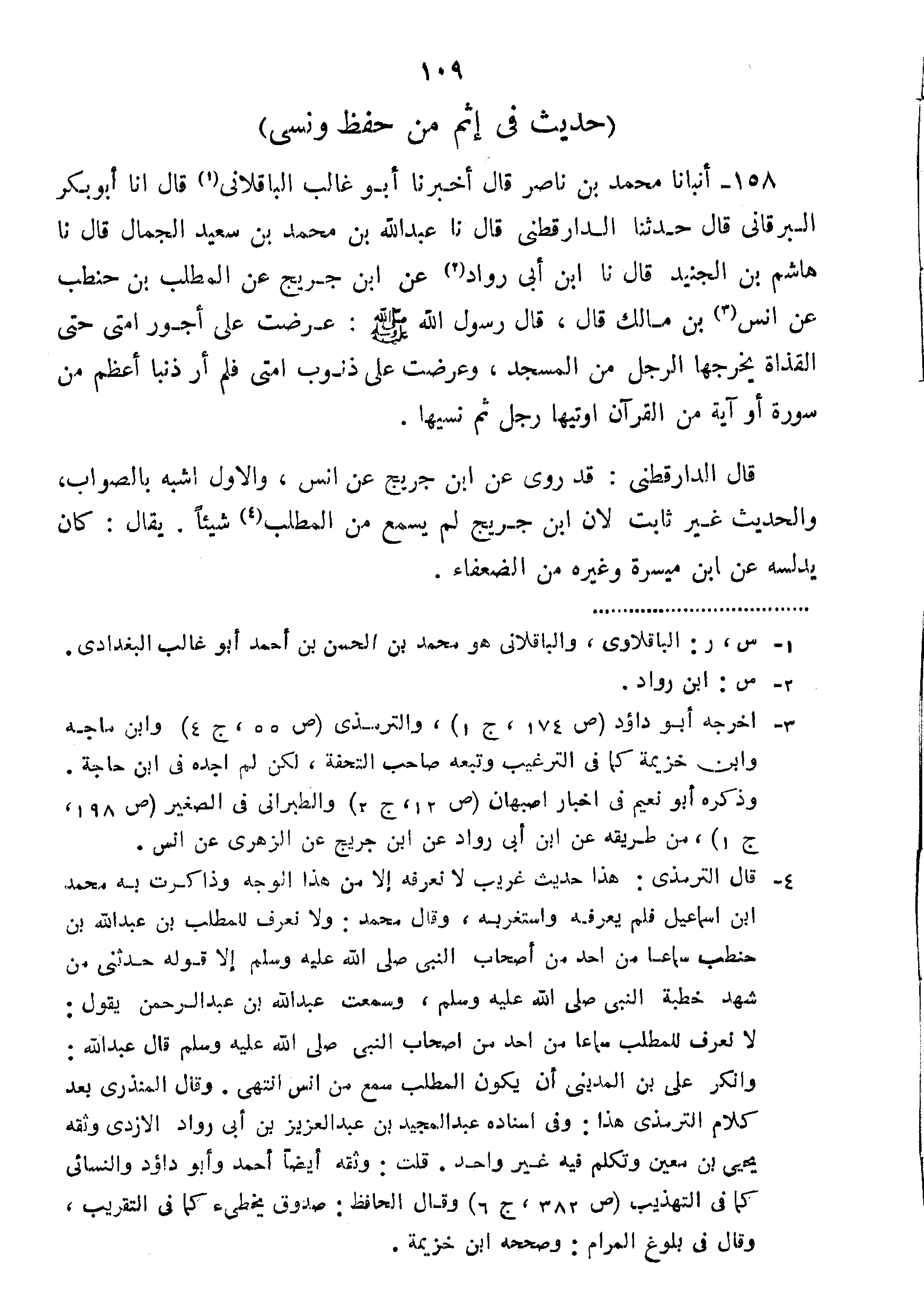 158-أَنْبَأَنَا مُحَمَّدُ بْنُ نَاصِرٍ قَالَ أَخْبَرَنَا أَبُو غَالِبٍ الْبَاقِلَّانِيُّ قَالَ نا أَبُو بَكْرٍ الْبَرْقَانِيُّ قال حدثنا الدارقطني قَالَ نا عَبْدُ اللَّهِ بْنُ مُحَمَّدِ بْنِ سَعِيدٍ الْجَمَّالُ قَالَ نا هَاشِمُ بْنُ الْجُنَيْدِ قَالَ نا ابن أَبِي رَوَادٍ عَنِ ابْنِ جُرَيْجٍ عَنِ الْمُطَّلِبِ بْنِ حَنْطَبٍ عَنْ أَنَسِ بْنِ مَالِكٍ قَالَ: قَالَ رَسُولِ اللَّهِ صَلَّى اللَّهُ عَلَيْهِ وَسَلَّمَ:"عُرِضَتْ عَلَيَّ أُجُورُ أُمَّتِي حتى القذاة يُخْرِجُهَا الرَّجُلُ مِنَ الْمَسْجِدِ وَعُرِضَتْ عَلَيَّ ذُنُوبُ أُمَّتِي فَلَمْ أَرَ ذَنْبًا أَعْظَمَ مِنْ سُورَةٍ أَوْ آيَةٍ مِنَ الْقُرْآنِ أُوتِيَهَا رَجُلٌ ثم نسيها".