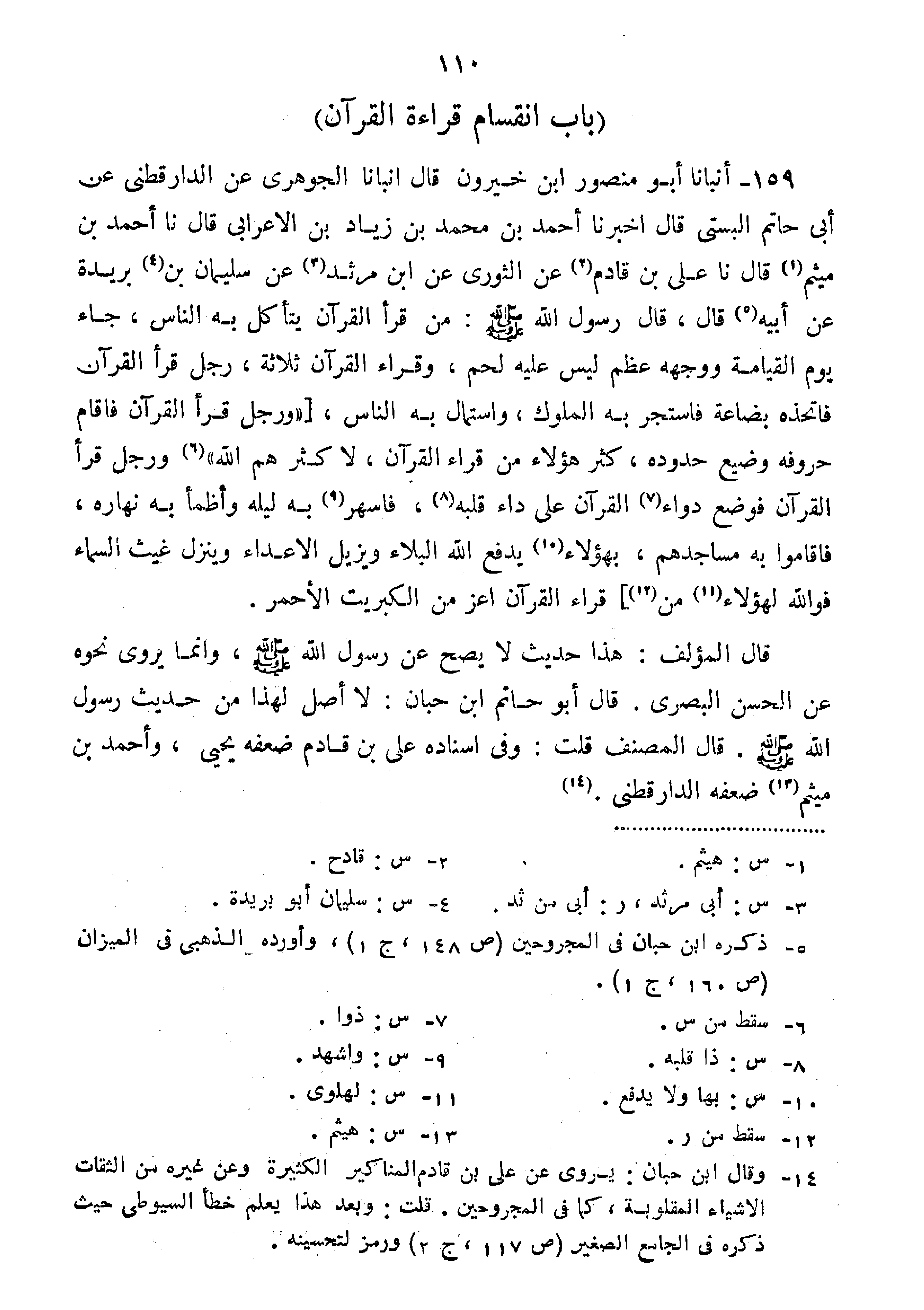 159-أَنْبَأَنَا أَبُو مَنْصُورِ بْنُ خَيْرُونَ قَالَ أنبأنا الجوهري عن الدارقطني عَنْ أَبِي حَاتِمٍ الْبَسْتِيِّ قَالَ أَخْبَرَنَا أَحْمَدُ بْنُ مُحَمَّدِ بْنِ زِيَادِ بْنِ الأَعْرَابِيِّ قَالَ نا أَحْمَدُ بْنُ مِيثَمٍ قَالَ نا عَلِيُّ بْنُ قَادِمٍ عَنِ الثَّوْرِيِّ عَنِ ابْنِ مَرْثَدٍ عَنْ سُلَيْمَانَ بْنِ بُرَيْدَةَ عَنْ أَبِيهِ قَالَ: قَالَ رَسُولُ اللَّهِ صَلَّى اللَّهُ عَلَيْهِ وَسَلَّمَ:"مَنْ قَرَأَ الْقُرْآنَ يَتَأَكَّلُ بِهِ النَّاسَ جَاءَ يَوْمَ الْقِيَامَةِ وَوَجْهُهُ عَظْمٌ لَيْسَ عَلَيْهِ لَحْمٌ وَقُرَّاءُ الْقُرْآنِ ثَلَاثَةٌ رَجُلٌ قَرَأَ الْقُرْآنَ فَاتَّخَذَهُ بِضَاعَةً فَاسْتَجَرَّ بِهِ الْمُلُوكَ وَاسْتَمَالَ بِهِ النَّاسَ وَرَجُلٌ قَرَأَ الْقُرْآنَ فَأَقَامَ حُرُوفَهُ وَضَيَّعَ حُدُودَهُ كَثُرَ هَؤُلَاءِ مِنْ قرأ الْقُرْآنِ لا كَثَّرَهُمُ اللَّهُ وَرَجُلٌ قَرَأَ الْقُرْآنَ فَوَضَعَ دَوَاءَ الْقُرْآنِ عَلَى دَاءِ قَلْبِهِ فَأَسْهَرَ بِهِ لَيْلَهُ وَأَظْمَأَ بِهِ نَهَارَهُ فَأَقَامُوا بِهِ مَسَاجِدَهُ بِهَؤُلاءِ يَدْفَعُ اللَّهُ الْبَلَاءَ وَيُزِيلُ الأَعْدَاءَ وَيُنْزِلُ غَيْثَ السماء فوالله لهؤلاء من قرأ الْقُرْآنِ أَعَزُّ مِنَ الْكِبْرِيتِ الأَحْمَرِ".