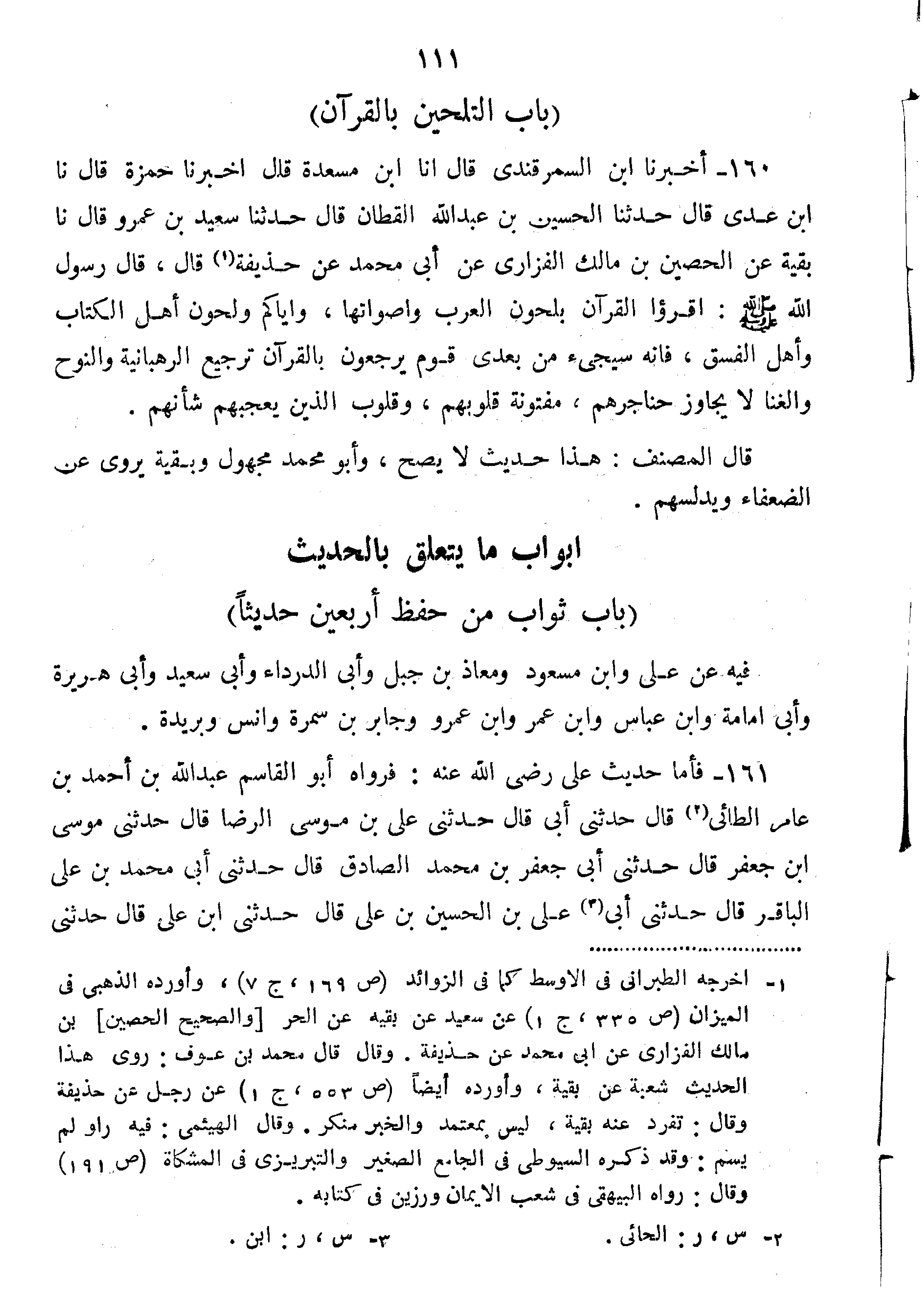 160-أَخْبَرَنَا ابْنُ السَمَرْقَنْدِيِّ قَالَ أَنَا ابْنُ مَسْعَدَةَ قَالَ أَخْبَرَنَا حَمْزَةُ قَالَ نا ابْنُ عَدِيٍّ قَالَ حَدَّثَنَا الْحُسَيْنُ بْنِ عَبْدِ اللَّهِ الْقَطَّانُ قَالَ حَدَّثَنَا سَعِيدُ بْنُ عَمْرٍو قَالَ نا بَقِيَّةُ عَنِ الْحُصَيْنِ بْنِ مَالِكٍ الْفِزَارِيِّ عَنْ أَبِي مُحَمَّدٍ عَنْ حُذَيْفَةَ قَالَ: قَالَ رَسُولُ اللَّهِ صَلَّى اللَّهُ عَلَيْهِ وَسَلَّمَ:"اقْرَءُوا الْقُرْآنَ بِلُحُونِ الْعَرَبِ وَأَصْوَاتِهَا وَإِيَّاكُمْ وَلُحُونِ أَهْلِ الْكِتَابِ وَأَهْلِ الْفِسْقِ فَإِنَّهُ سَيَجِيءُ مِنْ بَعْدِي قَوْمٌ يُرَجِّعُونَ بِالْقُرْآنِ تَرْجِيعَ الرَّهْبَانِيَّةِ وَالنَّوْحُ وَالْغِنَاءُ لا يُجَاوِزُ حَنَاجِرَهُمْ مَفْتُونَةٌ قُلُوبُهُمْ وَقُلُوبُ الَّذِينَ يُعْجِبُهُمْ شَأْنُهُمْ."