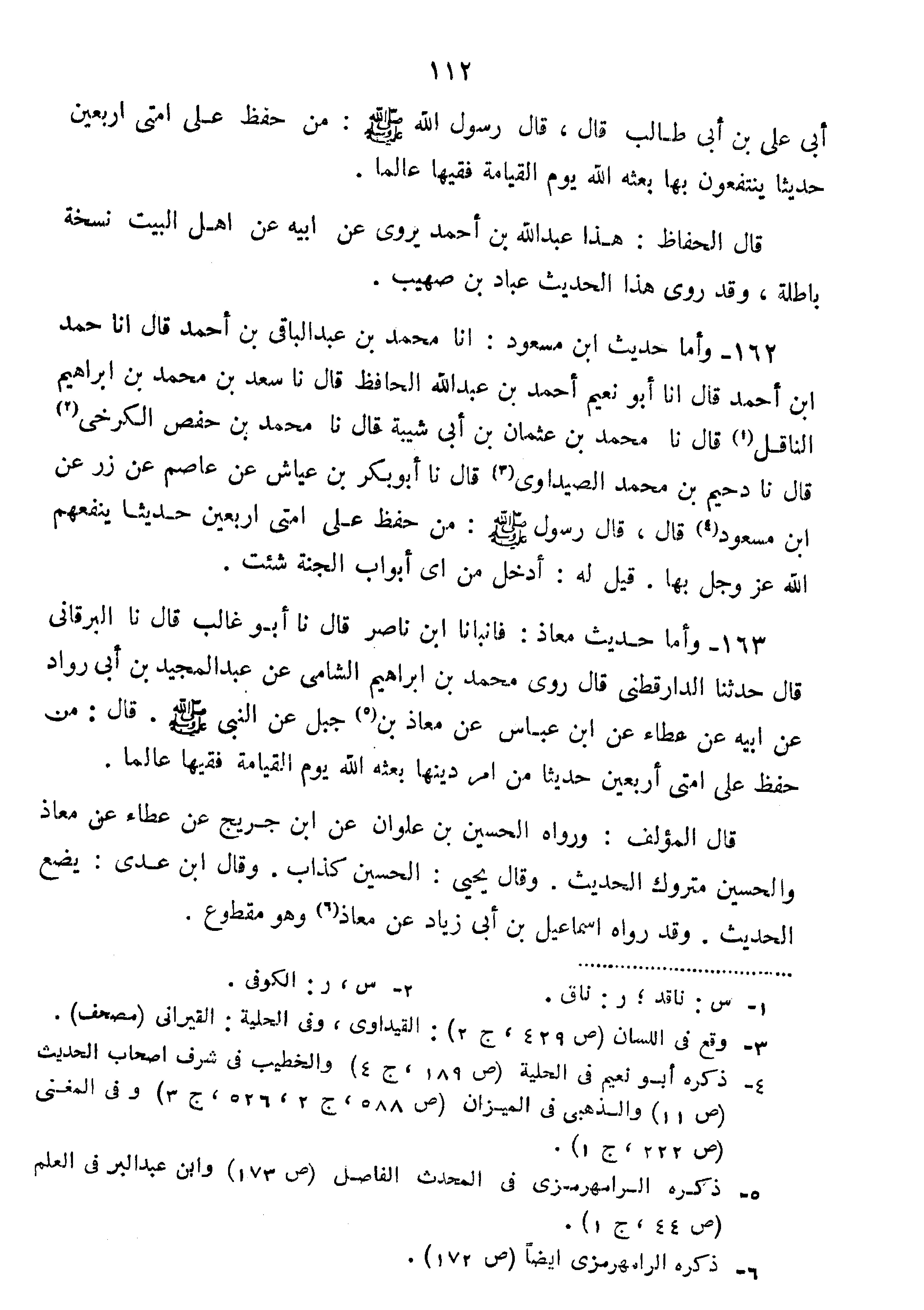 163-وَأَمَّا حَدِيثُ مُعَاذٍ فَأَنْبَأَنَا ابْنُ نَاصِرٍ قَالَ نا أَبُو غَالِبٍ قَالَ نا الْبَرْقَانِيُّ قال حدثنا الدارقطني قَالَ رَوَى مُحَمَّدُ بْنُ إِبْرَاهِيمَ الشَّامِيُّ عَنْ عَبْدِ الْمَجِيدِ بْنِ أَبِي رَوَّادٍ عَنْ أَبِيهِ عَنْ عَطَاءٍ عَنِ ابْنِ عَبَّاسٍ عَنْ مُعَاذِ بْنِ جَبَلٍ عَنِ النَّبِيِّ صَلَّى اللَّهُ عَلَيْهِ وَسَلَّمَ قَالَ:" مَنْ حَفِظَ عَلَى أُمَّتِي أَرْبَعِينَ حَدِيثًا مِنْ أَمْرِ دِينِهَا بَعَثَهُ اللَّهُ يَوْمَ الْقِيَامَةِ فَقِيهًا عَالِمًا".