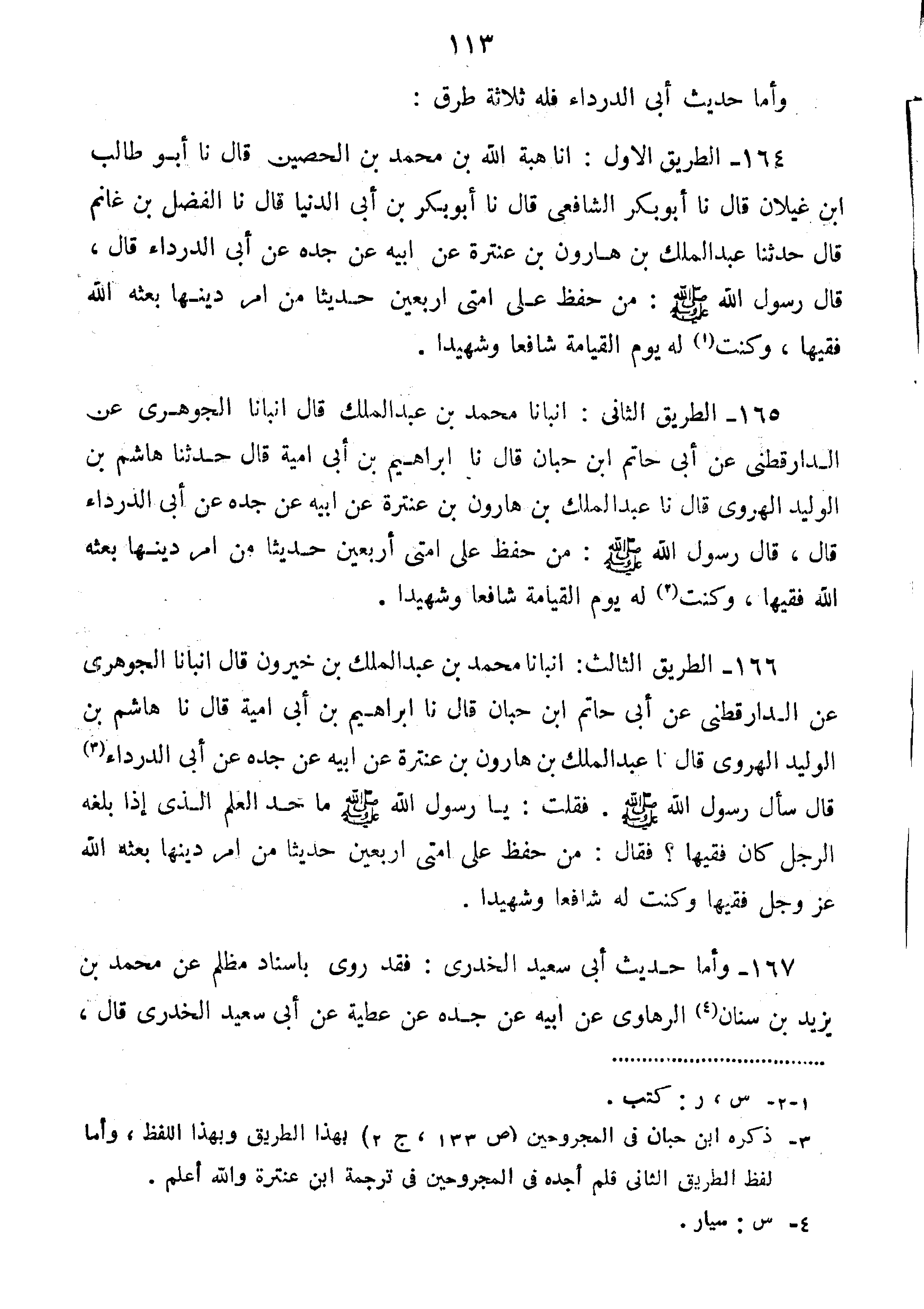 164-الطَّرِيقُ الأَوَّلُ: أَنَا هِبَةُ اللَّهِ بْنُ مُحَمَّدِ بْنِ الْحُصَيْنِ قَالَ نا أَبُو طَالِبِ بْنِ غَيْلَانَ قَالَ نا أَبُو بَكْرٍ الشَّافِعِيُّ قَالَ نا أَبُو بَكْرِ بْنُ أَبِي الدُّنْيَا قَالَ نا الْفَضْلُ بْنُ غَانِمٍ قَالَ حَدَّثَنَا عَبْدُ الْمَلِكِ بْنُ هَارُونَ بْنِ عَنْتَرَةَ عَنْ أَبِيهِ عَنْ جَدِّهِ عَنْ أَبِي الدَّرْدَاءِ قَالَ: قَالَ رَسُولُ اللَّهِ صَلَّى اللَّهُ عَلَيْهِ وَسَلَّمَ:"مَنْ حَفِظَ عَلَى أُمَّتِي أَرْبَعِينَ حَدِيثًا مِنْ أَمْرِ دِينِهَا بَعَثَهُ اللَّهُ فَقِيهًا وَكُنْتُ لَهُ يَوْمَ الْقِيَامَةِ شَافِعًا وَشَهِيدًا ".