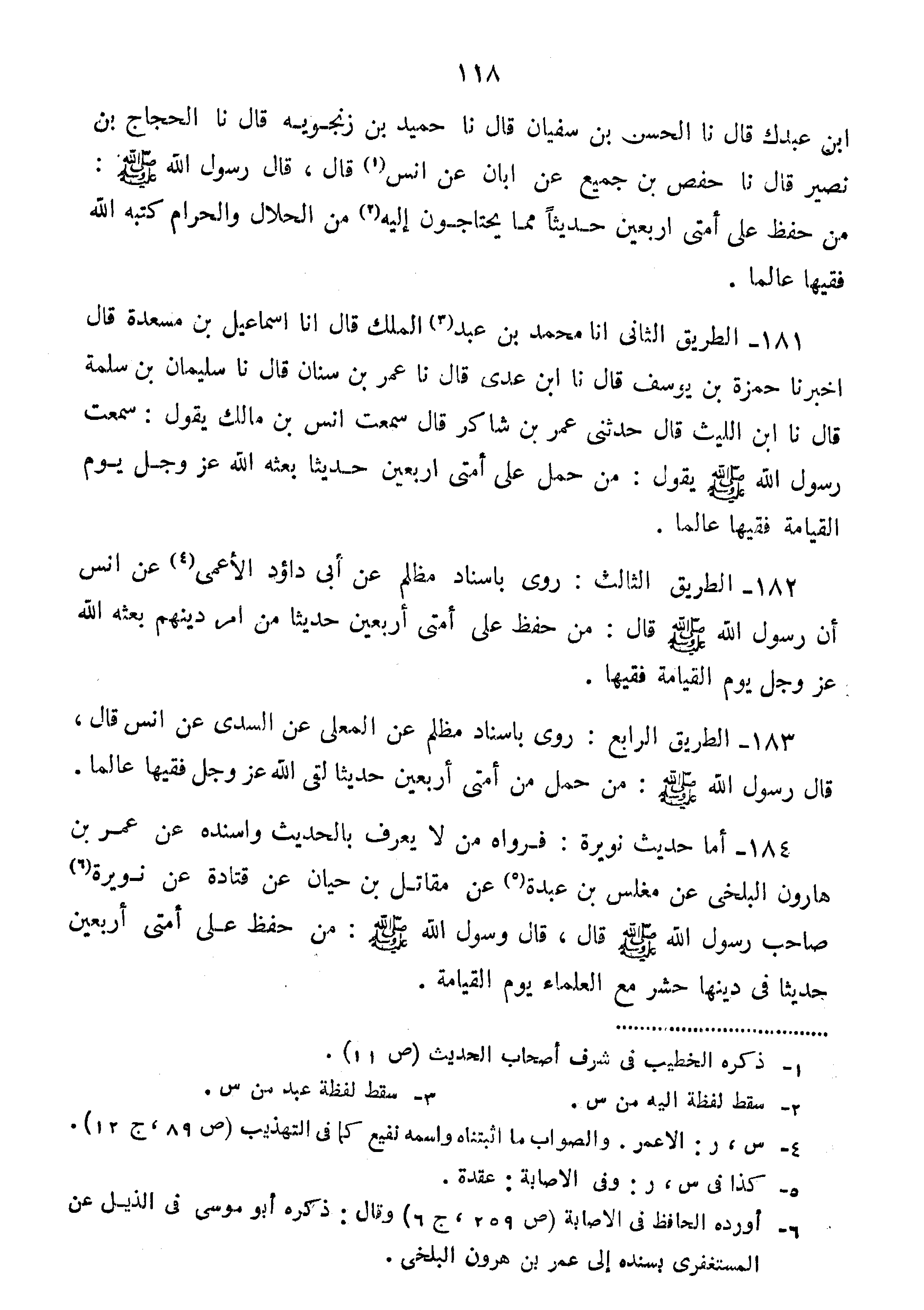 182-الطَّرِيقُ الثَّالِثُ: رَوَي بِإِسْنَادٍ مُظْلِمٍ عَنْ أبي داؤد الأَعْمَى عَنْ أَنَسٍ أَنّ رَسُولَ اللَّهِ صَلَّى اللَّهُ عَلَيْهِ وَسَلَّمَ قَالَ:" مَنْ حَفِظَ عَلَى أُمَّتِي أَرْبَعِينَ حَدِيثًا مِنْ أَمْرِ دِينِهِمْ بَعَثَهُ اللَّهُ عَزَّ وَجَلَّ يَوْمَ الْقِيَامَةِ فَقِيهًا". 183 الطَّرِيقُ الرَّابِعُ: رُوِيَ بِإِسْنَادٍ مُظْلِمٍ عَنِ الْمُعَلَّى عَنِ السُّدِّيِّ عَنْ أَنَسٍ قَالَ: قَالَ رَسُولِ اللَّهِ صَلَّى اللَّهُ عَلَيْهِ وَسَلَّمَ:مَنْ حَمَلَ مِنْ أُمَّتِي أَرْبَعِينَ حَدِيثًا لَقِيَ اللَّهَ عَزَّ وَجَلَّ فَقِيهًا عَالِمًا."