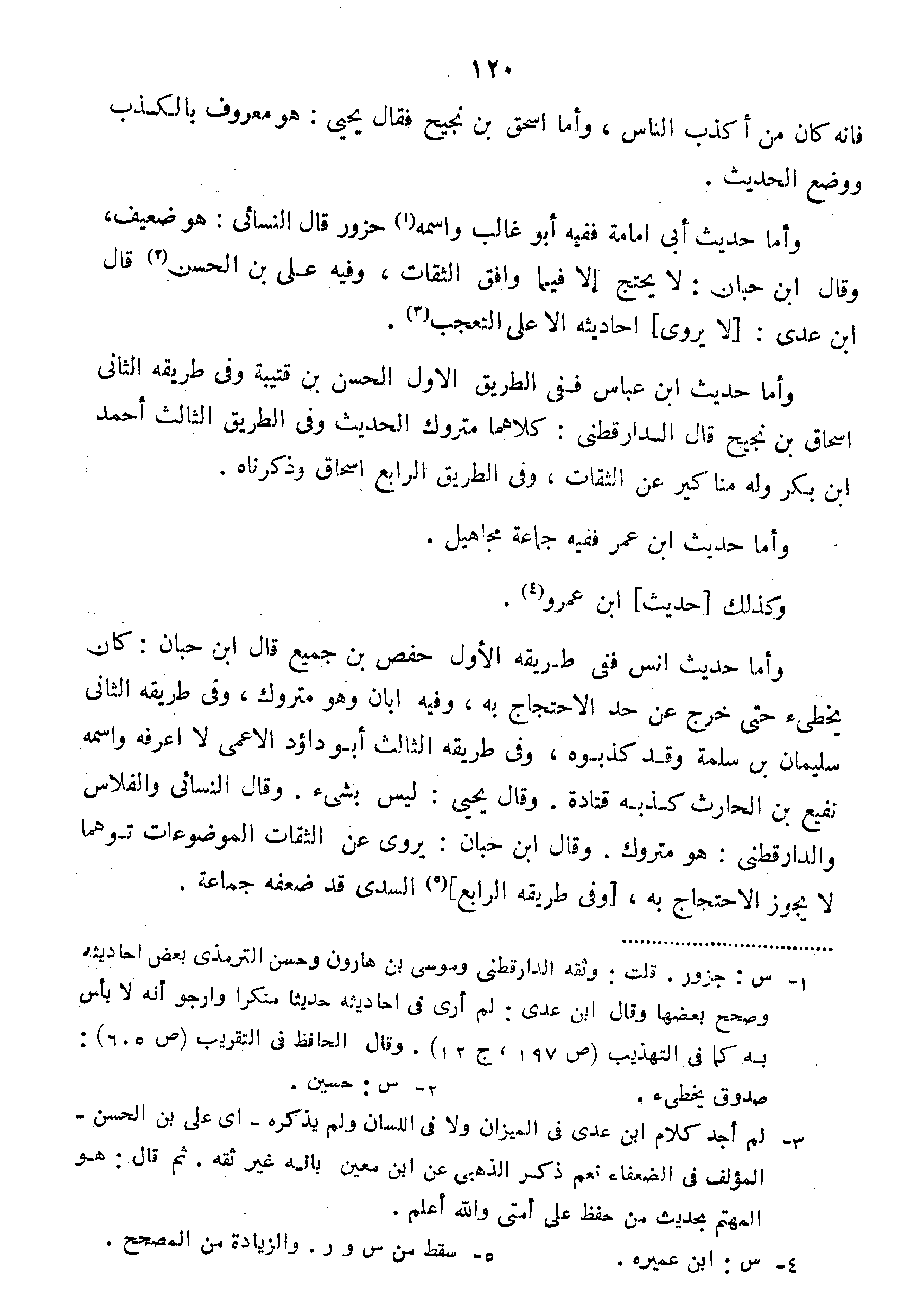 قَالَ الدارقطني: كِلاهُمَا مَتْرُوكُ الْحَدِيثِ وَفِي الطَّرِيقِ الثَّالِثِ أَحْمَدُ بْنُ بَكْرٍ وَلَهُ مَنَاكِيرُ عَنِ الثِّقَاتِ وَفِي الطَّرِيقِ الرَّابِعِ إِسْحَاقُ وَذَكَرْنَاهُ. وَأَمَّا حَدِيثُ ابْنِ عُمَرَ فَفِيهِ جَمَاعَةٌ مَجَاهِيلُ وكذلك حديث بْنِ عَمْرٍو. وَأَمَّا حَدِيثُ أَنَسٍ فَفِي طَرِيقِهِ الأَوَّلِ حَفْصُ بْنُ جُمَيْعٍ.
