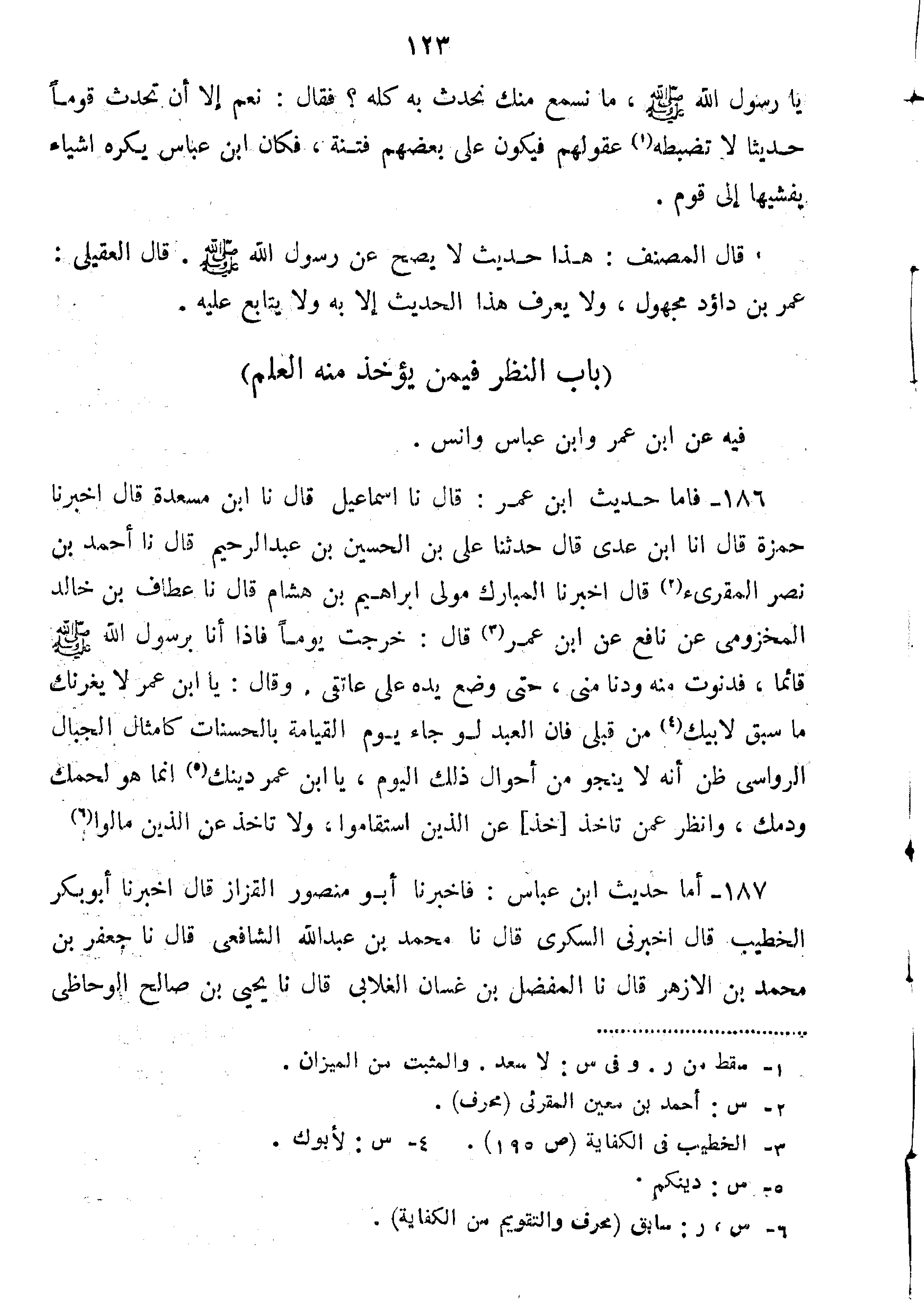 186-فَأَمَّا حَدِيثُ ابْنِ عُمَرَ قَالَ نا إِسْمَاعِيلُ قَالَ نا ابْنُ مَسْعَدَةَ قَالَ أَخْبَرَنَا حَمْزَةُ قَالَ أَنَا ابْنُ عَدِيٍّ قَالَ حَدَّثَنَا عَلِيُّ بْنُ الْحُسَيْنِ بْنِ عَبْدِ الرَّحِيمِ قَالَ نا أَحْمَدُ بْنُ نصر المقريء قَالَ أَخْبَرَنَا الْمُبَارَكُ مَوْلَى إِبْرَاهِيمَ بْنِ هِشَامٍ قَالَ نا عَطَّافُ بْنُ خَالِدٍ الْمَخْزُومِيُّ عَنْ نَافِعٍ عَنِ ابْنِ عُمَرَ قَالَ خَرَجْتُ يَوْمًا فَإِذَا أَنَا بِرَسُولِ اللَّهِ صَلَّى اللَّهُ عَلَيْهِ وَسَلَّمَ قائِمًا فَدَنَوْتُ مِنْهُ وَدَنَا مِنِّي حَتَّى وَضَعَ يَدَهُ عَلَى عَاتِقِي وَقَالَ:" يَا ابْنَ عُمَرَ لا يَغُرَّنَّكَ مَا سَبَقَ لأَبِيكَ مِنْ قَبْلِي فَإِنَّ الْعَبْدَ لَوْ جَاءَ يَوْمَ الْقِيَامَةِ بِالْحَسَنَاتِ كَأَمْثَالِ الْجِبَالِ الرَّوَّاسِيَّ ظَنَّ أَنَّهُ لا يَنْجُو مِنْ أَحْوَالِ ذَلِكَ الْيَوْمِ يَا ابْنَ عُمَرَ دِينُكَ إِنَّمَا هُوَ لَحْمُكَ وَدَمُكَ وَانْظُرْ عَمَّنْ تَأْخُذْ خُذْ عَنِ الَّذِينَ اسْتَقَامُوا وَلا تَأْخُذْ عَنِ الَّذِينَ مَالُوا".