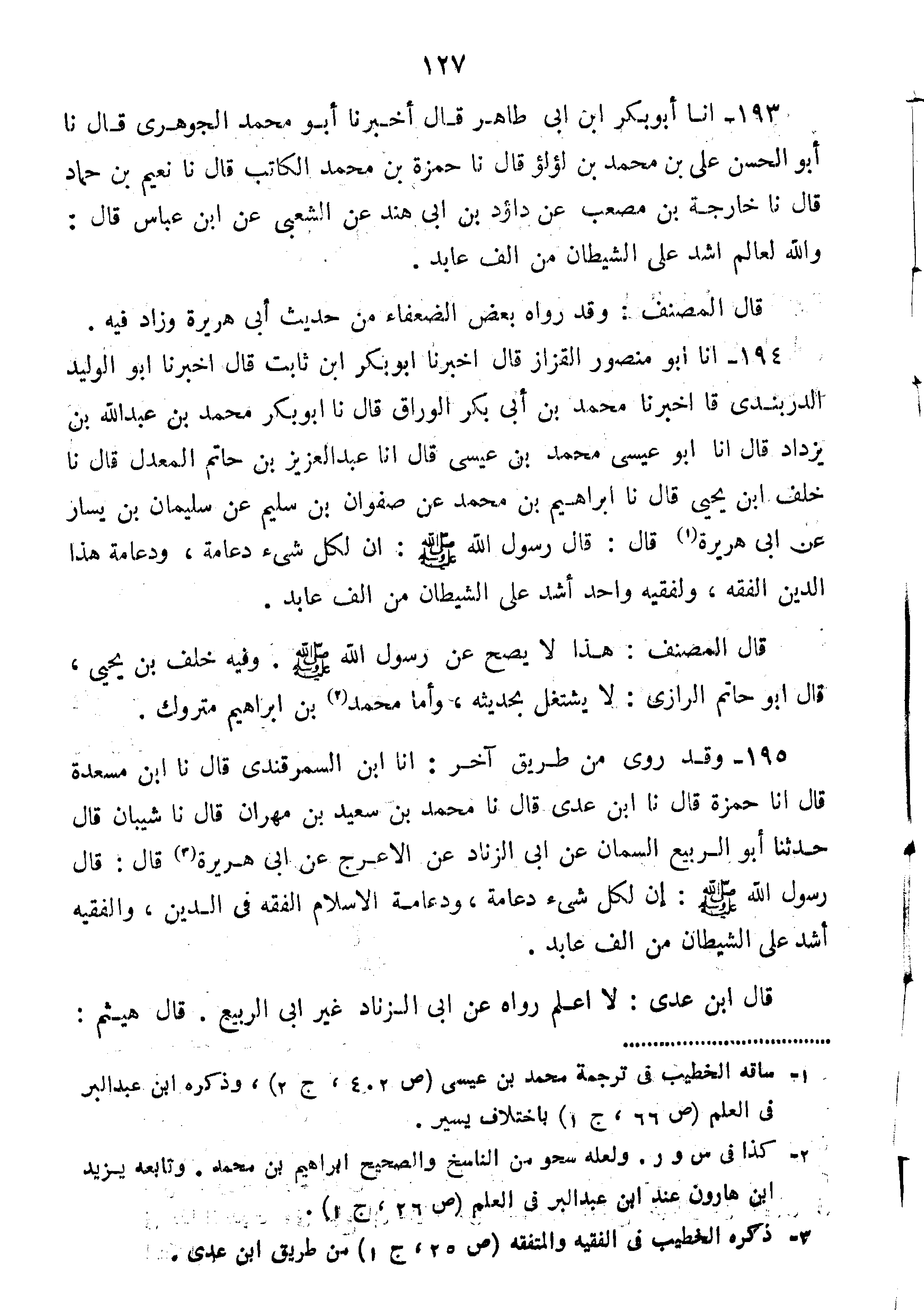 193-أَنَا أَبُو بَكْرِ بْنُ أَبِي طَاهِرٍ قَالَ أَخْبَرَنَا أَبُو مُحَمَّدٍ الْجَوْهَرِيُّ قَالَ نا أَبُو الْحَسَنِ عَلِيُّ بْنُ مُحَمَّدِ بْنِ لُؤْلُؤٍ قَالَ نا حَمْزَةُ بْنُ مُحَمَّدٍ الْكَاتِبُ قَالَ نا نُعَيْمُ بْنُ حَمَّادٍ قَالَ نا خَارِجَةُ بْنُ مصعب عن دَاؤُدُ بْنُ أَبِي هِنْدٍ عَنِ الشَّعْبِيِّ عَنِ ابْنِ عَبَّاسٍ قَالَ:" وَاللَّهِ لَعَالِمٌ أَشَدُّ عَلَى الشَّيْطَانِ مِنْ أَلْفِ عَابِدٍ".