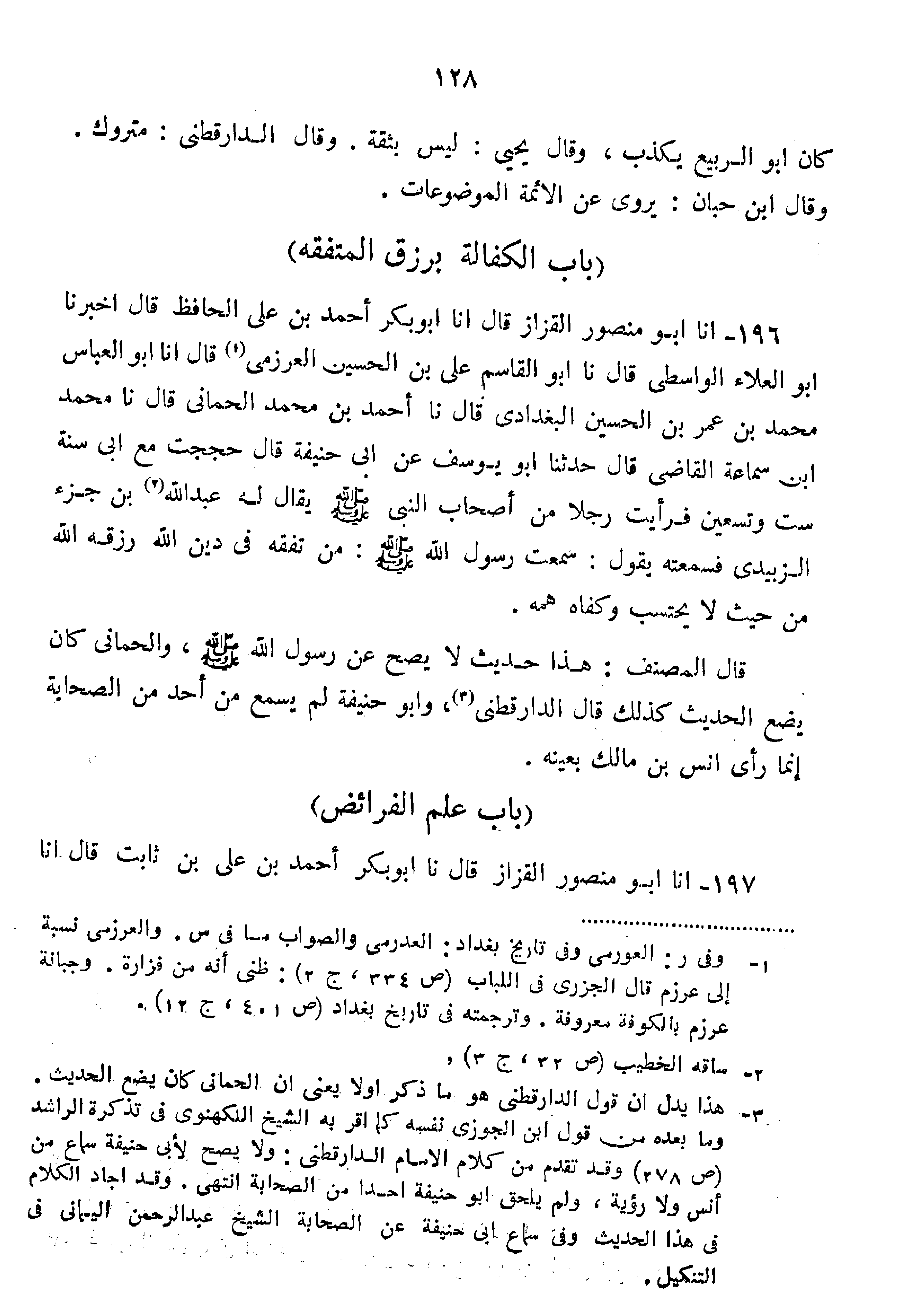 196-أَنَا أَبُو مَنْصُورٍ الْقَزَّازُ قَالَ أَنَا أَبُو بَكْرِ أَحْمَدُ بْنُ عَلِيٍّ الْحَافِظُ قَالَ أخبرنا أبو العلاء الو اسطي قَالَ نا أَبُو الْقَاسِمِ عَلِيُّ بْنُ الْحُسَيْنِ الْعَرْزَمِيُّ قَالَ أَنَا أَبُو الْعَبَّاسِ مُحَمَّدُ بْنُ عُمَرَ بْنِ الْحُسَيْنِ الْبَغْدَادِيُّ قَالَ نا أَحْمَدُ بْنُ مُحَمَّدٍ الْحِمَّانِيُّ قَالَ نا مُحَمَّدُ بْنُ سَمَّاعَةَ الْقَاضِي قَالَ حَدَّثَنَا أَبُو يُوسُفَ عَنْ أَبِي حَنِيفَةَ قَالَ حَجَجْتُ مَعَ أَبِي سَنَةَ سِتٍّ وَتِسْعِينَ فَرَأَيْتُ رَجُلا مِنْ أَصْحَابِ النَّبِيِّ صَلَّى اللَّهُ عَلَيْهِ وَسَلَّمَ يُقالُ لَهُ عَبْدُ اللَّهِ بْنُ جَزْءٍ الزُّبَيْدِيُّ فَسَمِعْتُهُ يَقُولُ سَمِعْتُ رَسُولَ اللَّهِ صَلَّى اللَّهُ عَلَيْهِ وَسَلَّمَ" مَنْ تَفَقَّهَ فِي دِينِ اللَّهِ رَزَقَهُ اللَّهُ مِنْ حَيْثُ لا يَحْتَسِبُ وَكَفَاهُ هَمَّهُ".