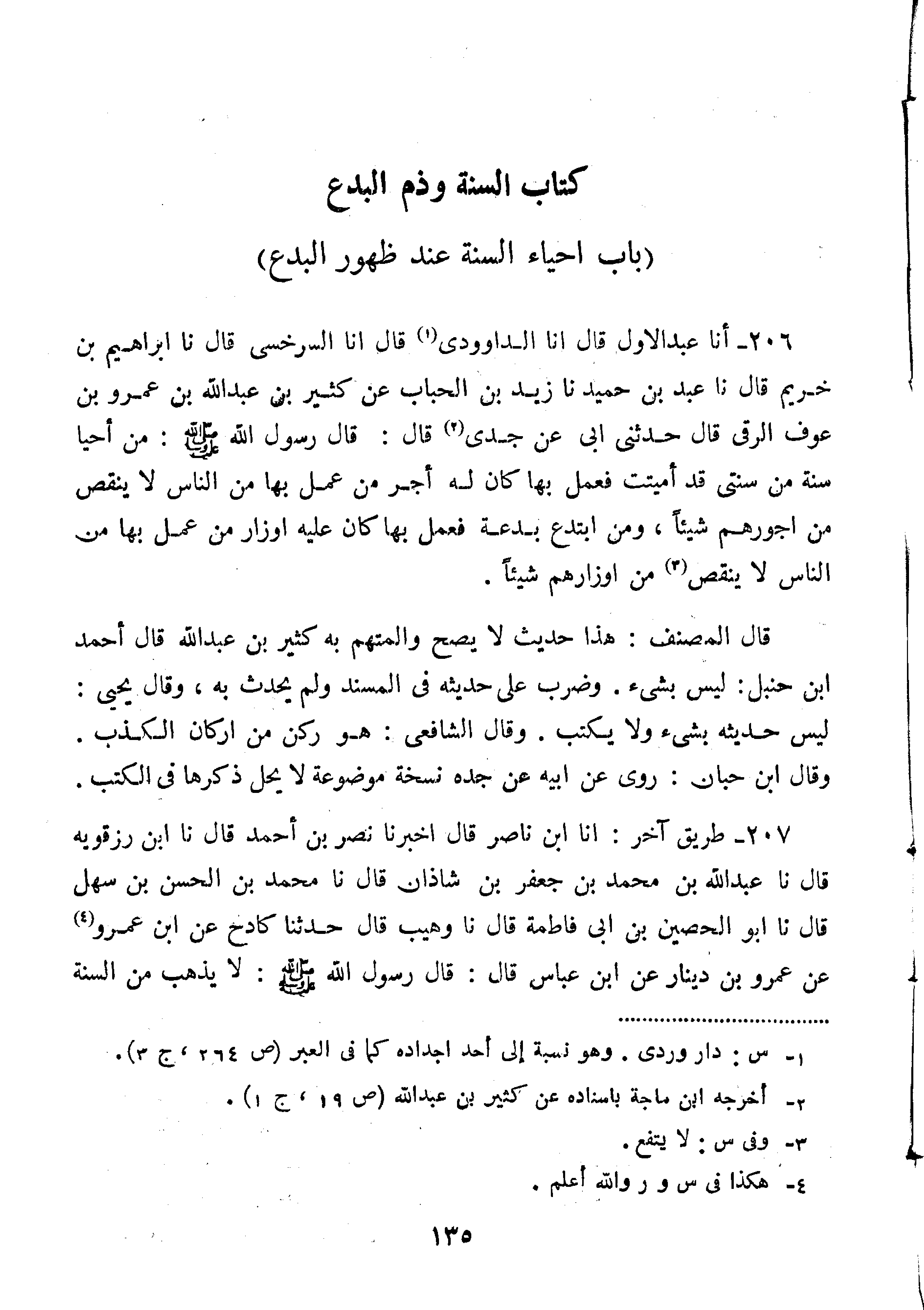 206-قال أَنَا عَبْدُ الأَوَّلِ قَالَ أَنَا الداوودي قَالَ أَنَا السَّرَخْسِيُّ قَالَ نا إِبْرَاهِيمُ بْنُ خُرَيْمٍ قَالَ نا عَبْدُ بْنُ حُمَيْدٍ نا زَيْدُ بْنُ الْحُبَابِ عَنْ كَثِيرِ بْنِ عَبْدِ اللَّهِ بْنِ عَمْرِو بْنِ عَوْفٍ الرَّقِّيُّ قَالَ حَدَّثَنِي أَبِي عَنْ جَدِّي قَالَ: قَالَ رَسُولُ اللَّهِ صَلَّى اللَّهُ عَلَيْهِ وَسَلَّمَ:"مَنْ أَحْيَا سُنَّةً مِنْ سُنَّتِي قَدْ أُمِيتَتْ فَعَمِلَ بِهَا كَانَ لَهُ أَجْرُ مَنْ عَمِلَ بِهَا مِنَ النَّاسِ لا يَنْقُصُ مِنْ أُجُورِهِمْ شَيْئًا وَمَنِ ابْتَدَعَ بِدْعَةً فَعَمِلَ بِهَا كَانَ عَلَيْهِ أَوْزَارُ مَنْ عَمِلَ بِهَا مِنَ النَّاسِ لا يَنْقُصُ مِنْ أَوْزَارِهِمْ شَيْئًا".