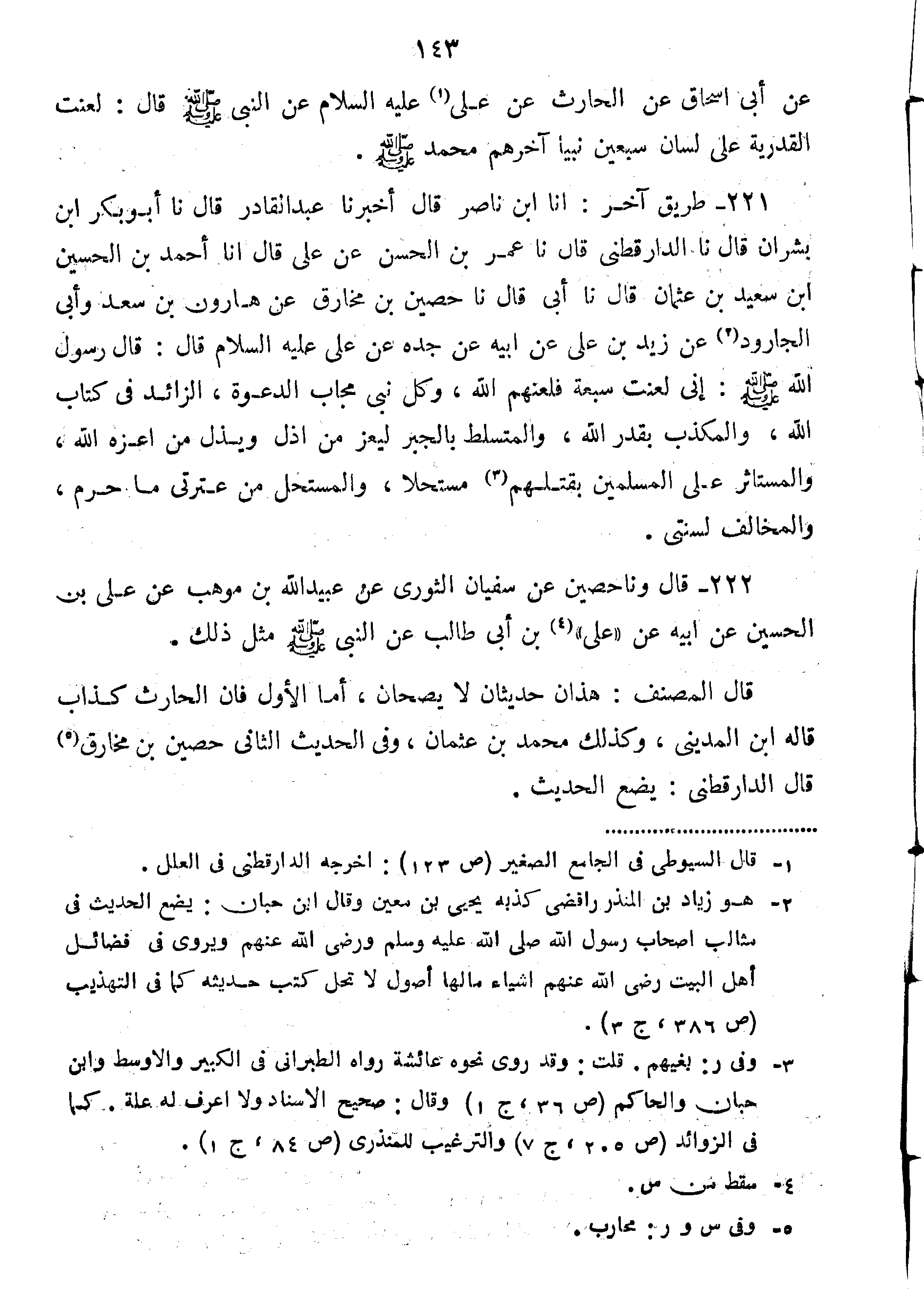 عَنْ أَبِي إِسْحَاقَ عَنِ الْحَارِثِ عَنْ عَلِيٍّ عَلَيْهِ السَّلامُ عَنِ النَّبِيَّ صَلَّى اللَّهُ عَلَيْهِ وَسَلَّمَ قَالَ:" لُعِنَتِ الْقَدَرِيَّةُ عَلَى لِسَانِ سَبْعِينَ نَبِيًّا آخِرُهُمْ مُحَمَّدٌ صَلَّى اللَّهُ عَلَيْهِ وَسَلَّمَ ".