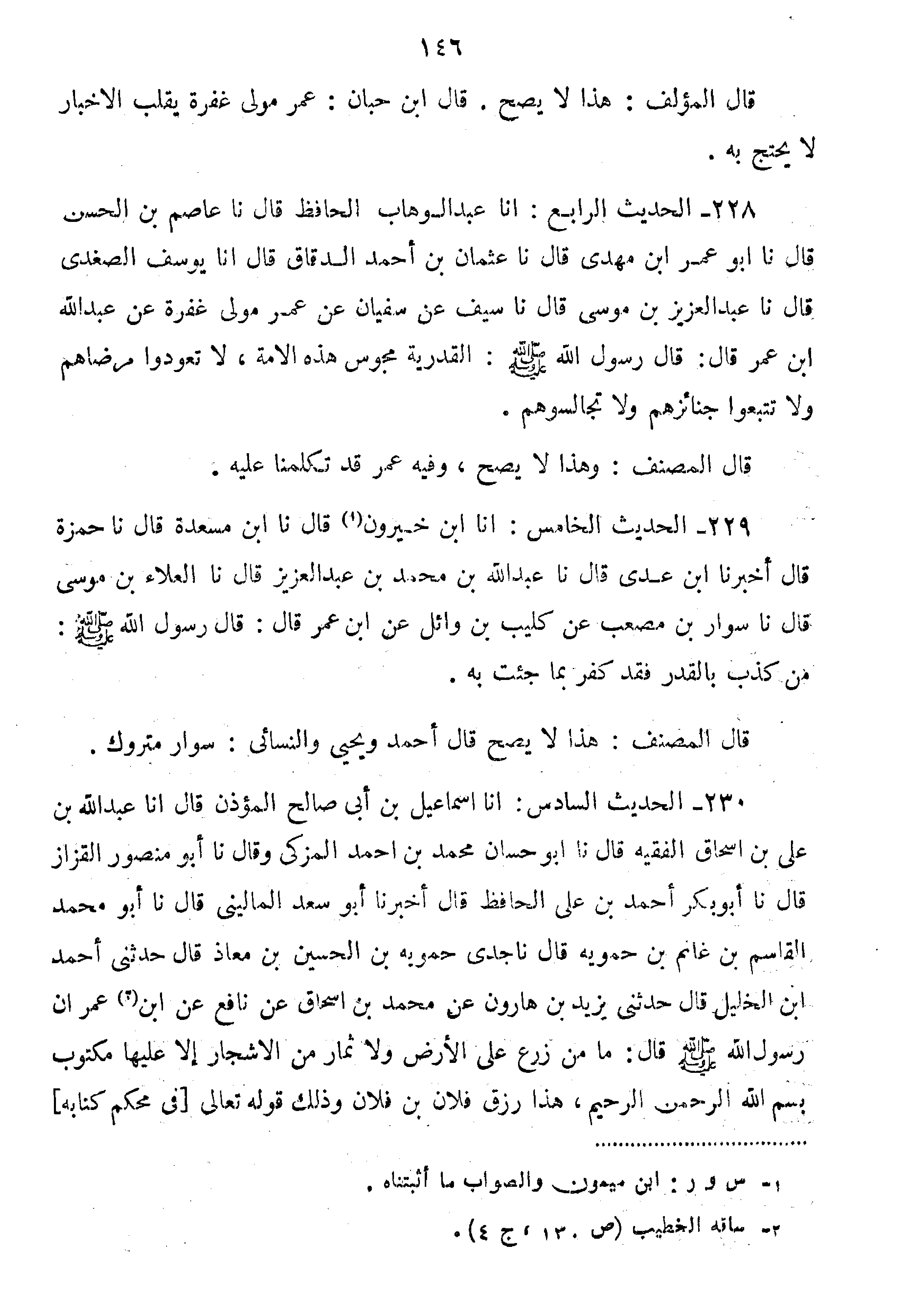 229- الْحَدِيثُ الْخَامِسُ: أَنَا ابْنُ خَيْرُونَ قَالَ نا ابْنُ مَسْعَدَةَ قَالَ نا حَمْزَةُ قَالَ أَخْبَرَنَا ابْنُ عَدِيٍّ قَالَ نا عَبْدُ اللَّهِ بْنُ مُحَمَّدِ بْنِ عَبْدِ الْعَزِيزِ قَالَ نا الْعَلاءُ بْنُ مُوسَى قَالَ نا سَوَّارُ بْنُ مُصْعَبٍ عَنْ كُلَيْبِ بْنِ وَائِلٍ عَنِ ابْنِ عُمَرَ قَالَ: قَالَ رَسُولُ اللَّهِ صَلَّى اللَّهُ عَلَيْهِ وَسَلَّمَ:"مَنْ كَذَّبَ بِالْقَدَرِ فَقَدْ كَفَرَ بِمَا جِئْتُ بِهِ".