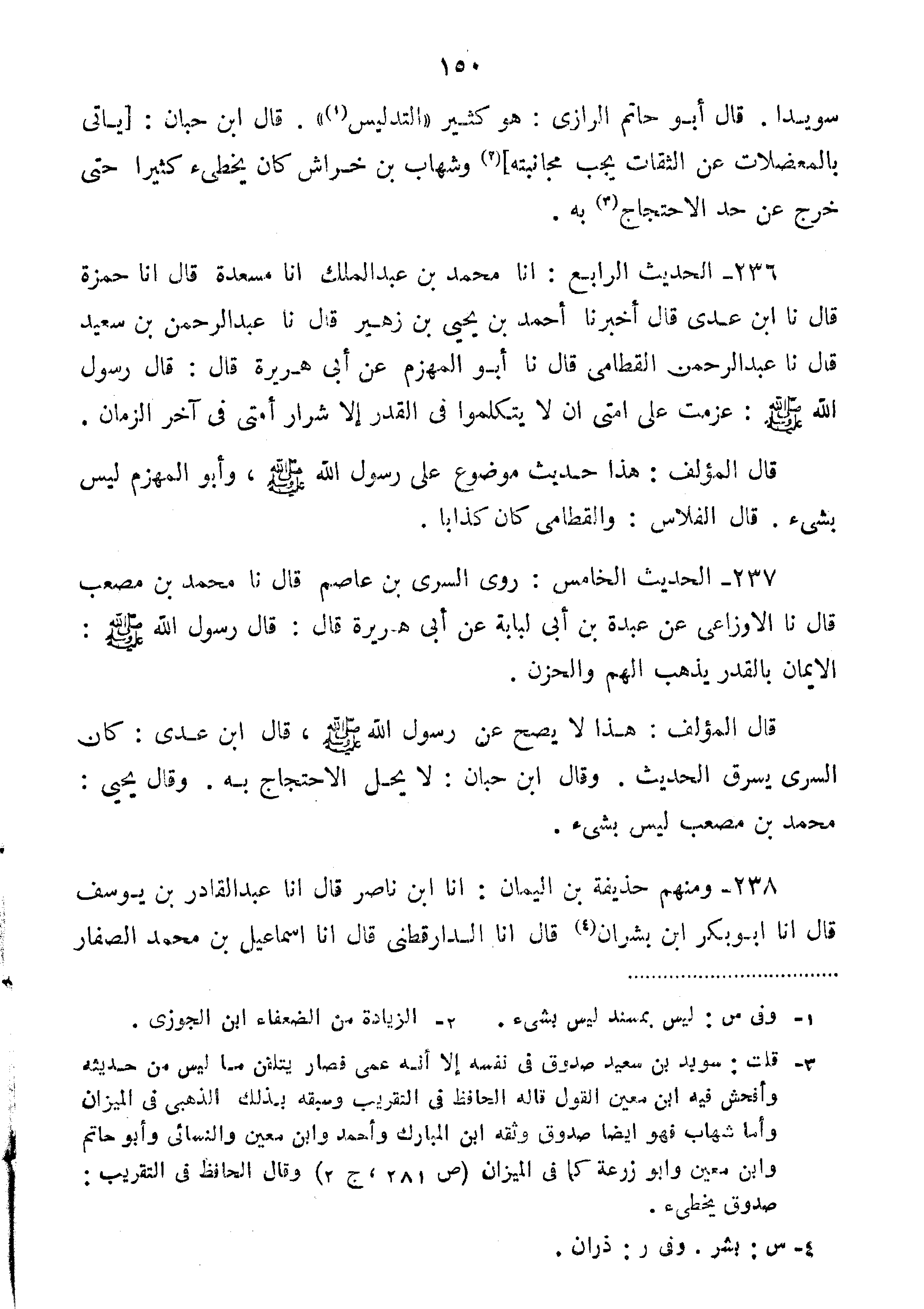 236-الْحَدِيثُ الرَّابِعُ أَنَا مُحَمَّدُ بْنُ عَبْدِ الْمَلِكِ أَنَا مَسْعَدَةُ قَالَ أَنَا حَمْزَةُ قَالَ نا ابْنُ عَدِيٍّ قَالَ أَخْبَرَنَا أَحْمَدُ بْنُ يَحْيَى بْنِ زُهَيْرٍ قَالَ نا عَبْدُ الرَّحْمَنِ بْنُ سَعِيدٍ قَالَ نا عَبْدُ الرَّحْمَنِ الْقُطَامِيُّ قَالَ نا أَبُو الْمُهَزِّمِ عَنْ أَبِي هُرَيْرَةَ قَالَ: قَالَ رَسُولُ اللَّهِ صَلَّى اللَّهُ عَلَيْهِ وَسَلَّمَ:"عَزَمْتُ عَلَى أُمَّتِي أَنْ لا يَتَكَلَّمُوا فِي الْقَدَرِ إِلا شِرَارَ أُمَّتِي فِي آخِرِ الزَّمَانِ".