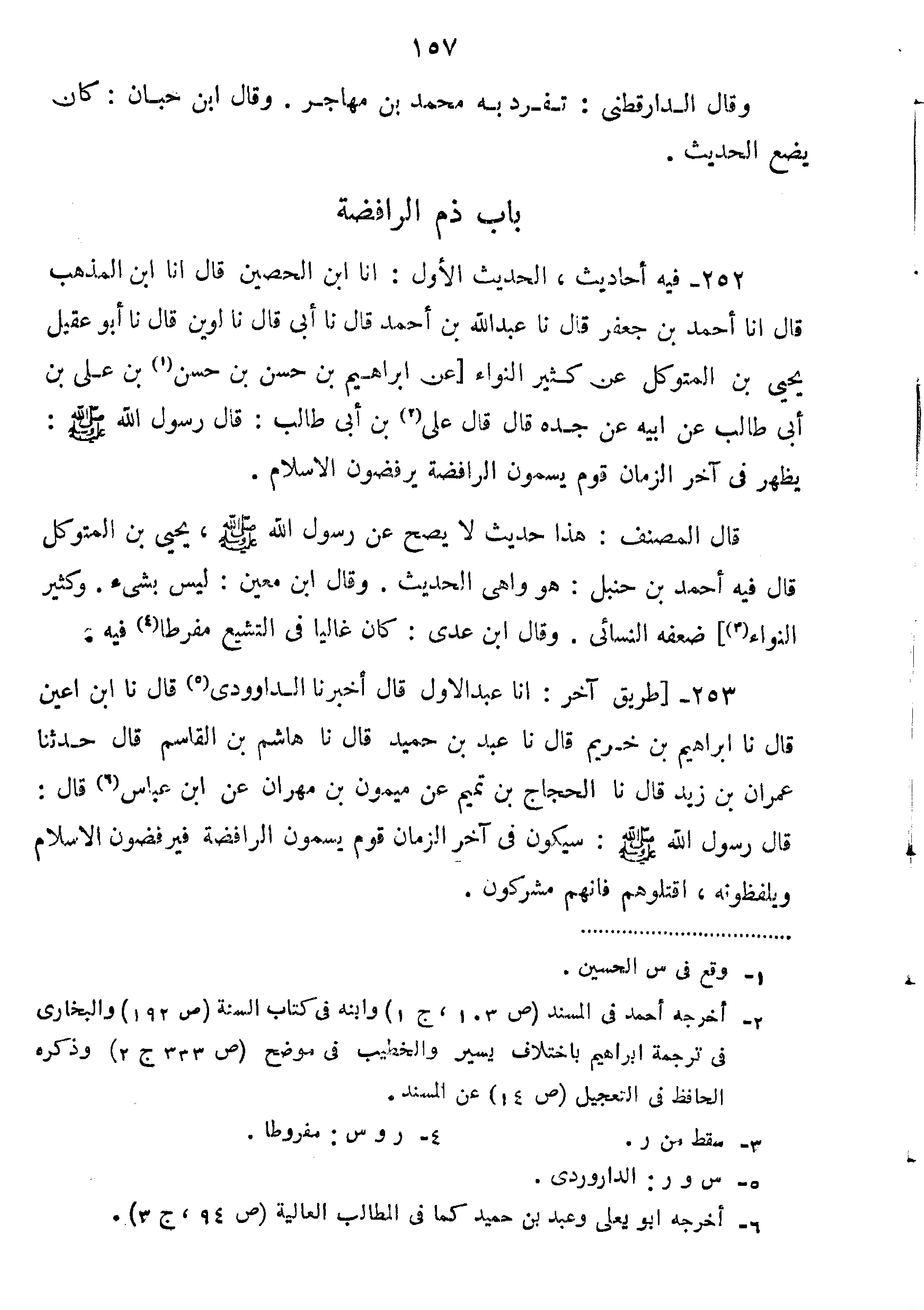 252-فِيهِ أَحَادِيثَ الْحَدِيثُ الأَوَّلُ: أَنَا ابْنُ الْحُصَيْنِ قَالَ أَنَا ابْنُ الْمُذْهِبِ قَالَ أَنَا أَحْمَدُ بْنُ جَعْفَرٍ قَالَ نا عَبْدُ اللَّهِ بْنُ أَحْمَدَ قَالَ نا أَبِي قَالَ نا لُوَيْنٌ قَالَ نا أَبُو عَقِيلٍ يَحْيَى بْنُ الْمُتَوَكِّلِ عَنْ كَثِيرٍ النَّوَّاءِ عَنْ إِبْرَاهِيمَ بْنِ حَسَنِ بْنِ حَسَنِ بْنِ عَلِيِّ ابن أَبِي طَالِبٍ عَنْ أَبِيهِ عَنْ جَدِّهِ قَالَ: قَالَ عَلِيُّ بْنُ أَبِي طَالِبٍ قَالَ رَسُولُ اللَّهِ صَلَّى اللَّهُ عَلَيْهِ وَسَلَّمَ:"يَظْهَرُ فِي آخِرِ الزَّمَانِ قَوْمٌ يُسَمُّونَ الرَّافِضَةَ يَرْفُضُونَ الْإِسْلَامَ".