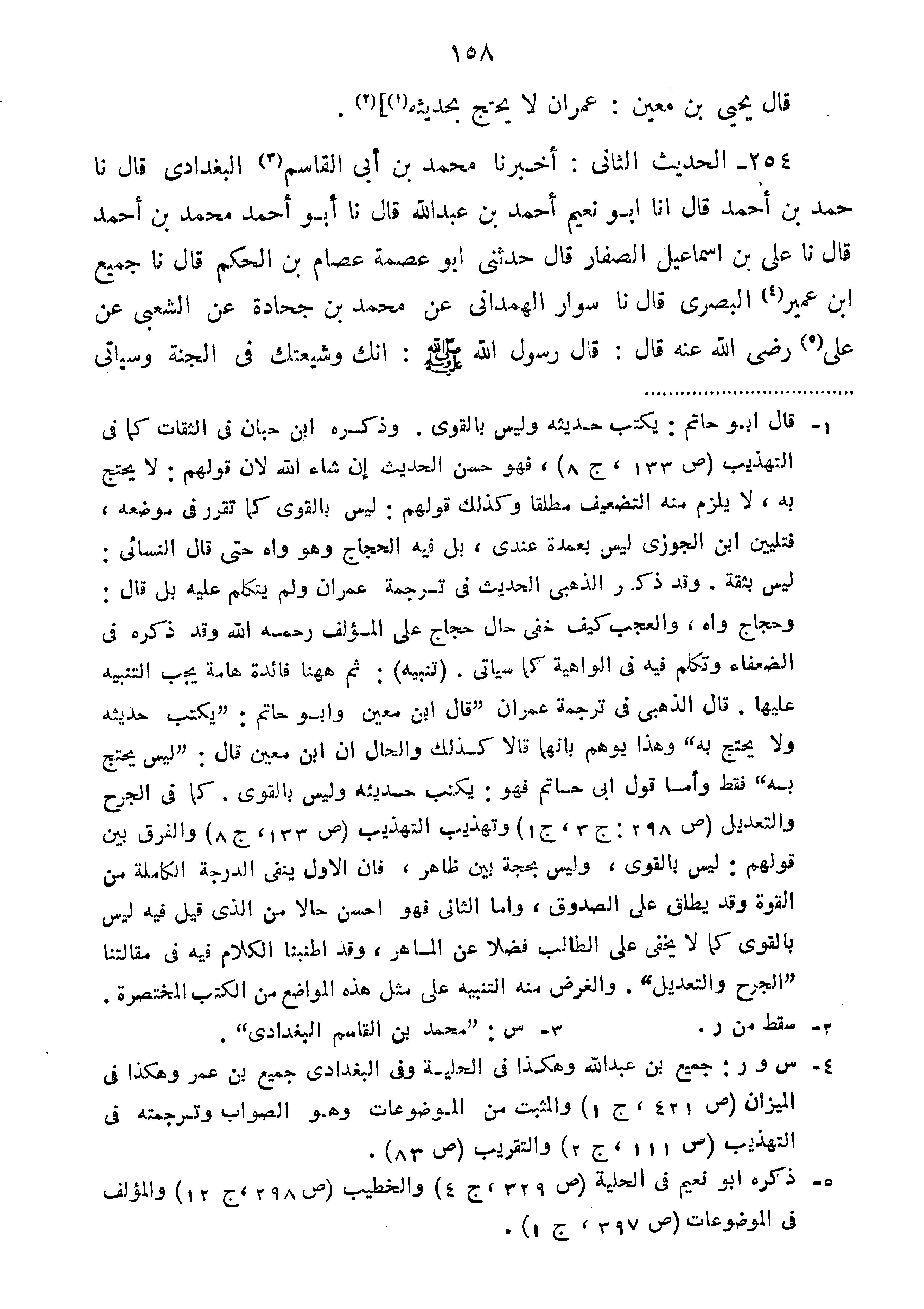 254-الْحَدِيثُ الثَّانِي: أَخْبَرَنَا مُحَمَّدُ بْنُ أَبِي الْقَاسِمِ البغدادي قال نا حمد ابن أَحْمَدَ قَالَ أَنَا أَبُو نُعَيْمٍ أَحْمَدُ بْنُ عَبْدِ اللَّهِ قَالَ نا أَبُو أَحْمَدَ مُحَمَّدُ بْنُ أَحْمَدَ قَالَ نا عَلِيُّ بْنُ إِسْمَاعِيلَ الصَّفَّارُ قَالَ حَدَّثَنِي أَبُو عِصْمَةَ عِصَامُ بْنُ الْحَكَمِ قَالَ نا جَمِيعُ بْنُ عُمَيْرٍ الْبَصْرِيُّ قَالَ نا سَوَّارٌ الْهَمَدَانِيُّ عَنْ مُحَمَّدِ بْنِ جَحَادَةَ عَنِ الشَّعْبِيِّ عَنْ عَلِيٍّ رَضِيَ اللَّهُ عَنْهُ قَالَ: قَالَ رَسُولُ اللَّهِ صَلَّى اللَّهُ عَلَيْهِ وَسَلَّمَ:" إِنَّكَ وَشِيعَتَكَ فِي الْجَنَّةِ وَسَيَأْتِي