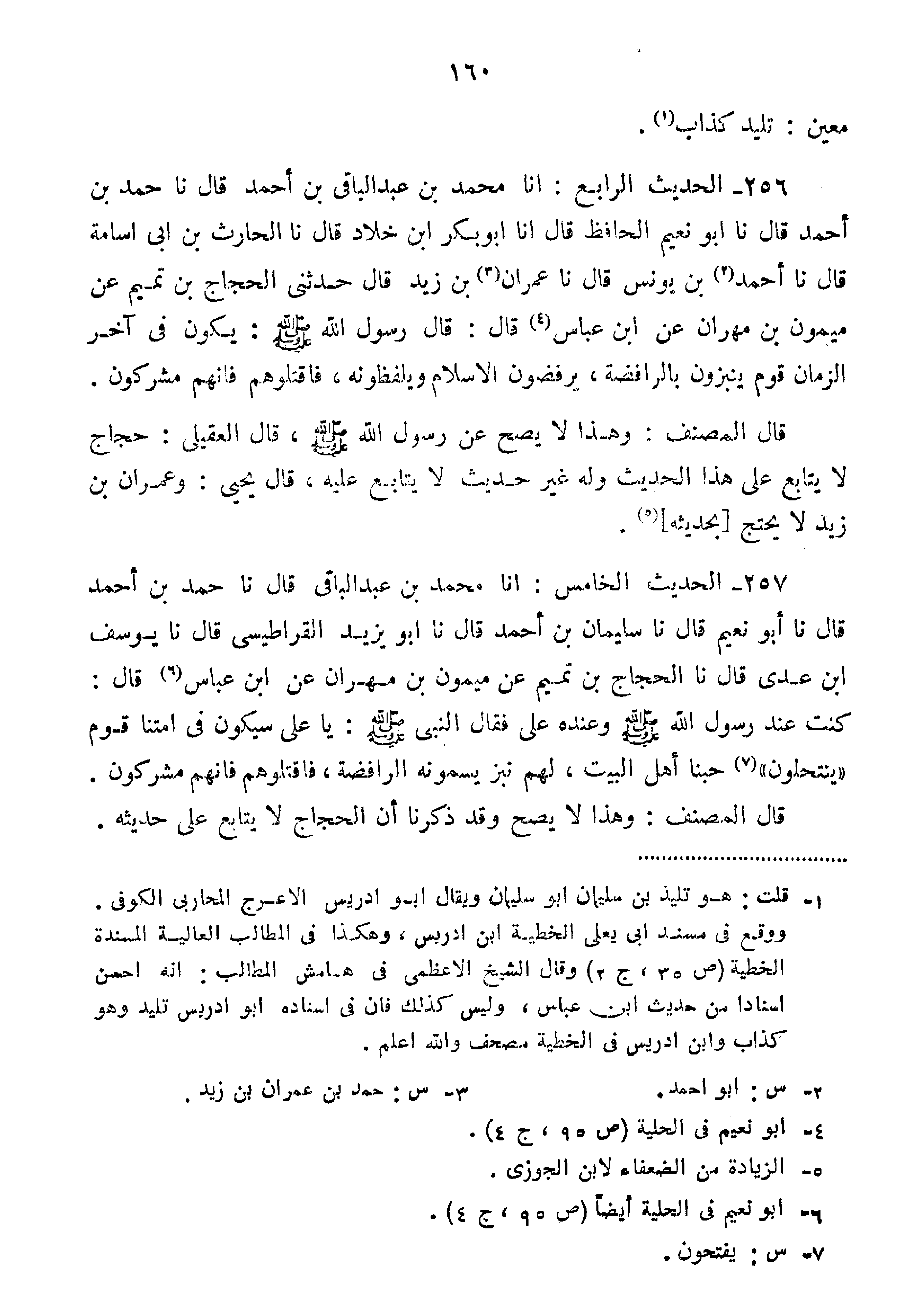 256-الْحَدِيثُ الرَّابِعُ: أَنَا مُحَمَّدُ بْنُ عَبْدِ الْبَاقِي بْنِ أَحْمَدَ قَالَ نا حَمَدُ بْنُ أَحْمَدَ قَالَ نا أَبُو نُعَيْمٍ الْحَافِظُ قَالَ نا أَبُو بَكْرِ بْنُ خَلادٍ قَالَ نا الْحَارِثُ بْنُ أَبِي أُسَامَةَ قَالَ نا أَحْمَدُ بْنُ يُونُسَ قَالَ نا عُمْرَانُ بْنُ زَيْدٍ قَالَ حَدَّثَنِي الْحَجَّاجُ بْنُ تَمِيمٍ عَنْ مَيْمُونِ بْنِ مَهْرَانَ عَنِ ابْنِ عَبَّاسٍ قَالَ: قَالَ رَسُولُ اللَّهِ صَلَّى اللَّهُ عَلَيْهِ وَسَلَّمَ:"يَكُونُ فِي الزَّمَانِ قَوْمٌ يُنْبَزُونَ بِالرَّافِضَةِ يَرْفُضُونَ الْإِسْلَامَ وَيَلْفُظُونَهُ فَاقْتُلُوهُمْ فَإِنَّهُمْ مُشْرِكُونَ".