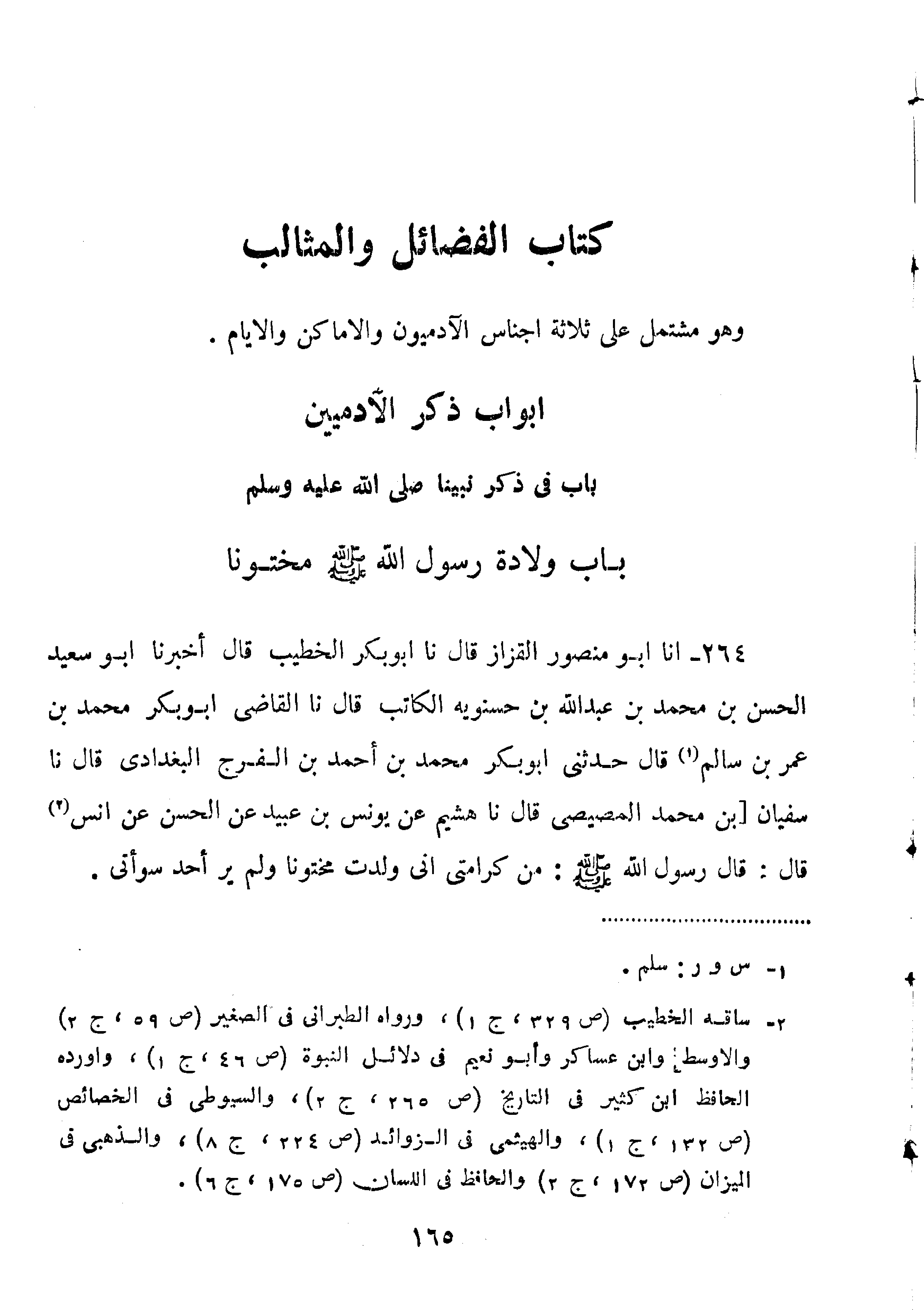 264-أَنَا أَبُو مَنْصُورٍ الْقَزَّازُ قَالَ نا أَبُو بَكْرٍ الْخَطِيبُ قَالَ أَخْبَرَنَا أَبُو سَعِيدٍ الْحَسَنُ بْنُ مُحَمَّدِ بْنِ عَبْدِ اللَّهِ بْنِ حَسْنُوَيْهِ الْكَاتِبُ قَالَ نا الْقَاضِي أَبُو بَكْرٍ محمد ابن عُمَرَ بْنِ سَالِمٍ قَالَ حَدَّثَنِي أَبُو بَكْرٍ مُحَمَّدُ بْنُ أَحْمَدَ بْنِ الْفَرَجِ الْبَغْدَادِيُّ قَالَ نا سُفْيَانُ بْنُ مُحَمَّدٍ الْمِصِّيصِيُّ قَالَ نا هُشَيْمٌ عَنْ يُونُسَ بْنِ عُبَيْدٍ عَنِ الْحَسَنِ عَنْ أَنَسٍ قَالَ: قَالَ رَسُولُ اللَّهِ صَلَّى اللَّهُ عَلَيْهِ وَسَلَّمَ:"مِنْ كَرَامَتِي أَنِّي وُلِدْتُ مَخْتُونًا وَلَمْ يَرَ أحد سوأتي".