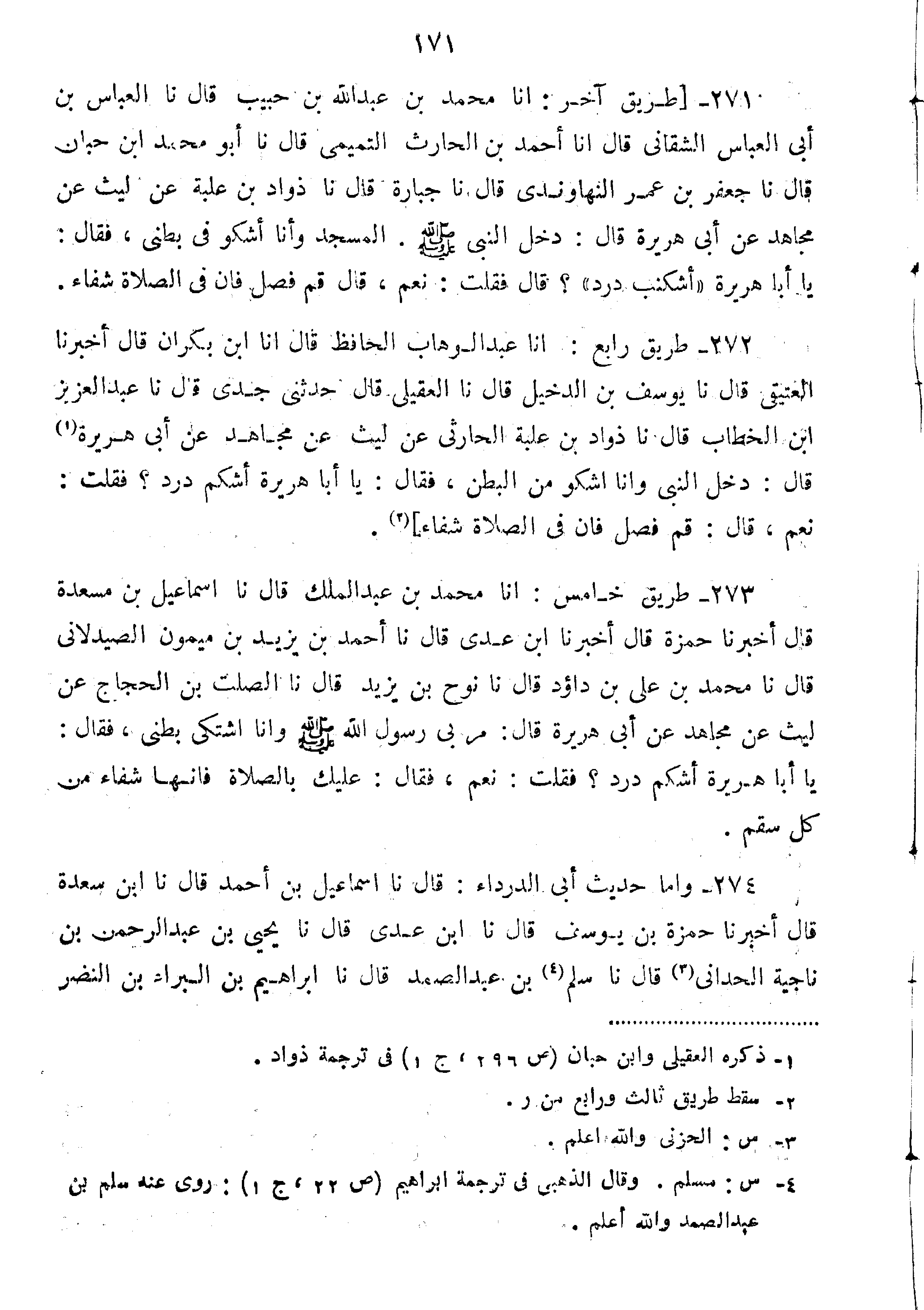 272-طَرِيقٌ رَابِعٌ أَنَا عَبْدُ الْوَهَّابِ الْحَافِظُ قَالَ أَنَا ابْنُ بَكْرَانَ قَالَ أَخْبَرَنَا الْعُتَيْقِيُّ قَالَ نا يُوسُفُ بْنُ الدَّخِيلِ قَالَ نا الْعَقِيلِيُّ قَالَ حَدَّثَنِي جَدِّي قَالَ نا عَبْدُ الْعَزِيزِ بْنُ الْخَطَّابِ قَالَ نا ذواد بن عَنْ لَيْثٍ عَنْ مُجَاهِدٍ عَنْ أَبِي هُرَيْرَةَ قَالَ دَخَلَ النَّبِيُّ وَأَنَا أَشْكُو مِنَ الْبَطْنِ فَقَالَ:" يَا أَبَا هُرَيْرَةَ أشكم درد؟ فَقُلْتُ نَعَمْ قَالَ قُمْ فَصَلِّ فإن في الصلاة شفاء".
