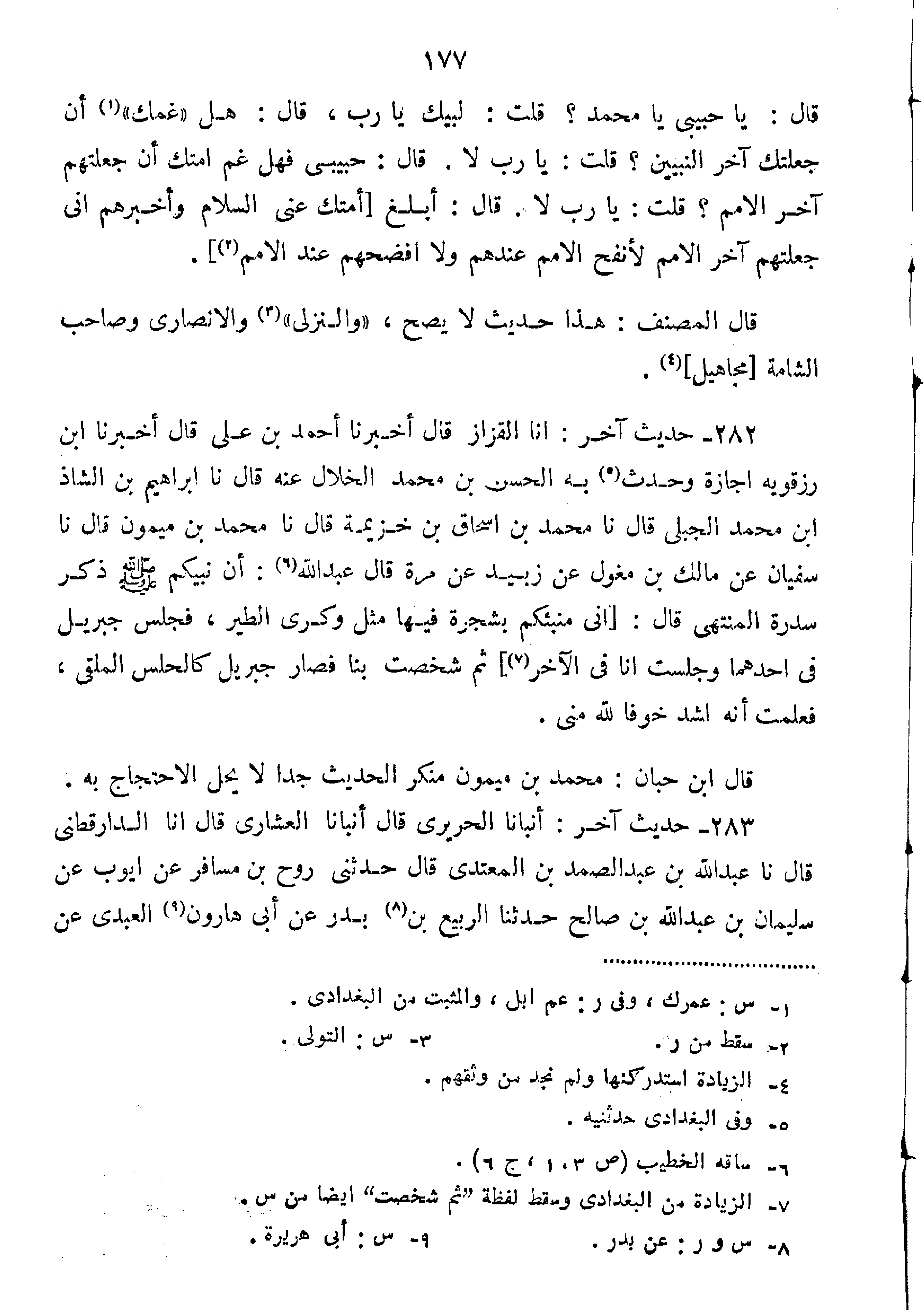 282- حَدِيثٌ آخَرُ أَنَا الْقَزَّازُ قَالَ أَخْبَرَنَا أَحْمَدُ بْنُ عَلِيٍّ قَالَ أَخْبَرَنَا ابْنُ رِزْقَوَيْهِ إِجَازَةً وَحَدَّثَ بِهِ الْحَسَنُ بْنُ مُحَمَّدٍ الْخَلَّالُ عَنْهُ قَالَ نا إبراهيم بن الشاذ ابن مُحَمَّدٍ الْجَبَلِيُّ قَالَ نا مُحَمَّدُ بْنُ إِسْحَاقَ بْنِ خُزَيْمَةَ قَالَ نا مُحَمَّدُ بْنُ مَيْمُونٍ قَالَ نا سُفْيَانُ عَنْ مَالِكِ بْنِ مِغْوَلٍ عَنْ زُبَيْدٍ عَنْ مُرَّةَ قَالَ عَبْدُ اللَّهِ إِنَّ نَبِيَّكُمْ صَلَّى اللَّهُ عَلَيْهِ وَسَلَّمَ ذَكَرَ سِدْرَةَ الْمُنْتَهَى قَالَ:" إِنِّي مُنْبِئُكُمْ بِشَجَرَةٍ فِيهَا مِثْلُ وَكْرَيِ الطَّيْرِ والحاصل جِبْرِيلُ فِي أَحَدِهِمَا وَجَلَسْتُ أَنَا فِي الآخَرِ ثُمَّ شَخَصَتْ بِنَا فَصَارَ جِبْرِيلُ كالْحِلْسِ الْمُلْقَى فَعَلِمْتُ أنه أشد خوفالله مِنِّي ".
