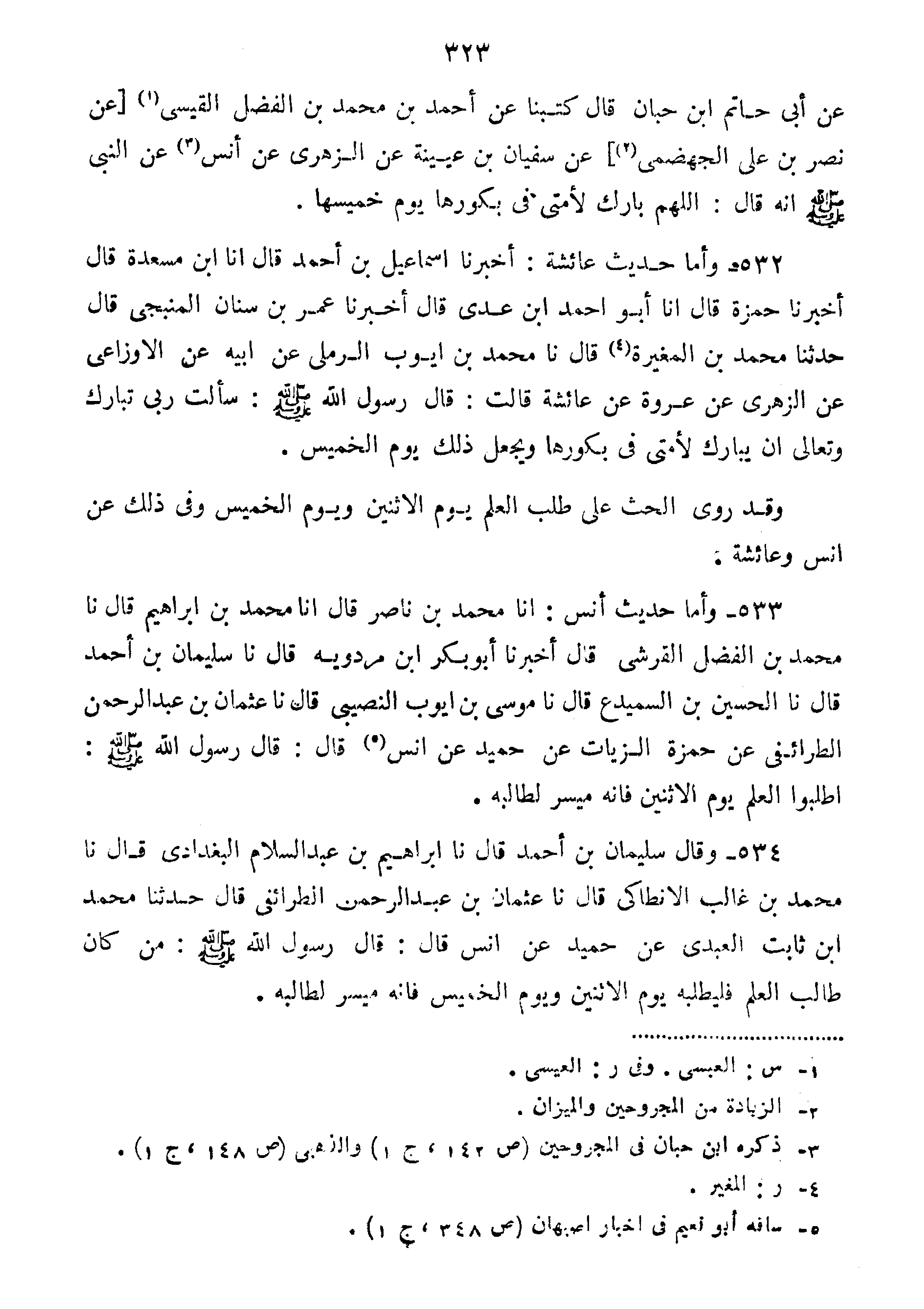 عَنْ أَبِي حَاتِمِ بْنِ حَبّانَ قَالَ كَتَبْنَا عَنْ أَحْمَدِ بْنِ مُحَمَّدِ بْنِ الْفَضْلِ الْقَيْسِيِّ عَنْ نَصْرِ بْنِ عَلِيٍّ الْجَهْضَمِيِّ عَنْ سُفْيَانَ بْنِ عُيَيْنَةَ عَنِ الزُّهْرِيِّ عَنْ أَنَسٍ عَنِ النَّبِيِّ صَلَّى اللَّهُ عَلَيْهِ وَسَلَّمَ أَنَّهُ قَالَ:" اللَّهُمَّ بَارِكْ لأُمَّتِي فِي بُكُورِهَا يوم خميسها".