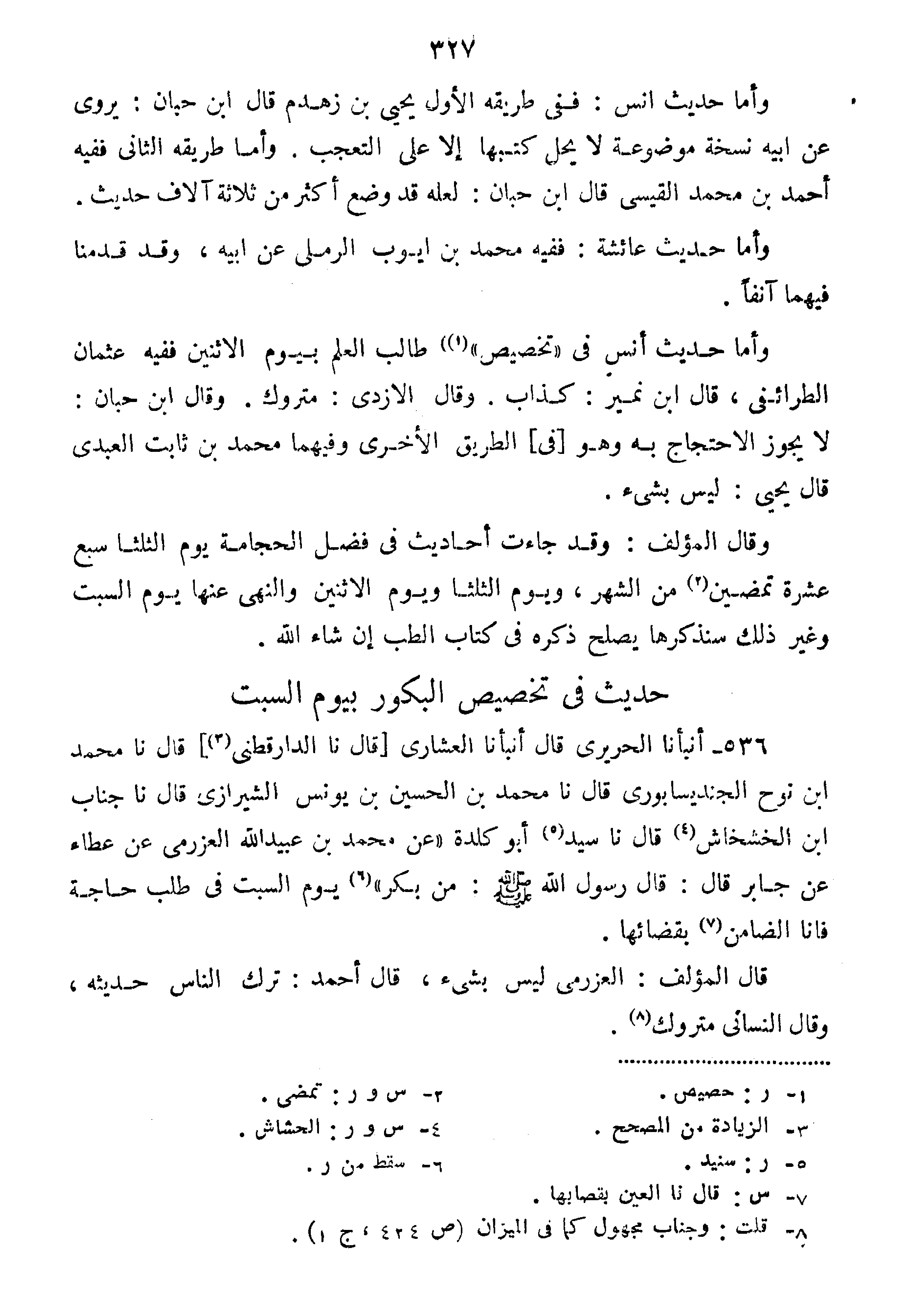 وَأَمَّا حَدِيثُ أَنَسٍ فِي تَخْصِيصِ طَالِبِ الْعِلْمِ بِيَوْمِ الاثْنَيْنِ فَفِيهِ عُثْمَانُ الطَّرَائِفِيُ قَالَ ابْنُ نُمَيْرٍ كَذَّابٌ وَقَالَ الْأَزْدِيُّ مَتْرُوكٌ وَقَالَ ابْنُ حَبَّانَ: لا يَجُوزُ الاحْتِجَاجُ بِهِ وَهُوَ فِي الطَّرِيقِ الأُخْرَى وَفِيهِمَا مُحَمَّدُ بْنُ ثَابِتٍ الْعَبْدِيُّ قَالَ يَحْيَى لَيْسَ بِشَيْءٍ.