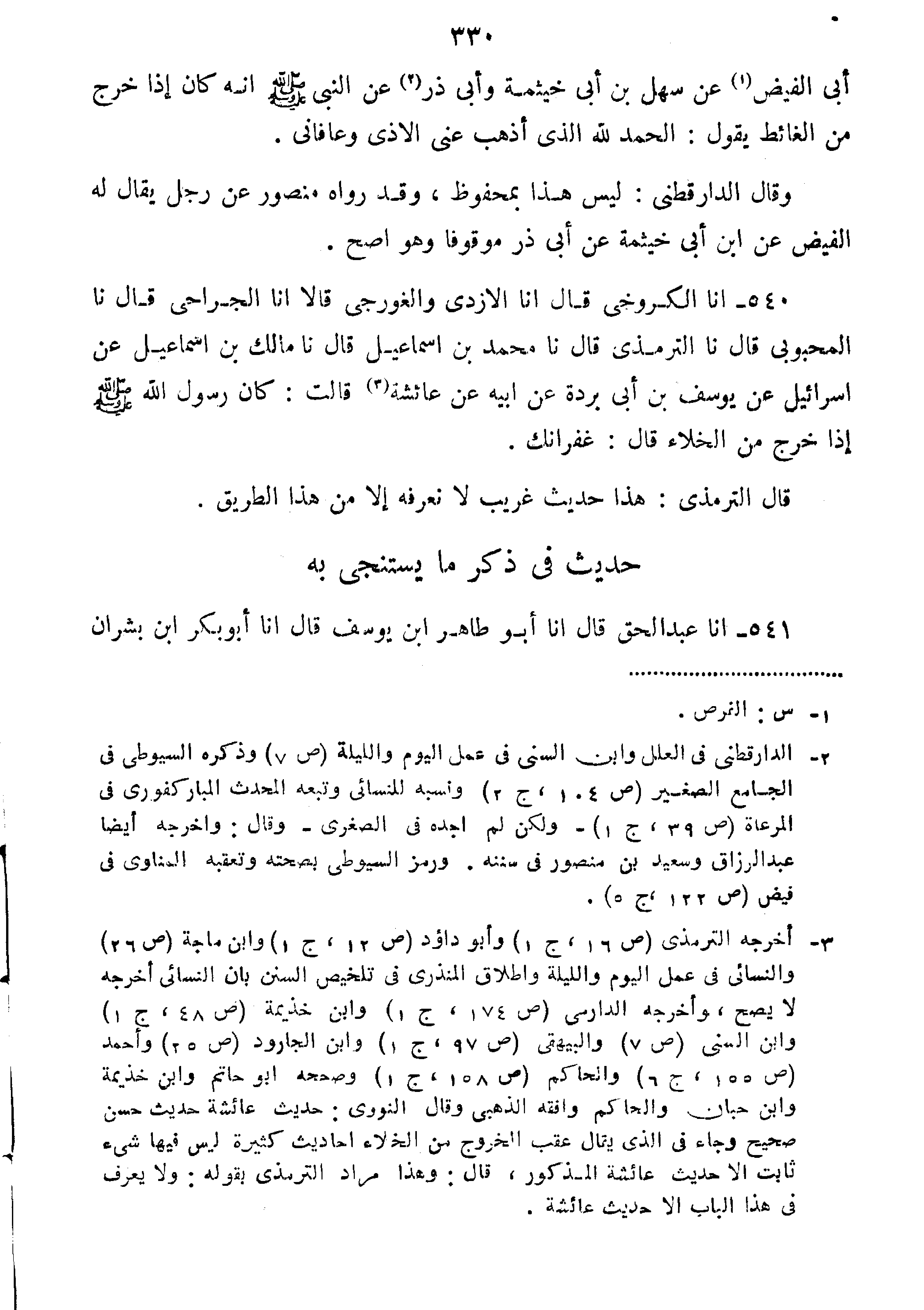 540-أَنَا الْكَرُوخِيُّ قَالَ أَنَا الْأَزْدِيُّ وَالْغُورَجِيُّ قَالا أَنَا الْجِرَاحِيُّ قَالَ نا الْمَحْبُوبِيُّ قَالَ نا التِّرْمِذِيُّ قَالَ نا مُحَمَّدُ بْنُ إِسْمَاعِيلَ قَالَ نا مَالِكُ بْنُ إِسْمَاعِيلَ عَنْ إِسْرَائِيلَ عَنْ يُوسُفَ بْنِ أَبِي بُرْدَةَ عَنْ أَبِيهِ عَنْ عَائِشَةَ قَالَتْ:"كَانَ رَسُولُ اللَّهِ صَلَّى اللَّهُ عَلَيْهِ وَسَلَّمَ إِذَا خَرَجَ مِنَ الْخَلاءِ قَالَ غُفْرَانَكَ".