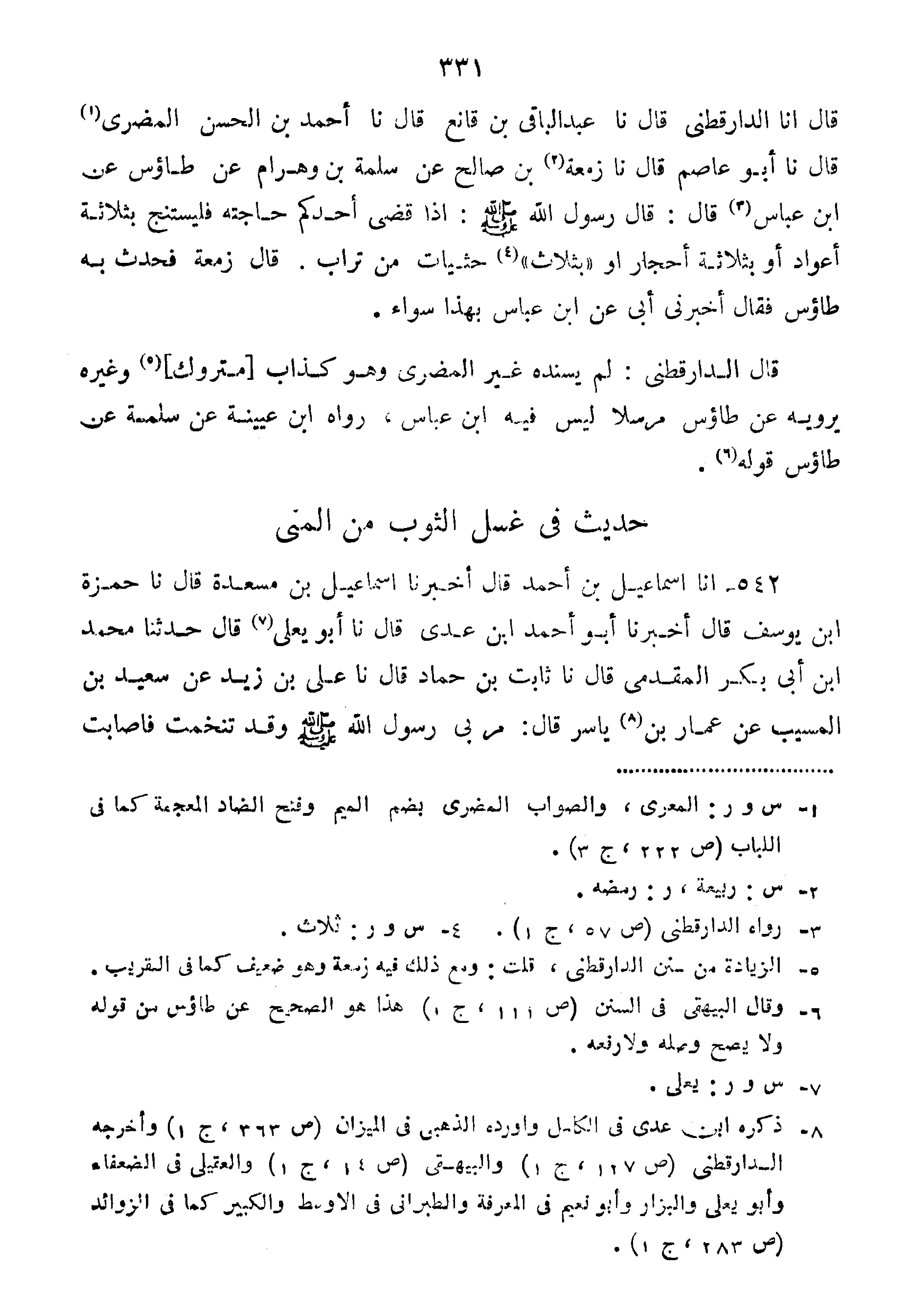 قال أنا الدارقطني قَالَ نا عَبْدُ الْبَاقِي بْنُ قَانِعٍ قَالَ نا أَحْمَدُ بْنُ الْحَسَنِ الْمُضَرِيُّ قَالَ نا أَبُو عَاصِمٍ قَالَ نا زَمْعَةُ بْنُ صَالِحٍ عَنْ سَلَمَةَ بْنِ وَهْرَامَ عَنْ طَاؤُسَ عَنِ ابْنِ عَبَّاسٍ قَالَ: قَالَ رَسُولُ اللَّهِ صَلَّى اللَّهُ عَلَيْهِ وَسَلَّمَ:"إِذَا قَضَى أَحَدُكُمْ حَاجَتَهُ فَلْيَسْتَنْجِ بِثَلاثَةِ أَعْوَادٍ أَوْ بِثَلاثَةِ أَحْجَارٍ أَوْ بِثَلاثِ حَثَيَاتٍ مِنْ تُرَابٍ".