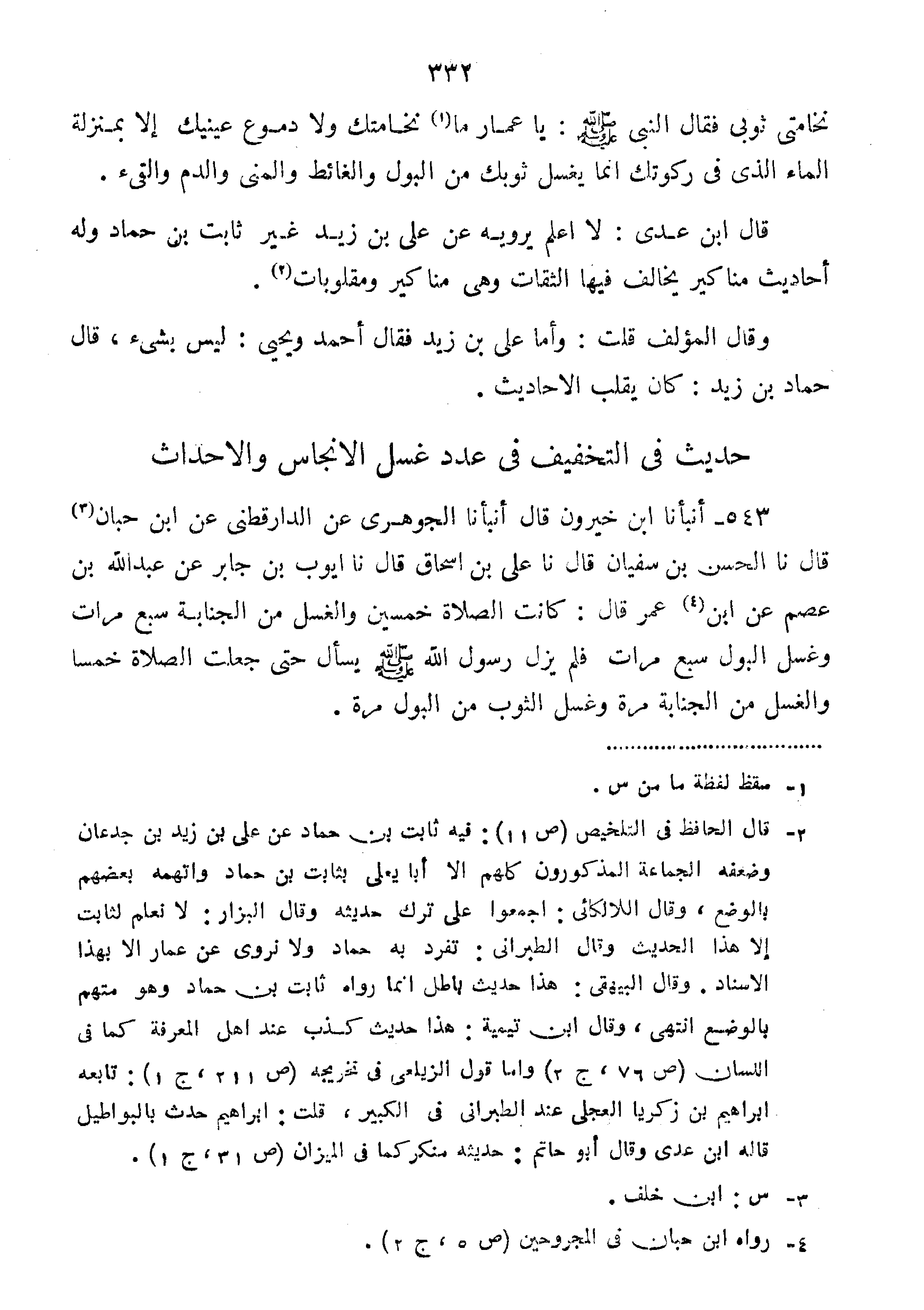 543-أَنْبَأَنَا ابْنُ خَيْرُونَ قَالَ أَنْبَأَنَا الجوهري عن الدارقطني عَنِ ابْنِ حَبَّانَ قَالَ نا الْحَسَنُ بْنُ سُفْيَانَ قَالَ نا عَلِيُّ بْنُ إِسْحَاقَ قَالَ نا أَيُّوبُ بْنُ جَابِرٍ عَنْ عَبْدِ اللَّهِ بْنِ عُصْمٍ عَنِ ابْنِ عُمَرَ قَالَ:" كَانَتِ الصَّلاةُ خَمْسِينَ وَالْغُسْلُ مِنَ الْجَنَابَةِ سَبْعَ مَرَّاتٍ وَغَسْلُ الْبَوْلِ سَبْعَ مَرَّاتٍ فَلَمْ يَزَلْ رَسُولُ اللَّهِ صَلَّى اللَّهُ عَلَيْهِ وَسَلَّمَ يَسْأَلُ حَتَّى جُعِلَتِ الصَّلاةُ خَمْسًا وَالْغُسْلُ مِنَ الْجَنَابَةِ مَرَّةً وَغَسْلُ الثَّوْبِ مِنَ الْبَوْلِ مَرَّةً".