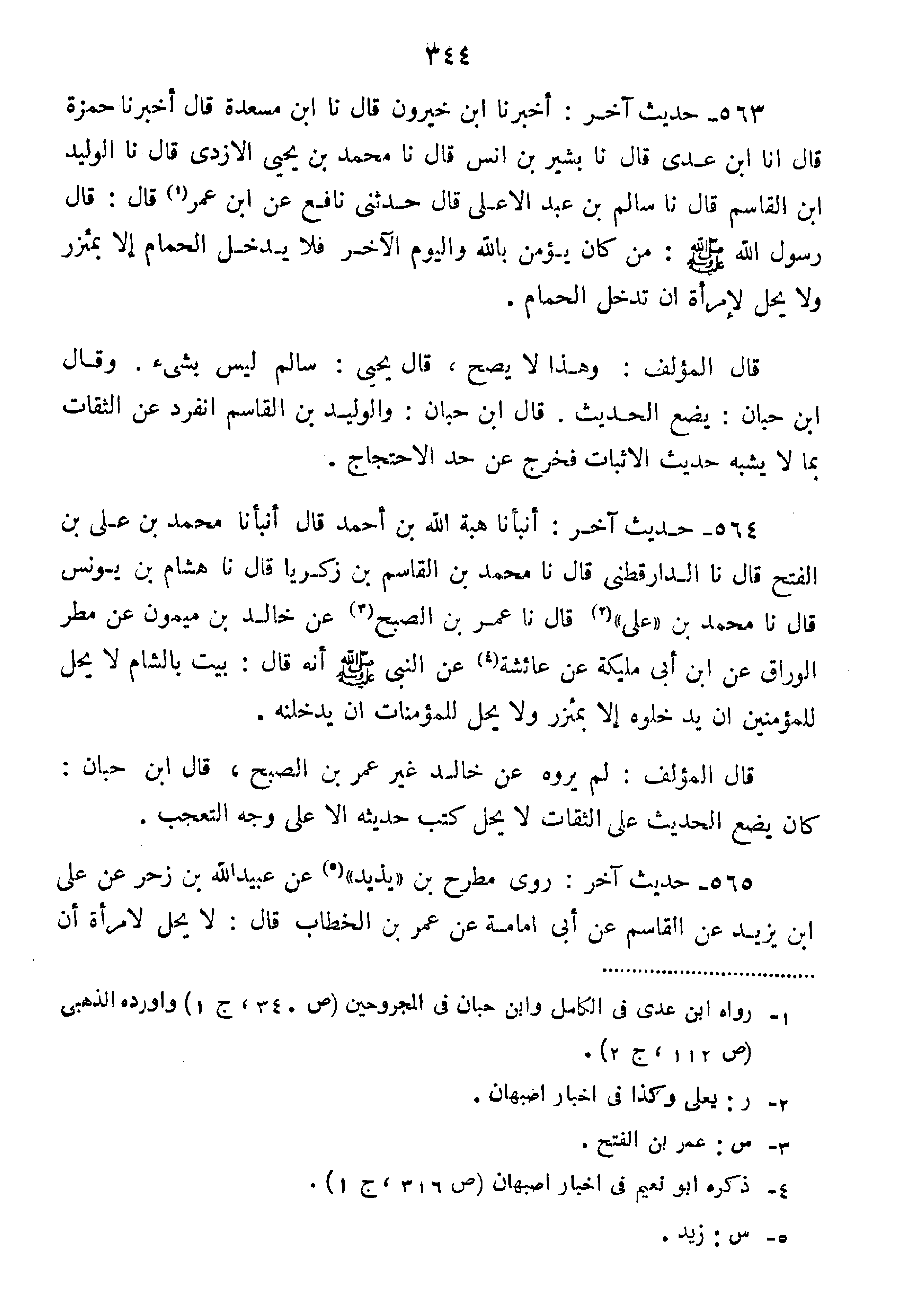 563-حَدِيثُ آخَرُ أَخْبَرَنَا ابْنُ خَيْرُونَ قَالَ أَنَا ابْنُ مَسْعَدَةَ قَالَ أَخْبَرَنَا حَمْزَةُ قَالَ نا ابْنُ عَدِيٍّ قَالَ نا بَشِيرُ بْنُ يروي قَالَ نا مُحَمَّدُ بْنُ يَحْيَى الْأَزْدِيُّ قَالَ نا الْوَلِيدُ بْنُ الْقَاسِمِ قَالَ نا سَالِمُ بْنُ عَبْدِ الأَعْلَى قَالَ حَدَّثَنِي نَافِعٌ عَنِ ابْنِ عُمَرَ قَالَ: قَالَ رَسُولِ اللَّهِ صَلَّى اللَّهُ عَلَيْهِ وَسَلَّمَ:"مَنْ كَانَ يُؤْمِنُ بِاللَّهِ وَالْيَوْمِ الآخِرِ فَلا يَدْخُلِ الْحَمَّامَ إِلا بِمِئْزَرٍ وَلا يَحِلُّ لامْرَأَةٍ أَنْ تَدْخُلَ الْحَمَّامَ".