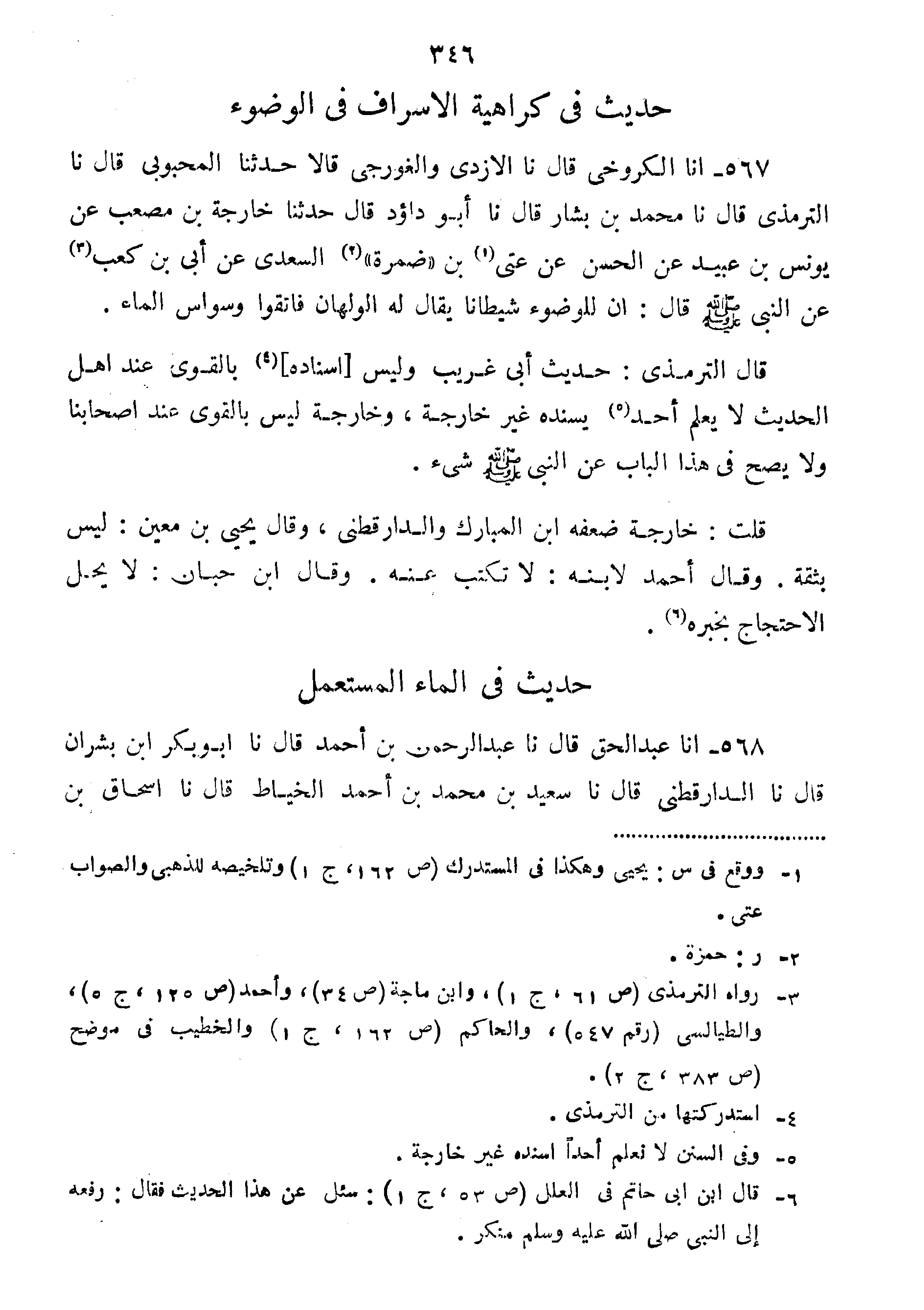 567-أَنَا الْكَرُوخِيُّ قَالَ نا الْأَزْدِيُّ وَالْغُورَجِيُّ قَالا حَدَّثَنَا الْمَحْبُوبِيُّ قَالَ نا التِّرْمِذِيُّ قَالَ نا مُحَمَّدُ بْنُ بَشَّارٍ قَالَ نا أبو داؤد قَالَ حَدَّثَنَا خَارِجَةُ بْنُ مُصْعَبٍ عَنْ يُونُسَ بْنِ عُبَيْدٍ عَنِ الْحَسَنِ عَنْ عُتَيِّ بْنِ ضُمْرَةَ السَّعْدِيِّ عَنْ أُبَيِّ بْنِ كَعْبٍ عَنِ النَّبِيِّ صَلَّى اللَّهُ عَلَيْهِ وسلم قال:" إن للوضوء شيطنا يُقَالُ لَهُ الْوَلْهَانُ فَاتَّقُوا وُسْوَاسَ الْمَاءِ".