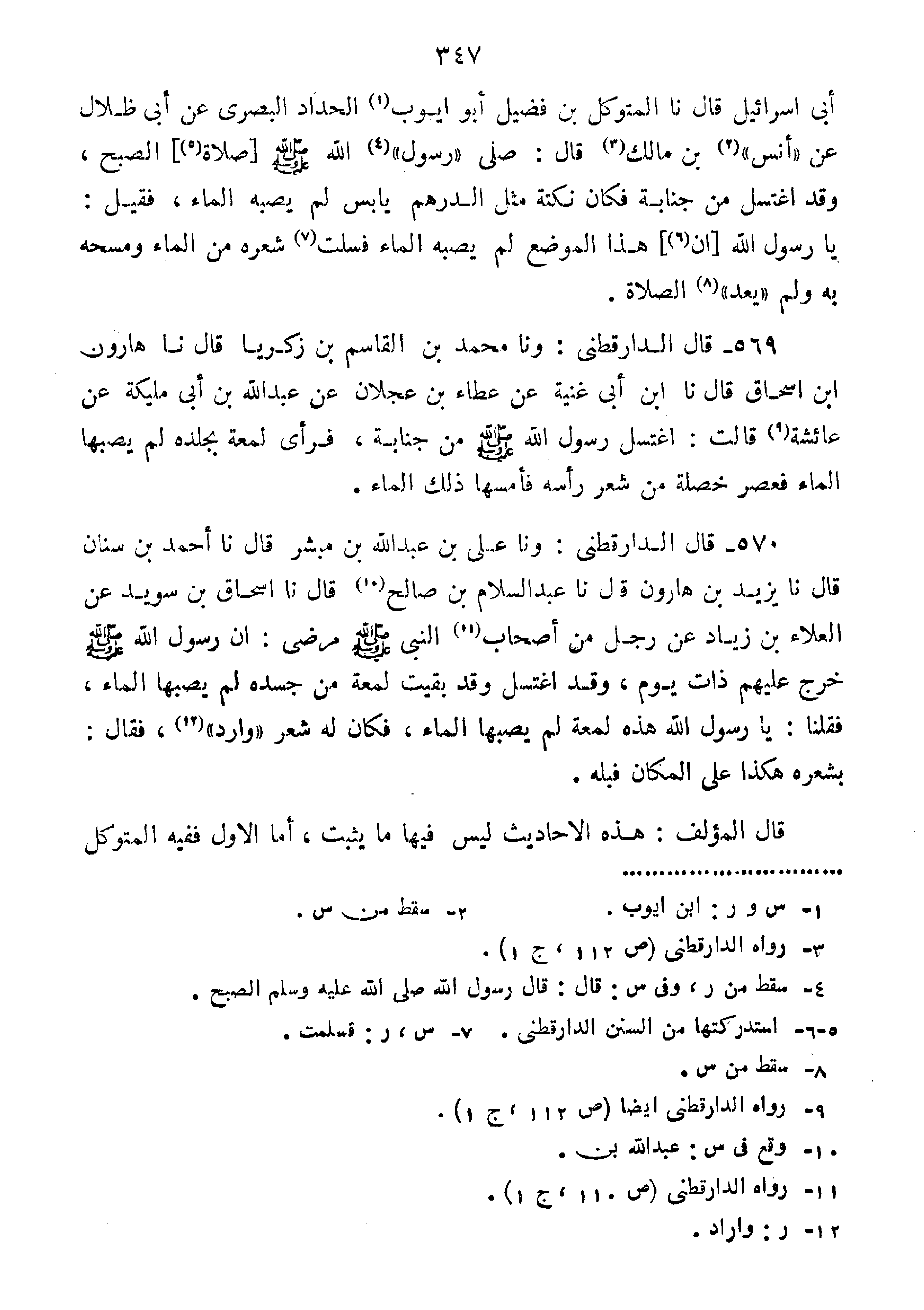 قال الدارقطني: وَنا عَلِيُّ بْنُ عَبْدِ اللَّهِ بْنِ مُبَشِّرٍ قَالَ نا أَحْمَدُ بْنُ سِنَانٍ قَالَ نا يَزِيدُ بْنُ هَارُونَ قَالَ نا عَبْدُ السَّلامِ بْنُ صَالِحٍ قَالَ نا إِسْحَاقُ بْنُ سُوَيْدٍ عَنِ الْعَلاءِ بْنِ زِيَادٍ عَنْ رَجُلٍ مِنْ أَصْحَابِ النَّبِيِّ صَلَّى اللَّهُ عَلَيْهِ وَسَلَّمَ مَرْضِيٍّ:" أَنَّ رَسُولَ اللَّهِ صَلَّى اللَّهُ عَلَيْهِ وَسَلَّمَ خَرَجَ عَلَيْهِمْ ذَاتَ يَوْمٍ وَقَدِ اغْتَسَلَ لَمْعَةٌ مِنْ جَسَدِهِ لَمْ يُصِبْهَا الْمَاءُ فَقُلْنَا يَا رَسُولَ اللَّهِ هَذِهِ لَمْعَةٌ لَمْ يُصِبْهَا الْمَاءُ فَكَانَ لَهُ شَعْرٌ وَارِدٌ فَقَالَ بِشَعْرِهِ هَكَذَا عَلَى الْمَكَانِ فَبَلَّهُ".