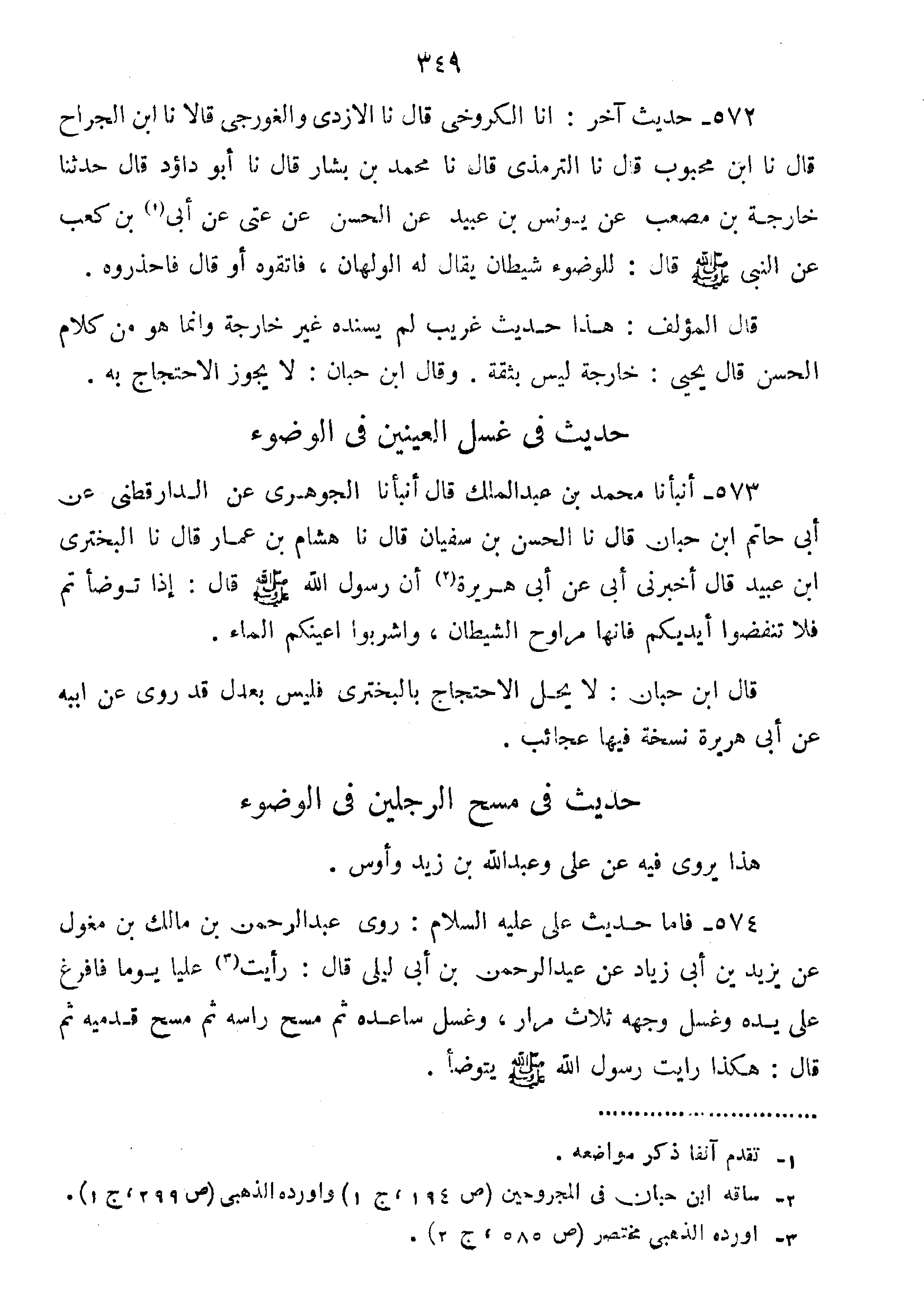 574-فَأَمَّا حَدِيثُ عَلِيٍّ عَلَيْهِ السَّلامُ رَوَى عَبْدُ الرَّحْمَنِ بْنُ مَالِكِ بْنِ مِغْوَلٍ عَنْ يَزِيدَ بْنِ أَبِي زِيَادٍ عَنْ عَبْدِ الرَّحْمَنِ بْنِ أَبِي لَيْلَى قَالَ رَأَيْتُ عَلِيًّا يَوْمًا فَأَفْرَغَ عَلَى يَدِهِ وَغَسَلَ وَجْهَهُ ثَلاثَ مِرَارٍ وَغَسَلَ سَاعِدَهُ ثُمَّ مَسَحَ رَأْسَهُ ثُمَّ مَسَحَ قَدَمَيْهِ ثُمَّ قَالَ:" هَكَذَا رَأَيْتُ رَسُولَ اللَّهِ صَلَّى اللَّهُ عَلَيْهِ وَسَلَّمَ يَتَوَضَّأُ".