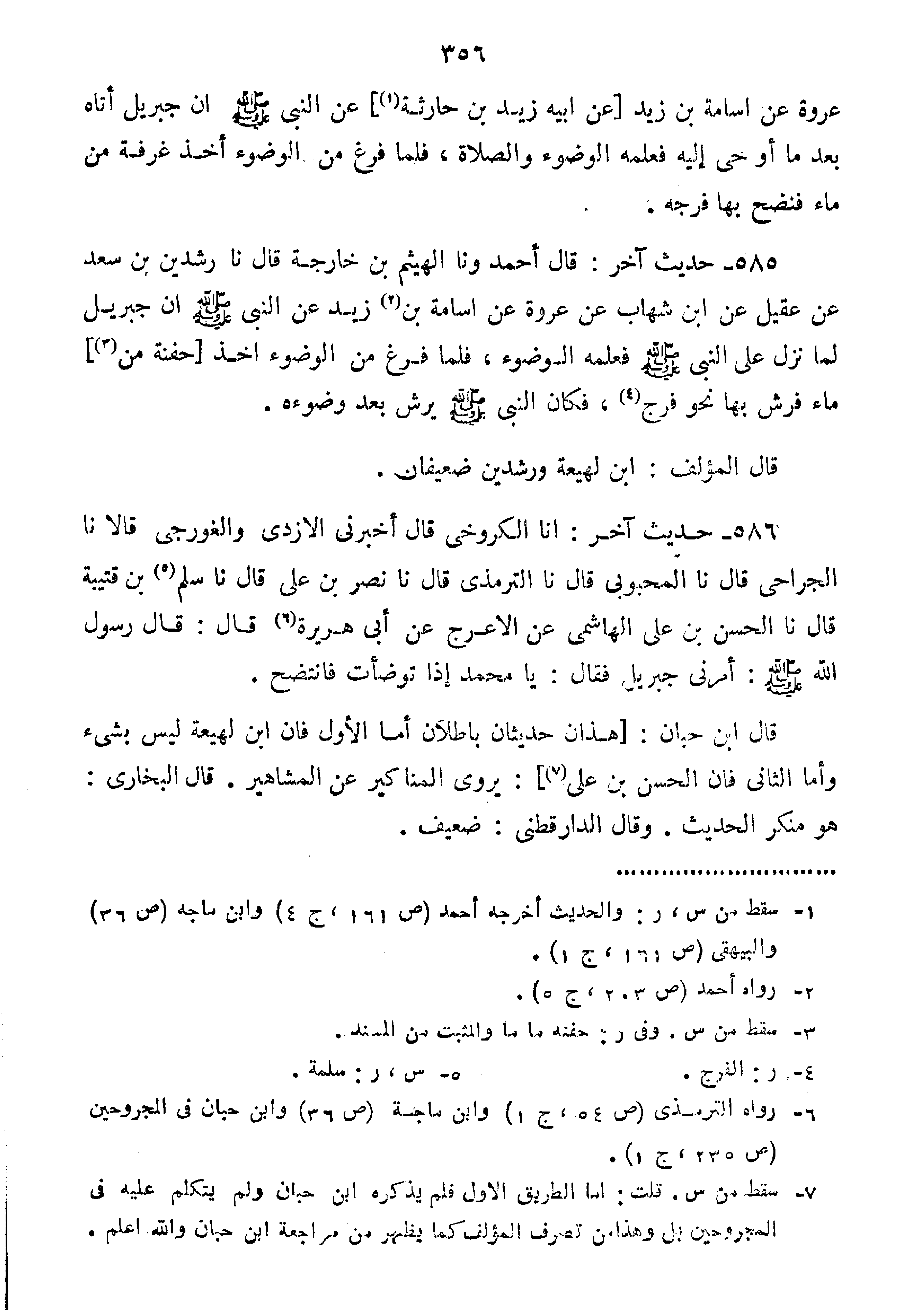 585-حَدِيثُ آخَرُ. قَالَ أَحْمَدُ: وَنا الْهَيْثَمُ بْنُ خَارِجَةَ قَالَ نا رَشْدَيْنُ بْنُ سَعْدٍ عَنْ عَقِيلٍ عَنِ ابْنِ شِهَابٍ عَنْ عُرْوَةَ عَنْ أُسَامَةَ بْنِ زَيْدٍ عَنِ النَّبِيِّ صَلَّى اللَّهُ عَلَيْهِ وَسَلَّمَ "أَنَّ جِبْرِيلَ لَمَّا نَزَلَ عَلَى النَّبِيِّ صَلَّى اللَّهُ عَلَيْهِ وَسَلَّمَ فَعَلَّمَهُ الْوُضُوءَ فَلَمَّا فَرَغَ مِنَ الْوُضُوءِ أَخَذَ حَفْنَةً مِنْ ماء فرش بها نحو فرج فكان النبي صل يَرُشُّ بَعْدَ وُضُوئِهِ".