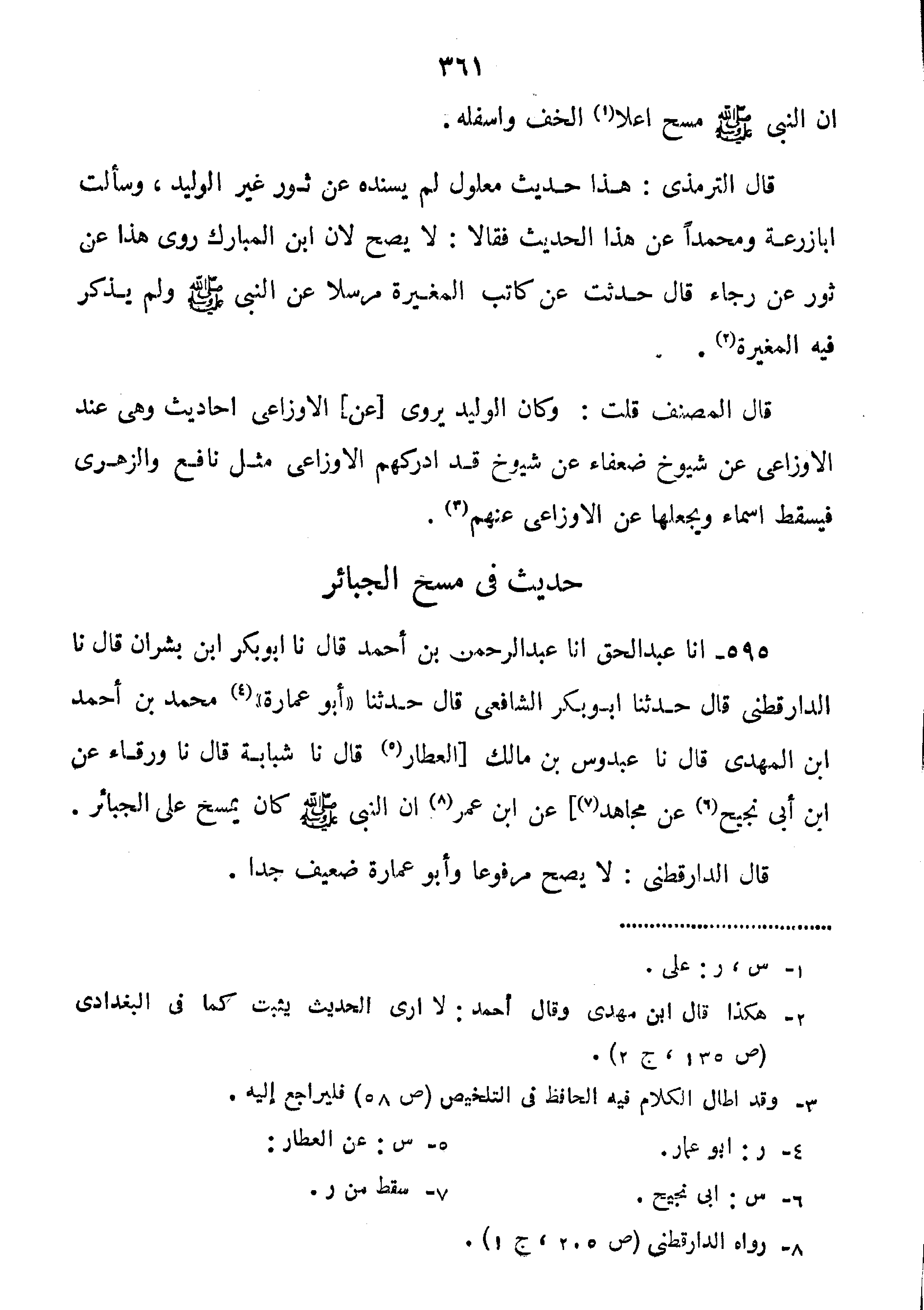 595-أَنَا عَبْدُ الْحَقِّ أَنَا عَبْدُ الرَّحْمَنِ بْنُ أَحْمَدَ قال أَبُو بَكْرِ بْنُ بِشْرَانَ قَالَ نا الدارقطني قَالَ حَدَّثَنَا أَبُو بَكْرٍ الشَّافِعِيُّ قَالَ حَدَّثَنَا أَبُو عُمَارَةَ مُحَمَّدُ بن حمد بن المهدي قال بْنُ مَالِكٍ الْعَطَّارُ قَالَ نا شُبَابَةُ قَالَ نا وَرْقَاءُ عَنِ بن أَبِي نُجَيْحٍ عَنْ مُجَاهِدٍ عَنِ ابْنِ عُمَرَ " أَنّ النَّبِيَّ صَلَّى اللَّهُ عَلَيْهِ وَسَلَّمَ كَانَ يَمْسَحُ على الجبائر".