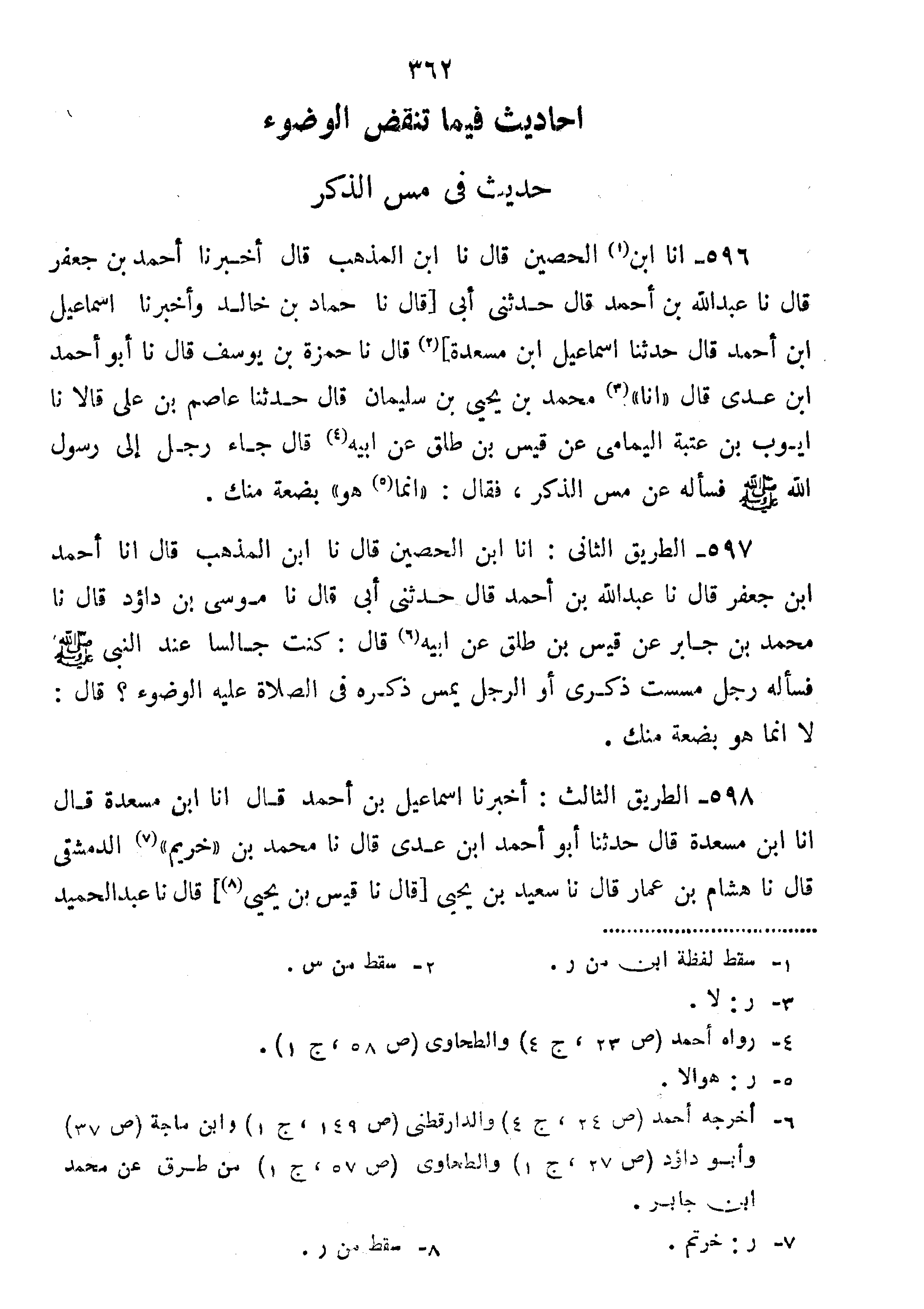 596-أَنَا ابْنُ الْحُصَيْنِ قَالَ نا ابْنُ الْمُذْهِبِ قَالَ أَخْبَرَنَا أَحْمَدُ بْنُ جَعْفَرٍ قَالَ نا عَبْدُ اللَّهِ بْنُ أَحْمَدَ قَالَ حَدَّثَنِي أَبِي قَالَ نا حَمَّادُ بْنُ خالد وأخبرنا إسماعيل ابن أَحْمَدَ قَالَ حَدَّثَنَا إِسْمَاعِيلُ بْنُ مَسْعَدَةَ قَالَ نا حَمْزَةُ بْنُ يُوسُفَ قَالَ نا أَبُو أَحْمَدَ بْنُ عَدِيٍّ قَالَ نا مُحَمَّدُ بْنُ يَحْيَى بْنِ سُلَيْمَانَ قَالَ حَدَّثَنَا عَاصِمُ بْنُ عَلِيٍّ قَالا نا أَيُّوبُ بْنُ عُتْبَةَ الْيَمَامِيُّ عَنْ قَيْسِ بْنِ طَلْقٍ عَنْ أَبِيهِ قَالَ جَاءَ رَجُلٌ إِلَى رَسُولِ اللَّهِ صَلَّى اللَّهُ عَلَيْهِ وَسَلَّمَ فَسَأَلَهُ عَنْ مَسِّ الذَّكَرِ فَقَالَ:" إِنَّمَا هُوَ بِضْعَةٌ مِنْكَ".