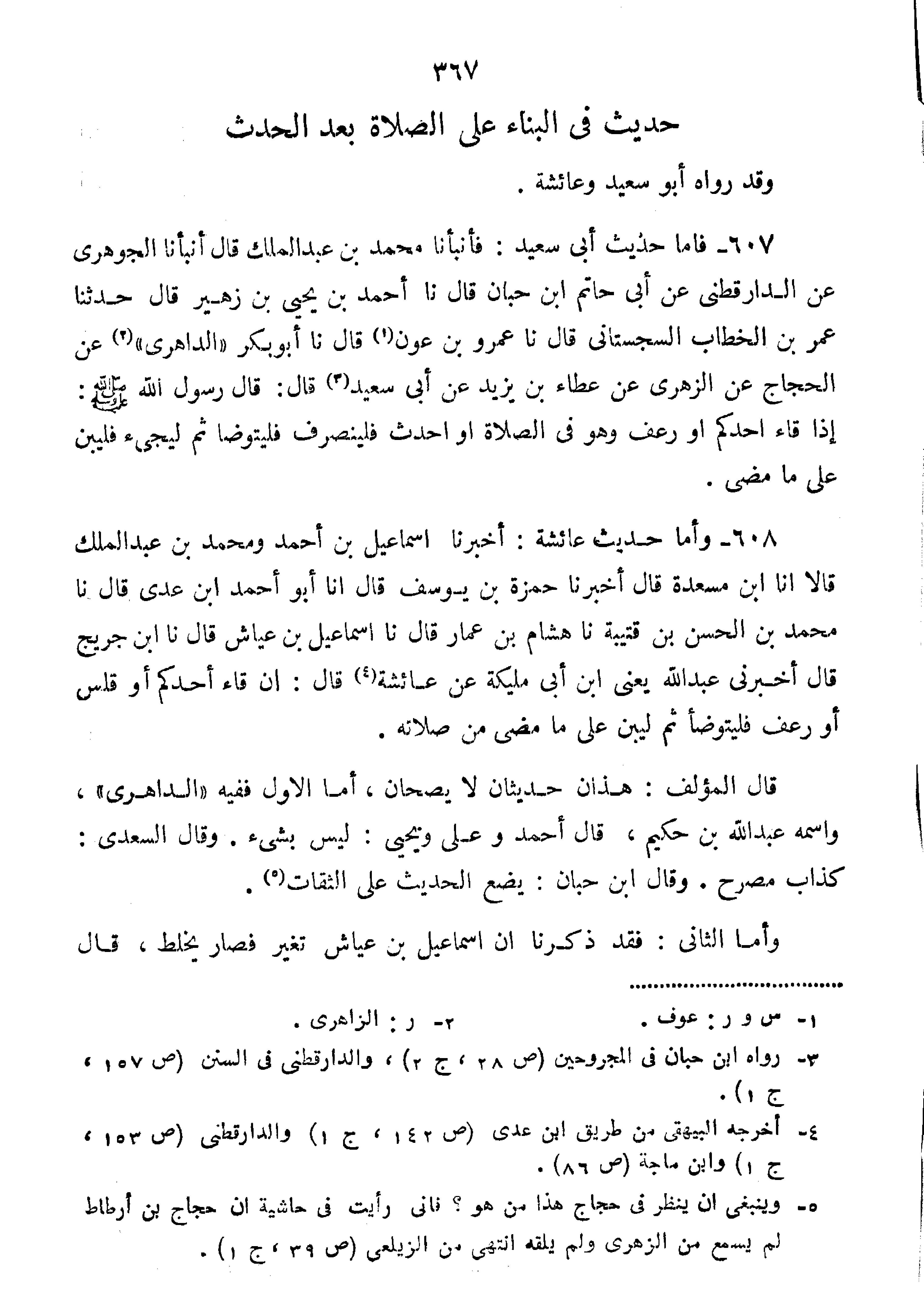 607--فَأَمَّا حَدِيثُ أَبِي سَعِيدٍ فَأَنْبَأَنَا مُحَمَّدُ بْنُ عَبْدِ الْمَلِكِ قَالَ أَنْبَأَنَا الْجَوْهَرِيُّ عَنِ الدارقطني عَنْ أَبِي حَاتِمِ بْنِ حَبّانَ قَالَ نا أَحْمَدُ بْنُ يَحْيَى بْنِ زُهَيْرٍ قَالَ حَدَّثَنَا عُمَرُ بْنُ الْخَطَّابِ السِّجِسْتَانِيُّ قَالَ نا عمرو بن عون قال أن أَبُو بَكْرٍ الدَّاهِرِيُّ عَنِ الْحَجَّاجِ عَنِ الزُّهْرِيِّ عَنْ عَطَاءِ بْنِ يَزِيدَ عَنْ أَبِي سَعِيدٍ قَالَ: قَالَ رَسُولُ اللَّهِ صَلَّى اللَّهُ عَلَيْهِ وَسَلَّمَ:" إِذَا قَاءَ أَحَدُكُمْ أَوْ رَعَفَ وَهُوَ فِي الصَّلاةِ أَوْ أَحْدَثَ فَلْيَنْصَرِفْ فَلْيَتَوَضَّأْ ثُمَّ ليجيء فَلْيَبْنِ عَلَى مَا مَضَى".