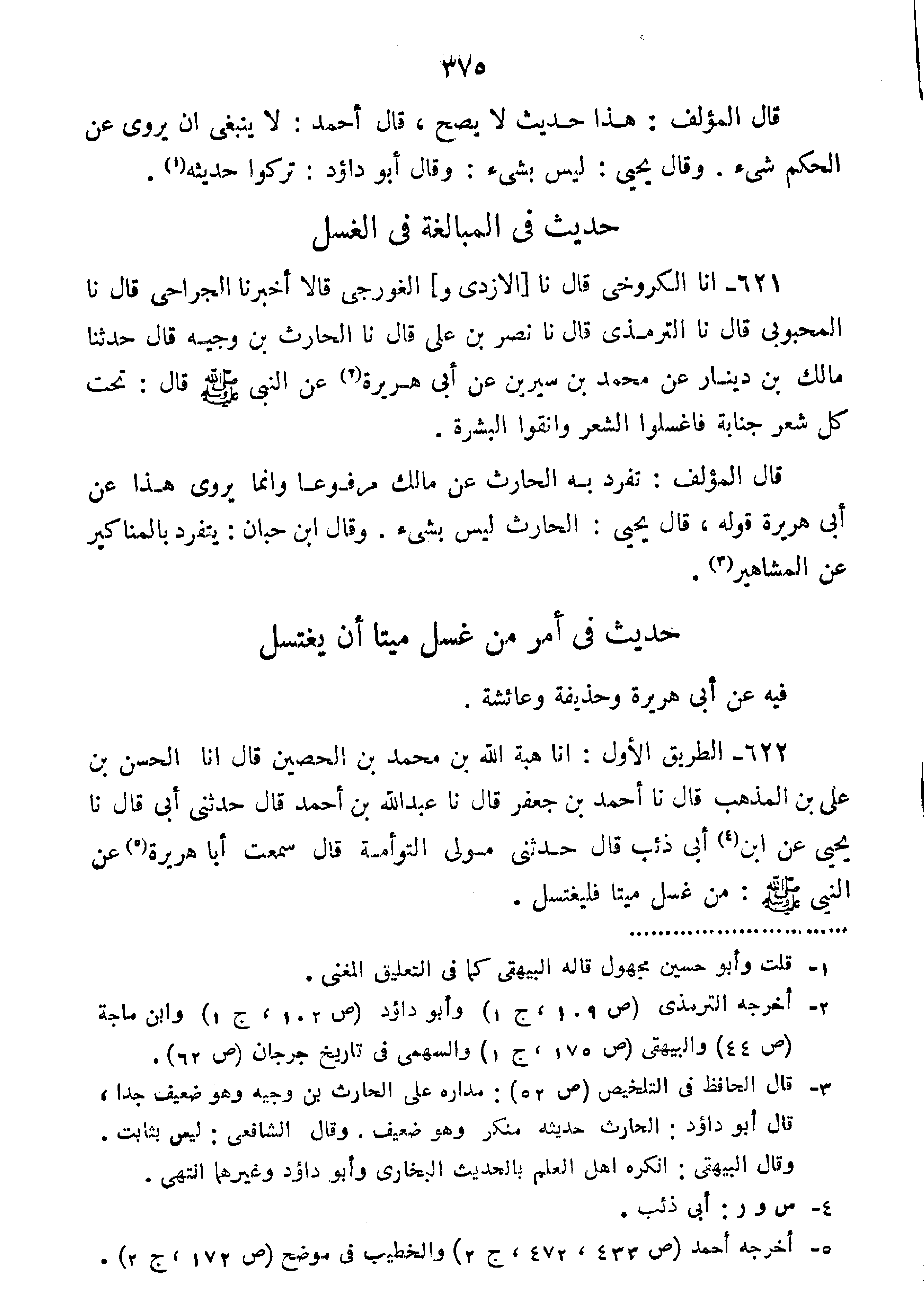 622-الطَّرِيقُ الأَوَّلُ أَنَا هِبَةُ بْنُ مُحَمَّدِ بْنِ الْحُصَيْنِ قَالَ أَنَا الحسن بن علي ابْنُ الْمُذْهِبِ قَالَ نا أَحْمَدُ بْنُ جَعْفَرٍ قَالَ نا عَبْدُ اللَّهِ بْنُ أَحْمَدَ قَالَ حَدَّثَنِي أَبِي قَالَ نا يَحْيَى عَنِ ابْنِ أَبِي ذِئْبٍ قَالَ حَدَّثَنِي مَوْلَى التَّوْأَمَةِ قَالَ سَمِعْتُ أَبَا هُرَيْرَةَ عَنِ النَّبِيِّ صَلَّى اللَّهُ عَلَيْهِ وَسَلَّمَ قَالَ:" مَنْ غَسَلَ مَيِّتًا فَلْيَغْتَسِلْ".
