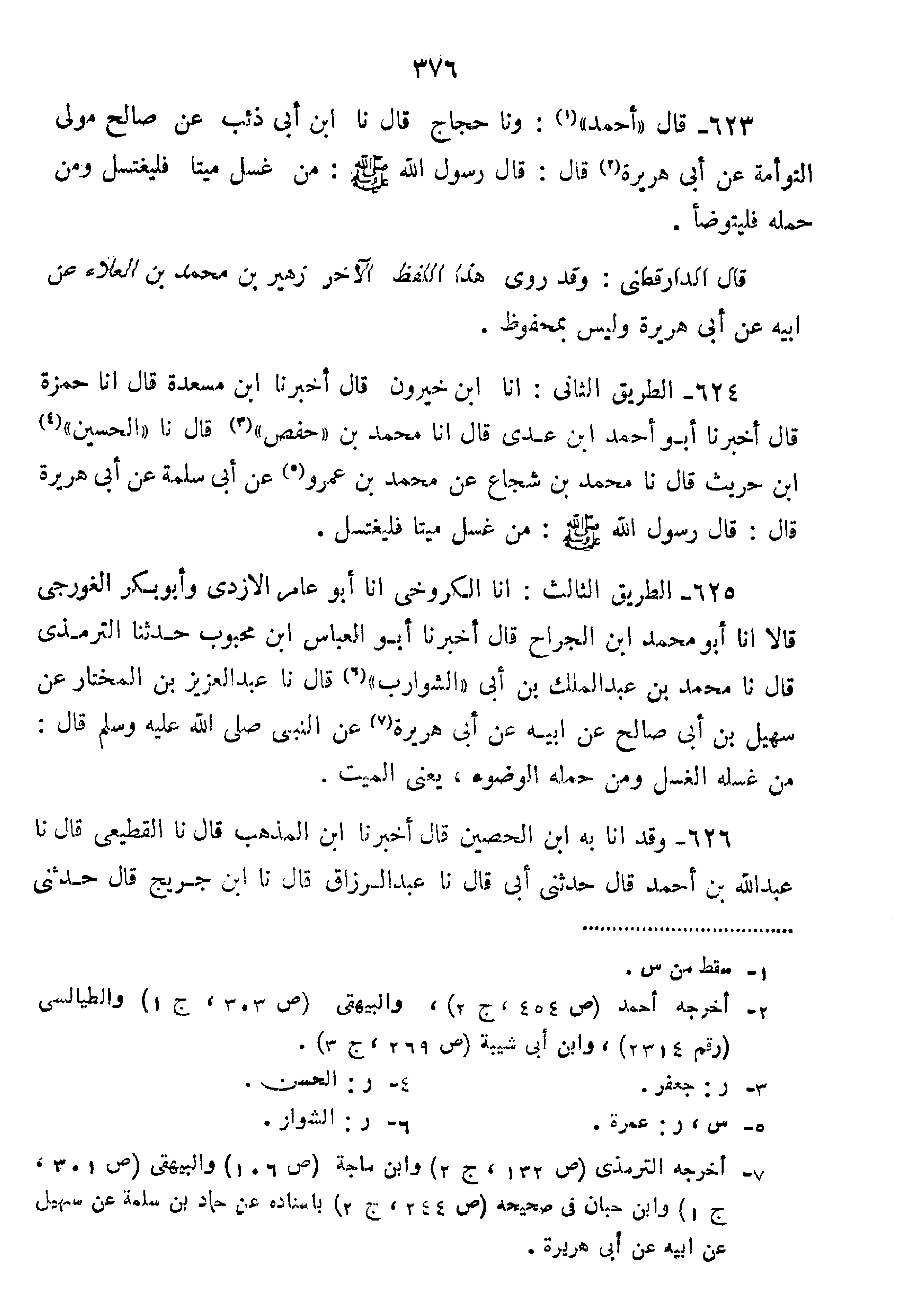 624-لطريق الثَّانِي أَنَا ابْنُ خَيْرُونَ قَالَ أَخْبَرَنَا ابْنُ مَسْعَدَةَ قَالَ أَنَا حَمْزَةُ قَالَ أَخْبَرَنَا أَبُو أَحْمَدَ ابن عَدِيٍّ قَالَ أَنَا مُحَمَّدُ بْنُ حفص قال نا الحسين ابن حَرِيثٍ قَالَ نا مُحَمَّدُ بْنُ شُجَاعٍ عَنْ مُحَمَّدِ بْنِ عَمْرٍو عَنْ أَبِي سَلَمَةَ عَنْ أَبِي هُرَيْرَةَ قَالَ: قَالَ رَسُولُ اللَّهِ صَلَّى اللَّهُ عَلَيْهِ وَسَلَّمَ:"مَنْ غَسَّلَ مَيِّتًا فَلْيَغْتَسِلْ".
