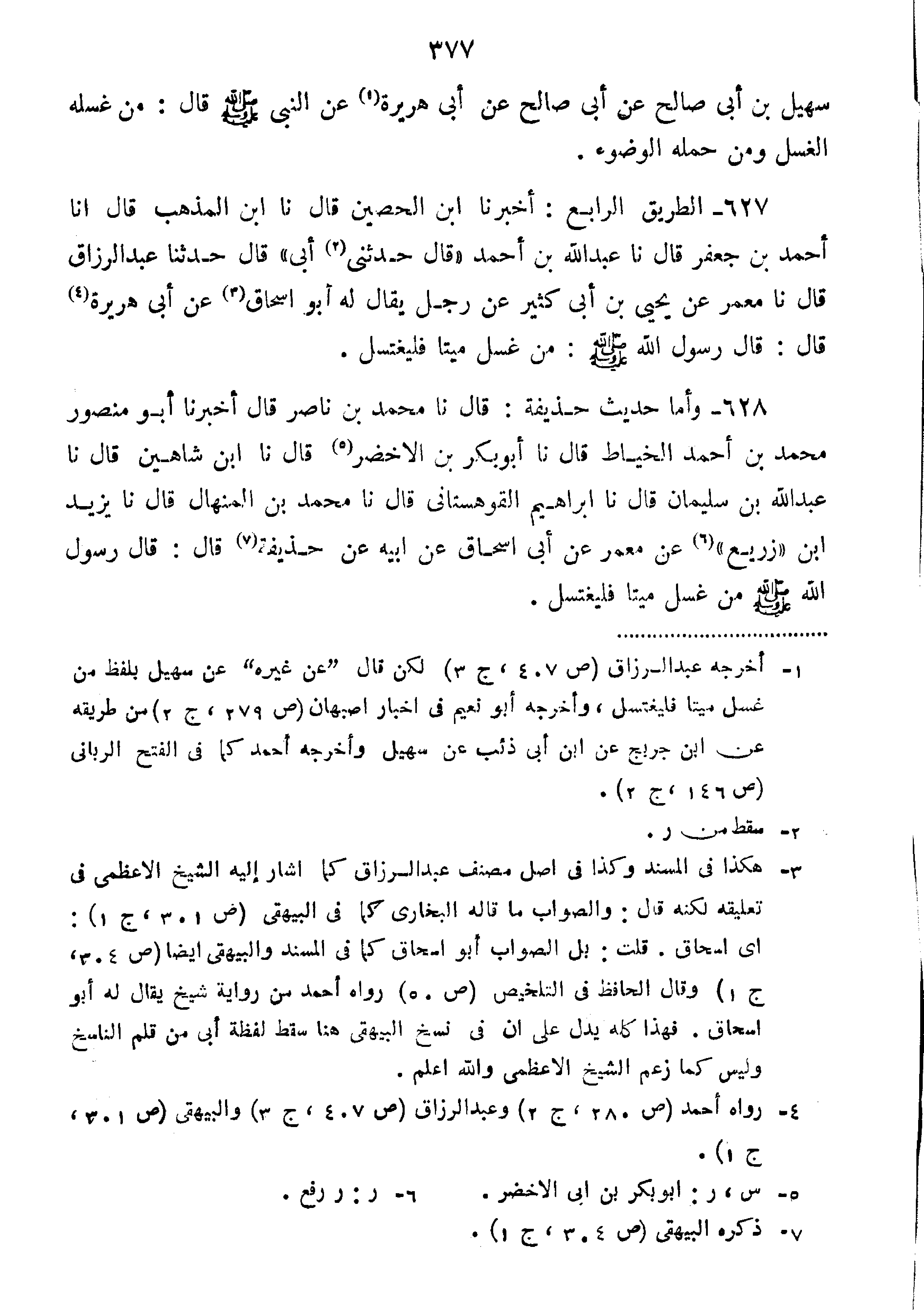 627-الطَّرِيقُ الرَّابِعُ أَخْبَرَنَا ابْنُ الْحُصَيْنِ قَالَ نا ابْنُ الْمُذْهِبِ قَالَ أَنَا أَحْمَدُ بْنُ جَعْفَرٍ قَالَ نا عَبْدُ اللَّهِ بْنُ أَحْمَدَ قَالَ حَدَّثَنِي أبي قل حَدَّثَنَا عَبْدُ الرَّزَّاقِ قَالَ نا مَعْمَرٌ عَنْ يَحْيَى بْنِ أَبِي كَثِيرٍ عَنْ رَجُلٍ يُقَالُ لَهُ أَبُو إِسْحَاقَ عَنْ أَبِي هُرَيْرَةَ قَالَ: قَالَ رَسُولُ اللَّهِ صَلَّى اللَّهُ عَلَيْهِ وَسَلَّمَ:"مَنْ غَسَّلَ مَيِّتًا فَلْيَغْتَسِلْ".