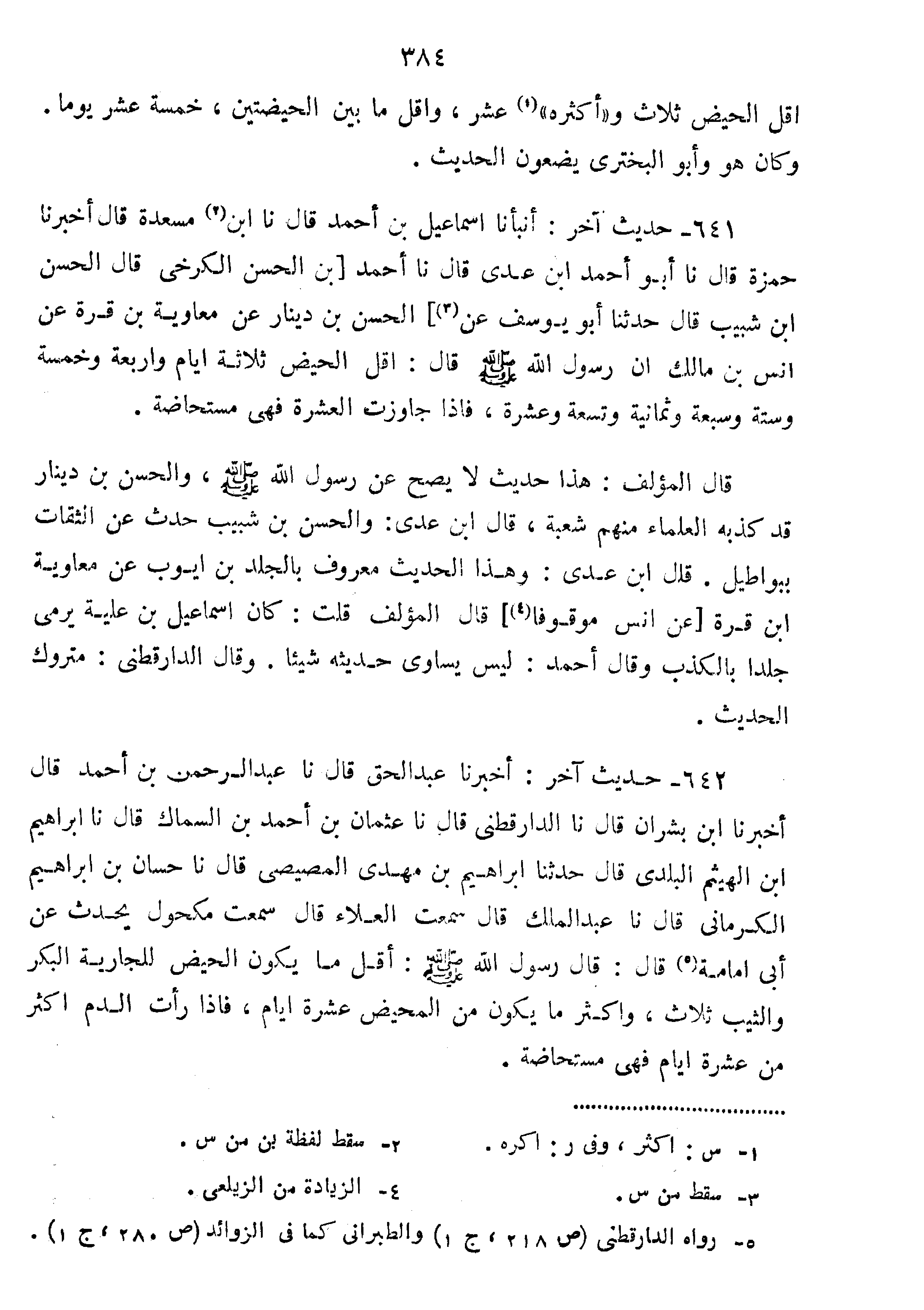 641-حَدِيثُ آخَرُ أَنْبَأَنَا إِسْمَاعِيلُ بْنُ أَحْمَدَ قَالَ نا ابْنُ مَسْعَدَةَ قَالَ أَخْبَرَنَا حَمْزَةُ قَالَ نا أَبُو أَحْمَدَ بْنُ عَدِيٍّ قَالَ نا أَحْمَدُ بن حسن الْكَرْخِيِّ قَالَ الْحَسَنُ بْنُ شَبِيبٍ قَالَ حَدَّثَنَا أَبُو يُوسُفَ عَنْ الْحَسَنِ بْنِ دِينَارٍ عَنْ مُعَاوِيَةَ بْنِ قُرَّةَ عَنْ أَنَسِ بْنِ مَالِكٍ أَنّ رَسُولَ اللَّهِ صَلَّى اللَّهُ عَلَيْهِ وَسَلَّمَ قَالَ:" أَقَلُّ الْحَيْضِ ثَلاثَةُ أَيَّامٍ وَأَرْبَعَةٌ وَخَمْسَةٌ وَسِتَّةٌ وَسَبْعَةٌ وَثَمَانِيَةٌ وَتِسْعَةٌ وَعَشْرَةٌ فإذا جاوزت العشر فَهِيَ مُسْتَحَاضَةٌ".