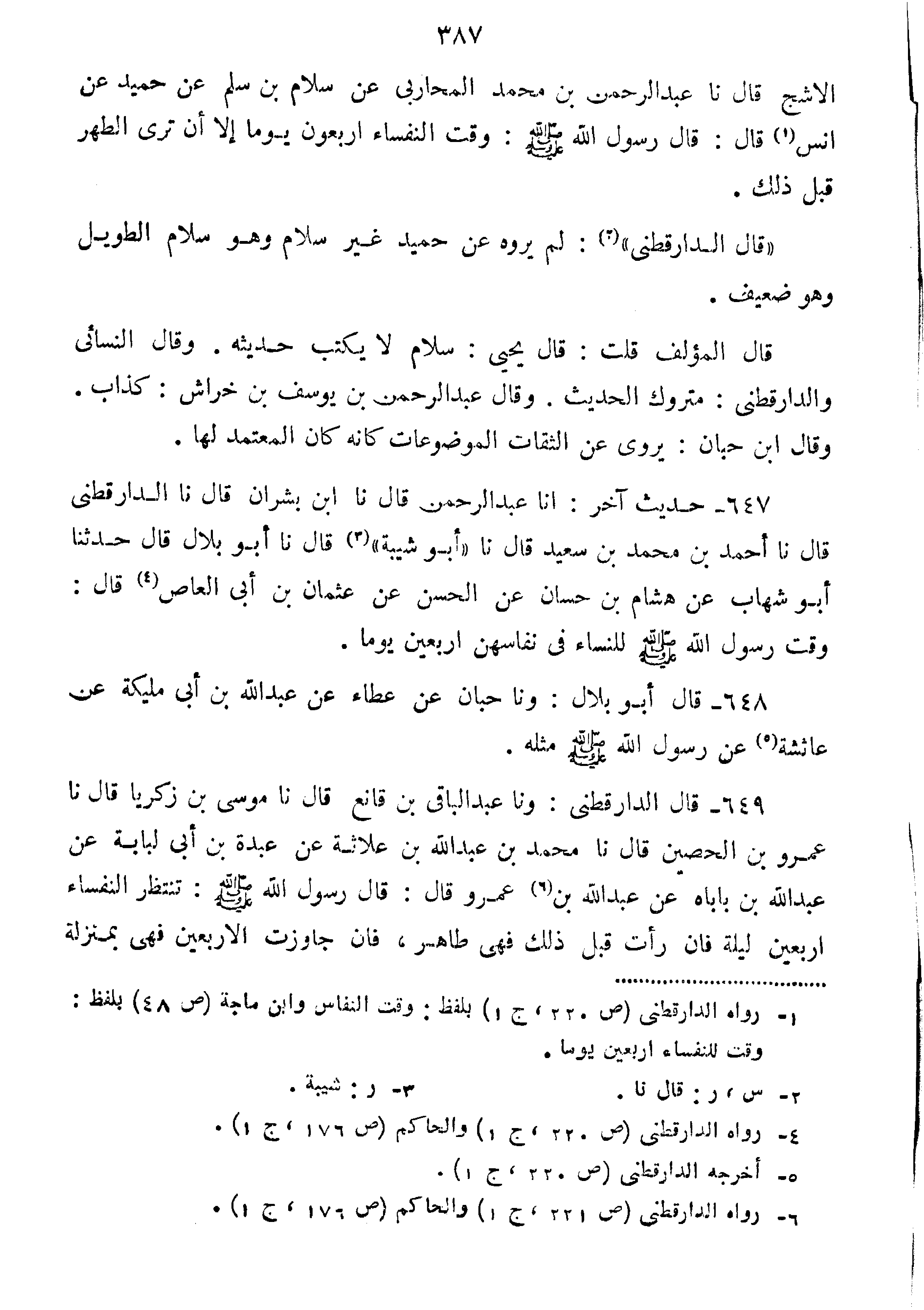 649-.قال الدارقطني: وَنا عَبْدُ الْبَاقِي بْنُ قَانِعٍ قَالَ نا مُوسَى بْنُ زَكَرِيَّا قَالَ نا عَمْرُو بْنُ الْحُصَيْنِ قَالَ نا مُحَمَّدُ بْنُ عَبْدِ اللَّهِ بْنِ عُلاثَةَ عَنْ عَبْدَةَ بْنِ أَبِي لُبَابَةَ عَنْ عَبْدِ اللَّهِ بْنِ بَابَاهِ عَنْ عَبْدِ اللَّهِ بْنِ عَمْرٍو قَالَ: قَالَ رَسُولِ اللَّهِ صَلَّى اللَّهُ عَلَيْهِ وَسَلَّمَ:"تَنْتَظِرُ النُّفَسَاءُ أَرْبَعِينَ لَيْلَةً فَإِنْ رَأَتْ قَبْلَ ذَلِكَ فَهِيَ طَاهِرٌ فَإِنْ جَاوَزَتِ الأَرْبَعِينَ فَهِيَ بِمَنْزِلَةِ