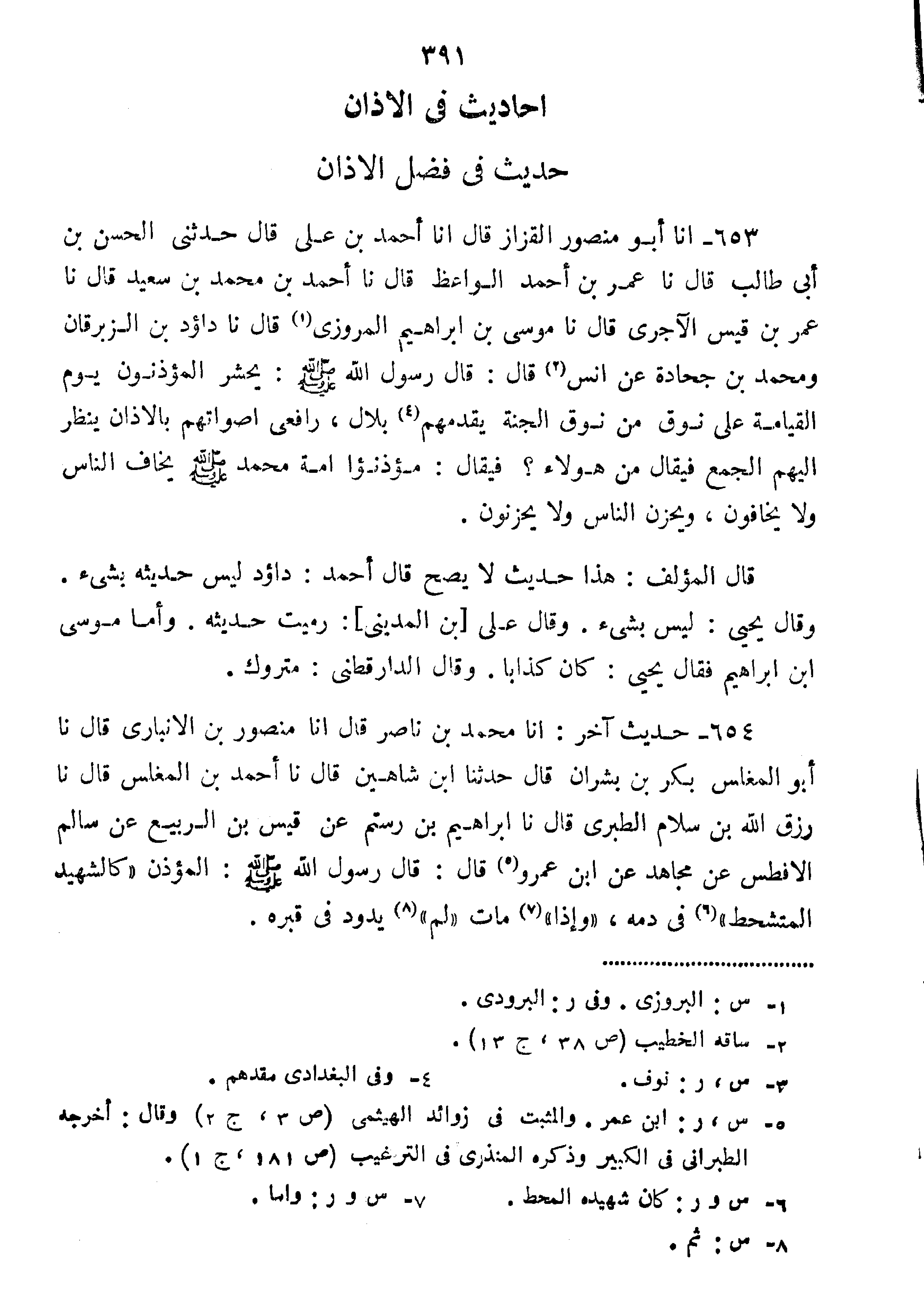 653-أَنَا أَبُو مَنْصُورٍ القزاز قَالَ أَنَا مُحَمَّدُ بْنُ عَلِيٍّ قَالَ حَدَّثَنِي الْحَسَنُ بْنُ أَبِي طَالِبٍ قَالَ نا عُمَرُ بْنُ أَحْمَدَ الْوَاعِظُ قَالَ نا أَحْمَدُ بْنُ مُحَمَّدِ بْنِ سَعِيدٍ قَالَ نا عُمَرُ بْنُ قَيْسٍ الآجُرِّيُّ قَالَ نا مُوسَى بْنُ إِبْرَاهِيمَ المروزي قال نا داؤد بْنُ الزِّبْرِقَانُ وَمُحَمَّدُ بْنُ جِحَادَةَ عَنْ أَنَسٍ قَالَ: قَالَ رَسُولُ اللَّهِ صَلَّى اللَّهُ عَلَيْهِ وَسَلَّمَ:" يُحْشَرُ الْمُؤَذِّنُونَ يَوْمَ الْقِيَامَةِ عَلَى نُوقٍ مِنْ نُوقِ الْجَنَّةِ يَقْدُمُهَا بِلالٌ رَافِعِي أَصْوَاتِهِمْ بِالآذَانِ يَنْظُرُ إِلَيْهِمُ الْجَمْعُ فَيُقَالُ مَنْ هَؤُلاءِ فيقال مؤذنوا أُمَّةِ مُحَمَّدٍ صَلَّى اللَّهُ عَلَيْهِ وَسَلَّمَ يَخَافُ النَّاسُ وَلا يَخَافُونَ وَيَحْزَنُ النَّاسُ وَلا يَحْزَنُونَ".