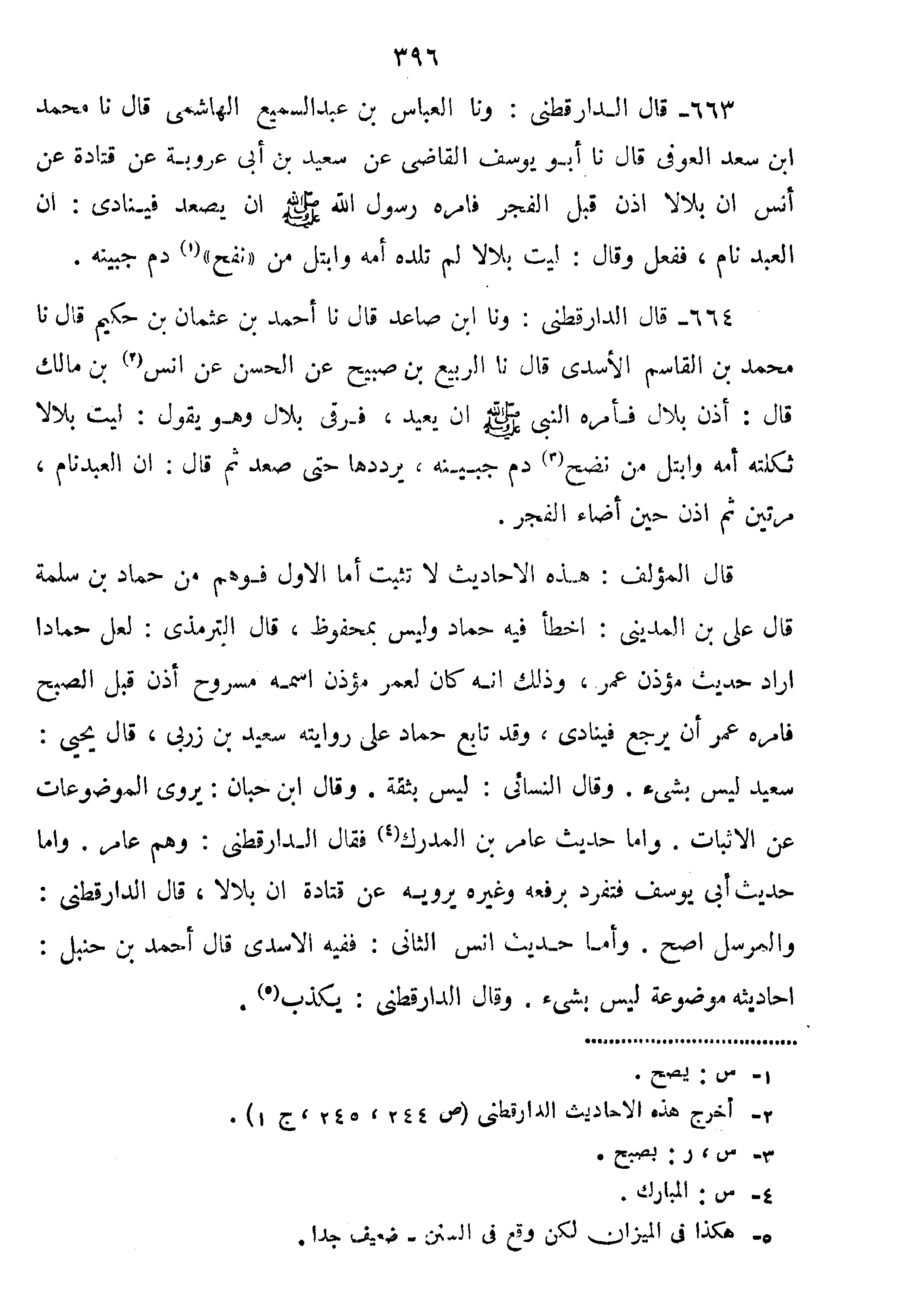 663-.قال الدارقطني: وَنا الْعَبَّاسُ بْنُ عَبْدِ السَّمِيعِ الْهَاشِمِيُّ قَالَ نا مُحَمَّدُ بْنُ ابن سَعْدِ الْعَوْفِيُّ قَالَ نا أَبُو يُوسُفَ الْقَاضِي عَنْ سَعِيدِ بْنِ أَبِي عَرُوبَةَ عَنْ قَتَادَةَ عَنْ أَنَسٍ أَنَّ بِلالا أَذَّنَ قَبْلَ الْفَجْرِ فَأَمَرَهُ رَسُولُ اللَّهِ صَلَّى اللَّهُ عَلَيْهِ وَسَلَّمَ:" أَنْ يَصْعَدَ فَيُنَادِي إِنَّ الْعَبْدَ نَامَ فَفَعَلَ".