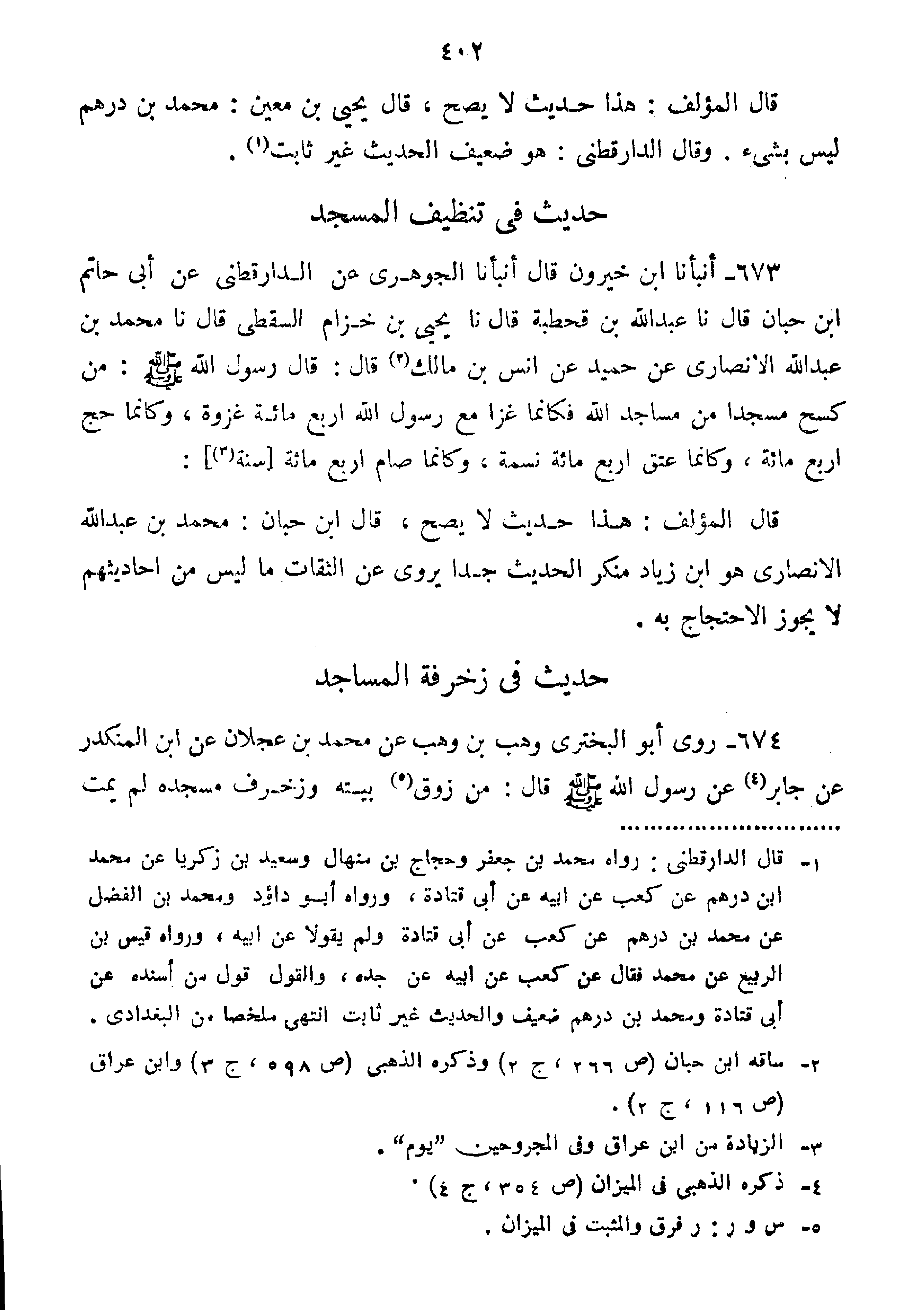 673-أَنْبَأَنَا ابْنُ خَيْرُونَ قَالَ أَنْبَأَنَا الْجَوْهَرِيُّ عن الدارقطني عن أبي حاتم ابن حَبَّانَ قَالَ نا عَبْدُ اللَّهِ بْنُ قَحْطَبَةَ قَالَ نا يَحْيَى بْنُ خِزَامٍ السَّقَطِيُّ قَالَ نا مُحَمَّدُ بْنُ عَبْدِ اللَّهِ الْأَنْصَارِيُّ عَنْ حُمَيْدٍ عَنْ أَنَسِ بْنِ مَالِكٍ قَالَ: قَالَ رَسُولُ اللَّهِ صَلَّى اللَّهُ عَلَيْهِ وَسَلَّمَ:"مَنْ كَسَحَ مَسْجِدًا مِنْ مَسَاجِدِ اللَّهِ فكأنما غزا أربع مائة غزوا، وكأنما أربع مائة، وكأنما عتق أربع مائة نسمة، وكأنما صام أربع مائة سَنَةٍ".