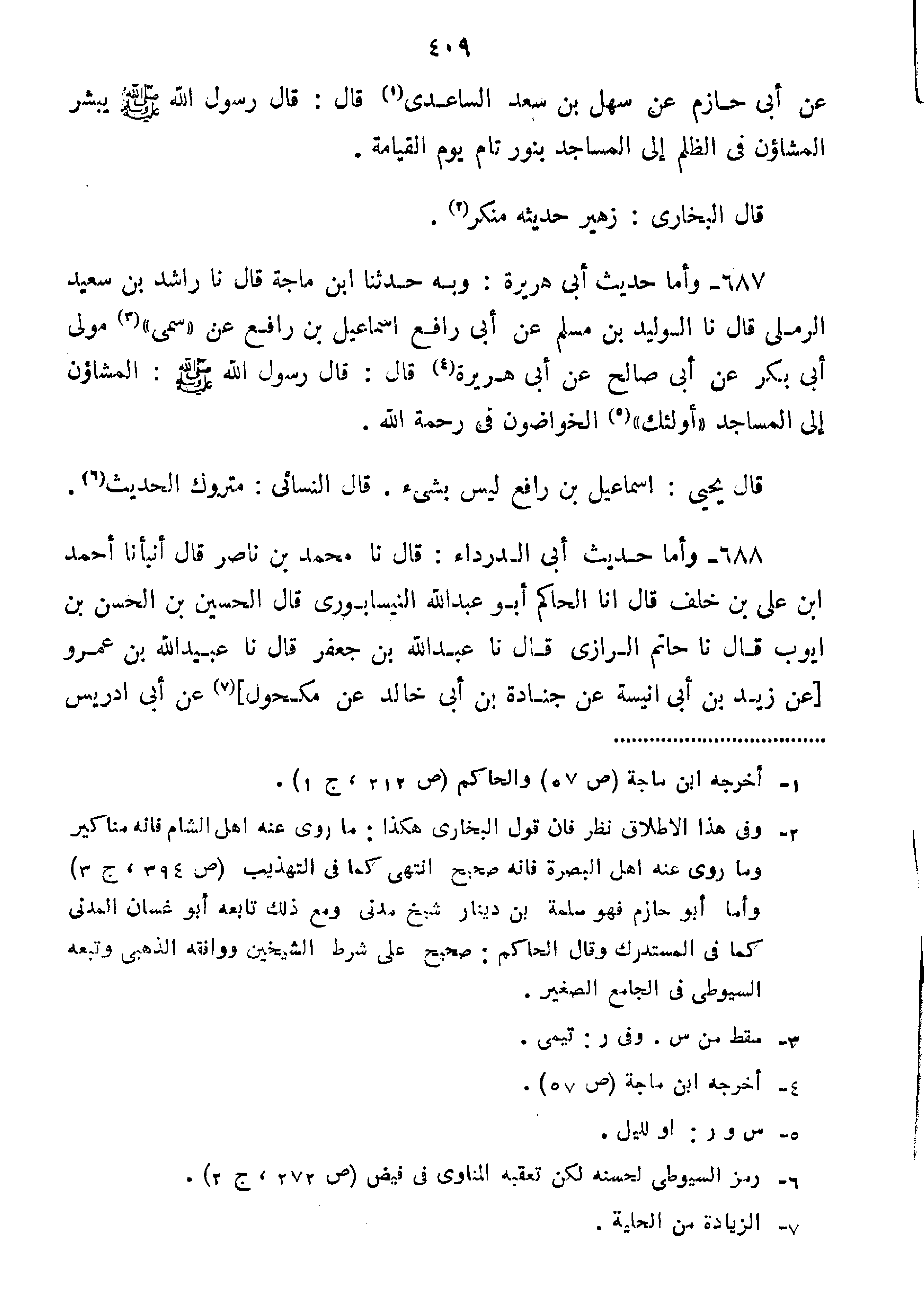687-وَأَمَّا حَدِيثُ أَبِي هُرَيْرَةَ وَبِهِ حَدَّثَنَا ابْنُ مَاجَهْ قَالَ نا رَاشِدُ بْنُ سَعِيدٍ الرَّمْلِيُّ قَالَ نا الْوَلِيدُ بْنُ مُسْلِمٍ عَنْ أَبِي رَافِعٍ إِسْمَاعِيلَ بْنِ رَافِعٍ عَنْ سُمَيٍّ مَوْلَى أَبِي بَكْرٍ عَنْ أَبِي صَالِحٍ عَنْ أَبِي هُرَيْرَةَ قَالَ: قَالَ رَسُولُ اللَّهِ صَلَّى اللَّهُ عليه وسلم:" المشاؤن إِلَى الْمَسَاجِدِ أُوَلئِكَ الْخَوَّاضُونَ فِي رَحْمَةِ اللَّهِ".