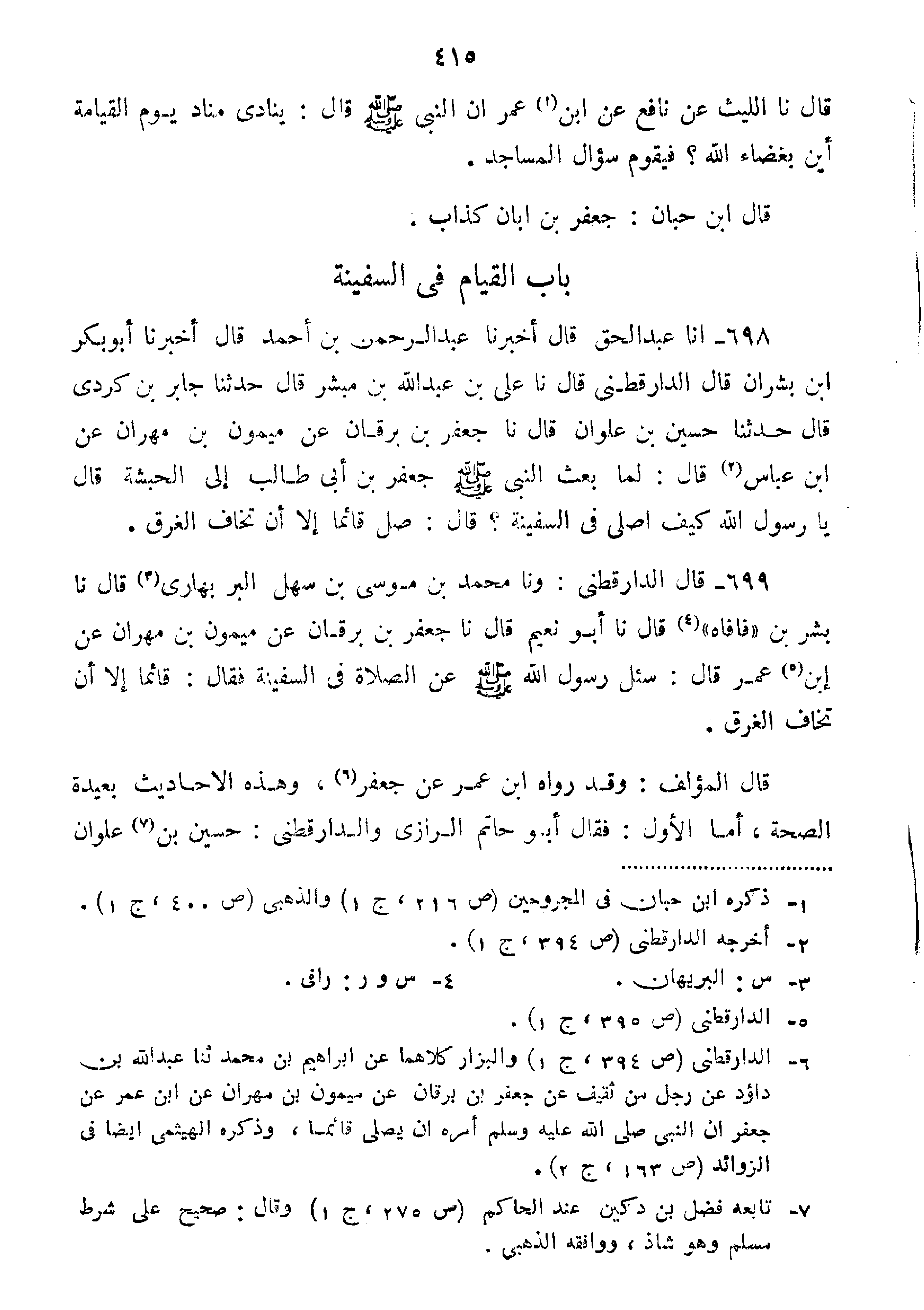 699-.قال الدارقطني: وَنَا مُحَمَّدُ بْنُ مُوسَى بْنِ سَهْلٍ الْبَرْبَهَارِيُّ قَالَ نا بِشْرُ بْنُ فَافَاه قَالَ نا أَبُو نعيم قال أن جَعْفَرُ بْنُ بُرْقَانَ عَنْ مَيْمُونِ بْنِ مَهْرَانَ عَنِ ابْنِ عُمَرَ قَالَ سُئِلَ رَسُولُ اللَّهِ صَلَّى اللَّهُ عَلَيْهِ وَسَلَّمَ عَنِ الصَّلاةِ فَقَالَ قَائِمًا إِلا أَنْ تَخَافَ الْغَرَقَ.