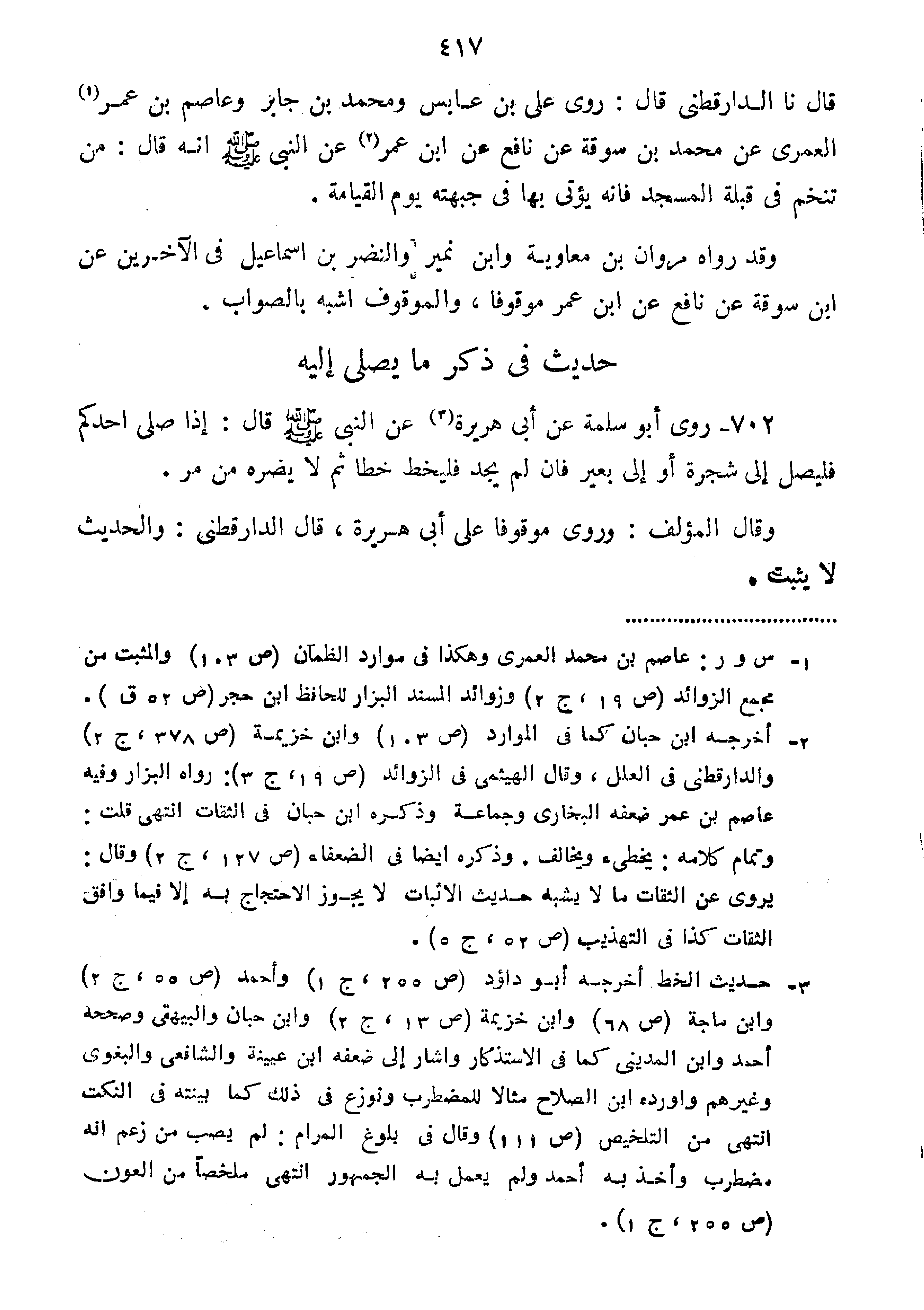 قال نا الدارقطني قَالَ رَوَى عَلِيُّ بْنُ عَابِسٍ وَمُحَمَّدُ بْنُ جَابِرٍ وَعَاصِمُ بْنُ عُمَرَ الْعُمَرِيُّ عَنْ مُحَمَّدِ بْنِ سُوقَةَ عَنْ نَافِعٍ عَنِ ابْنِ عُمَرَ عَنِ النَّبِيِّ صَلَّى اللَّهُ عَلَيْهِ وَسَلَّمَ أَنَّهُ قَالَ:" مَنْ تَنَخَّمَ فِي قِبْلَةِ الْمَسْجِدِ فَإِنَّهُ يُؤْتَي بِهَا فِي جَبْهَتِهِ يَوْمَ الْقِيَامَةِ".