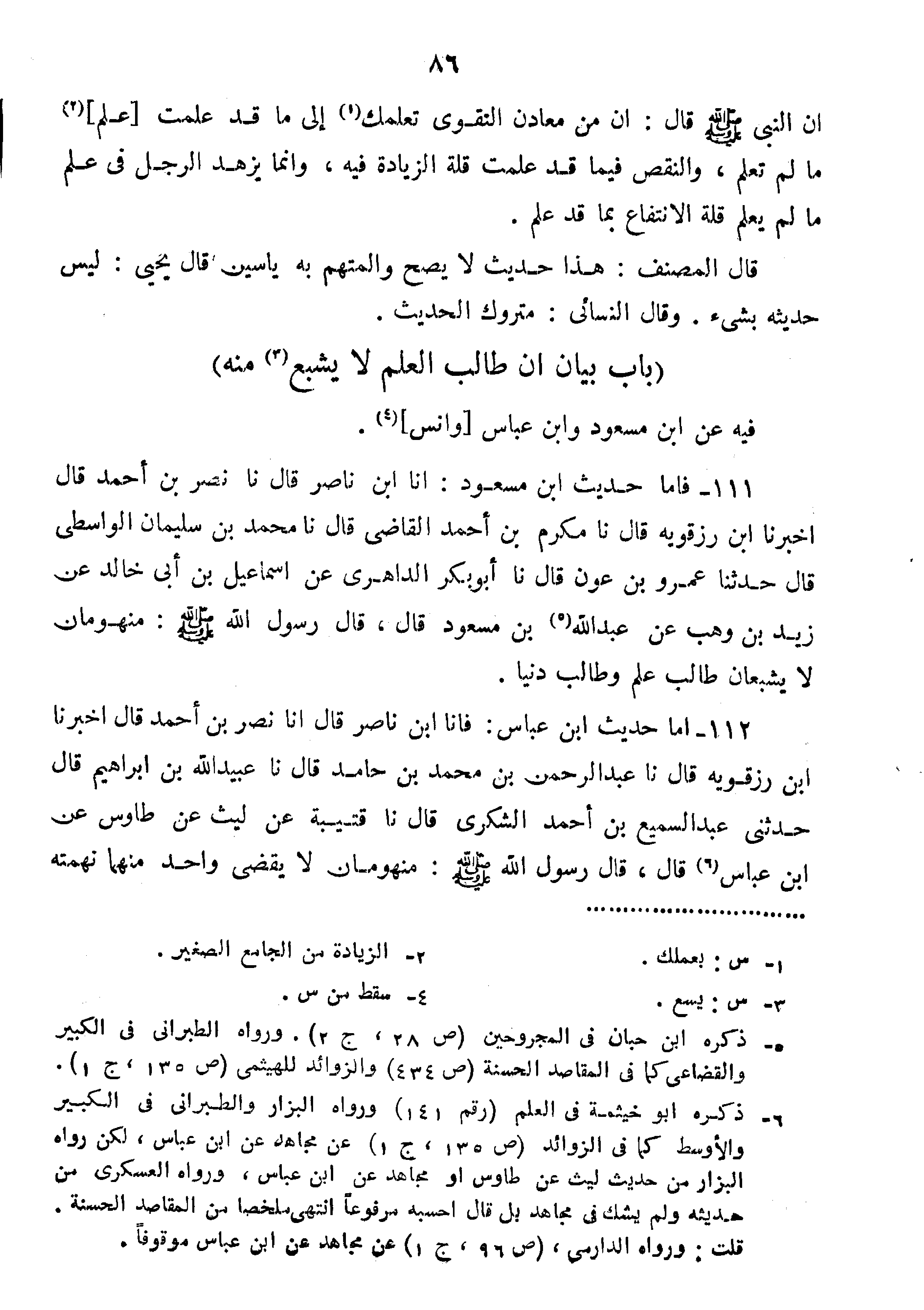 111-فَأَمَّا حَدِيثُ ابن مسعود نا ابْنُ نَاصِرٍ قَالَ نا نَصْرُ بْنُ أَحْمَدَ قَالَ أَخْبَرَنَا ابْنُ رِزْقَوَيْهِ قَالَ نا مَكْرَمُ بْنُ أَحْمَدَ الْقَاضِي قَالَ نا محمد بن سليمان الو اسطي قَالَ حَدَّثَنَا عَمْرُو بْنُ عُونٍ قَالَ نا أَبُو بَكْرٍ الدَّاهِرِيُّ عَنْ إِسْمَاعِيلَ بْنِ أَبِي خَالِدٍ عَنْ زَيْدِ بْنِ وَهْبٍ عَنْ عَبْدِ اللَّهِ بْنِ مَسْعُودٍ قَالَ: قَالَ رَسُولُ اللَّهِ صَلَّى اللَّهُ عَلَيْهِ وَسَلَّمَ:"مَنْهُومَانِ لا يَشْبَعَانِ طَالِبُ عِلْمٍ وَطَالِبُ دُنْيَا".